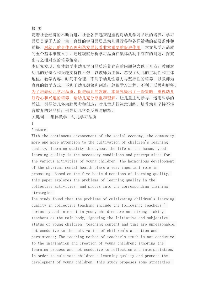 摘要随着社会经济的不断前进,社会各界越来越重视对幼儿学习品质的培养,学习品质贯穿于人的一生,良好的学习品质是幼儿进行各种各样活动的必要条件和前提,对幼儿的身体心理和谐发展起着非常重要的促进作用。本文从学习品质的五个基本维度入手,通过观察分析学习品质在集体活动中存在的问题,探究出与之相对应的培养策略。本研究发现,集体教学中幼儿学习品质培养存在的问题包含以下几点:教师对幼儿的好奇心和兴趣支持性不强:以教师为主体,忽视了幼儿的主动性和主体地位:教学内容、时间不合理,不利于幼儿注意力与坚持性的培养:以教师为真理的教学方式,不利于幼儿想象和创造:忽视学习过程,不利于反思和解释。为了培养幼儿学习品质,促进幼儿的发展,本研究提出了一些策略:重视幼儿好奇心和兴趣的培养:给幼儿充分尊重和理解,让儿童主动参与:运用科学的教法,引导幼儿多动脑思考和创造:对儿童进行注意训练,培养幼儿坚持不轻言放弃的好品质:引导幼儿学会反思与解释。关键词:集体教学;幼儿学习品质IAbstarctWith the continuous advancement of the social economy,the communitymore and more attention to the cultivation of children's learningquality,learning quality throughout the life of the human,goodlearning quality is the necessary conditions and prerequisites forthe various activities of young children,the harmonious developmentof the physical mental health plays a very important role inpromoting.Based on the five basic dimensions of learning quality,this paper explores the problems of learning quality in thecollective activities,and probes into the corresponding trainingstrategies.The study found that the problems of cultivating children's learningquality in collective teaching include the following:Teacherscuriosity and interest in young children are not strong;takingteachers as the main body,ignoring the initiative and subjectivestatus of young children;teaching content and time are unreasonable,not conducive to the cultivation of children's attention andpersistence;The teaching method of teacher's truth is not conduciveto the imagination and creation of young children;ignoring thelearning process and not conducive to reflection and interpretation.In order to cultivate children's learning quality and promote thedevelopment of young children,this study proposes some strategies:attaching importance to the cultivation of children's curiosity andinterest,giving children full respect and understanding,taking theinitiative to participate in the use of scientific teaching methods,guiding young children to think and create more brain,and trainingchildren to insist on the good quality of giving up,and guidingyoung children to reflect and explain.Keywords:collective teaching;learning quality目录摘要IAbstarct II一、绪论1(一)前言1(二)研究的目的及意义11、研究的目的12、研究的意义2(三)核心概念界定21、学习品质22、集体教学2二、集体教学中幼儿学习品质培养的现状3(一)好奇心与兴趣3(二)主动性4(三)注意力与坚持5(四)想象与创造6(五)反思与解释6三、集体教学中幼儿学习品质培养存在的问题?(一)教师支持性不强,不利于幼儿好奇心和兴趣的培养7(二)以教师为主体,忽视了幼儿的主动性和主体地位7(三)教学内容、时间不合理,不利于幼儿注意力与坚持性的培养8(四)以教师为权威的教学方式,不利于幼儿想象力和创造力的培养8(五)忽视幼儿学习过程,不利于幼儿反思和解释9四、集体教学中幼儿学习品质培养的策略9(一)注重幼儿好奇心和兴趣的培养91、充分调动幼儿的好奇心和兴趣92、鼓励幼儿大胆探索10(二)尊重幼儿的主体地位,让幼儿主动参与101、营造和谐、良好的环境,充分发挥教师的主导作用102、用鼓励、表扬、榜样示范等方法提高幼儿主动参与的积极性10(三)运用科学的教学方法,引导幼儿进行思维和主动创造111、培养幼儿的发散思维能力112、培养幼儿的想象力和创造力11(四)开展注意训练,培养幼儿坚持的良好品质111、帮助幼儿明确目标,运用多种感官培养注意力112、进行注意力的训练,帮助幼儿养成良好的习惯113、引导幼儿做事贵在持之以恒,不半途而废12(五)引导幼儿学会反思与解释121、帮助幼儿学会反思和迁移122、鼓励幼儿学会描述和总结12参考文献13谢辞14一、绪论(一)前言2001年《幼儿园教育指导纲要》中指出,幼儿园应因地制宜的实施素质教育,为幼儿一生的发展奠定基础。[0]2012年教育部发布《3~6岁儿童学习与发展指南》明确提出重视幼儿的学习品质,保护幼儿的好奇心和学习兴趣,帮助幼儿逐步养成积极主动、认真专注、不怕困难、敢于探究和尝试、乐于想象和创造等良好学习品质。[「1]]教育部基础教育司组织编写.幼儿园教育指导纲要(试行)解读[M.南京:江苏教育出版社,2002.]中华人民共和国教育部颁布《3-6岁儿童学习与发展指南》.2012.1不少研究者发现,对儿童来说,“学习”不仅是指他们对知识经验的掌握,还包括其智力与能力的发展,更重要的是学习兴趣的形成、良好学习习惯的培养、学习方法与策略的掌握,这是儿童学习能力发展与提高的实质。[2]学习品质对儿童在学校能否取得成功尤其重要,因为,“获得单纯的知识和技能是不够的,拥有某种才能并不意味着这种才能能够发挥作用,儿童必须能够整合这些技能和知识,如果没有孩子的主动性作支撑,这些技能对儿童的发展都是徒劳的”。[[3]John M.Love.Instrumentation for State ReadinessAssessment:Issues in Measuring Children's EarlyDevelopment andLearning.Princeton,NJ