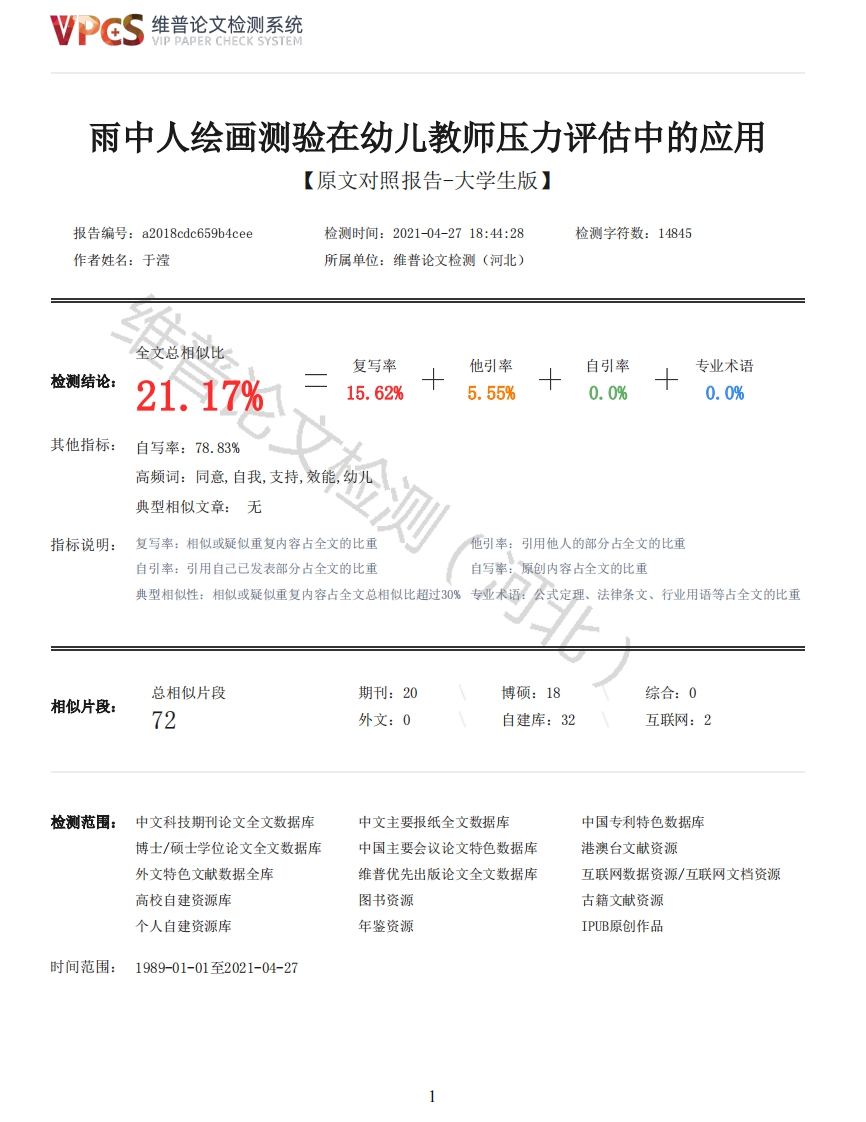 维普论文检测系统/IP PAPER CHECK SYSTEM雨中人绘画测验在幼儿教师压力评估中的应用【原文对照报告-大学生版】报告编号:a2018cdc659b4cee检测时间:2021-04-2718:44:28检测字符数:14845作者姓名:于滢所属单位:维普论文检测(河北)全文总相似比复写率他引率自引率专业术语检测结论:21.17%15.62%5.55%0.0%0.0%其他指标:自写率:78.83%高频词:同意,自我,支持,效能,幼儿典型相似文章:无指标说明:复写率:相似或疑似重复内容占全文的比重他引率:引用他人的部分占全文的比重自引率:引用自己已发表部分占全文的比重自写率:原创内容占全文的比重典型相似性:相似或疑似重复内容占全文总相似比超过30%专亚术语:公式定理、法律条文、行业用语等占全文的比重总相似片段期刊:20博硕:18综合:0相似片段:72外文:0自建库:32互联网:2检测范围:中文科技期刊论文全文数据库中文主要报纸全文数据库中国专利特色数据库博士/硕士学位论文全文数据库中国主要会议论文特色数据库港澳台文献资源外文特色文献数据全库维普优先出版论文全文数据库互联网数据资源/互联网文档资源高校自建资源库图书资源古籍文献资源个人自建资源库年鉴资源IPUB原创作品时间范围:1989-01-01至2021-04-27维普论文检测系统VIP PAPER CHECK SYSTEM原文对照颜色标注说明:■自写片段■复写片段(相似或疑似重复)口引用片段(引用)■专业术语(公式定理、法律条文、行业用语等)1923学士学位论文雨中人绘画测验在幼儿教师压力评估中的应用一一结合自我效能感的研究姓名于滢学号201741329126院系教育学院专业应用心理学指导教师赵章留年月日学位论文原创性声明本人所提交的学位论文雨中人绘画测验在幼儿教师压力评估中的应用,是在导师的指导下,独立进行研究工作所取得的原创性成果。除文中已经注明引用的内容外,本论文不包含任何其他个人或集体已经发表或撰写过的研究成果。对本文的研究做出重要贡献的个人和集体,均已在文中标明。本声明的法律后果由本人承担。论文作者(签名):指导教师确认(签名):年月日年月日学位论文版权使用授权书本学位论文作者完全了解河北师范大学有权保留并向国家有关部门或机构送交学位论文的复印件和磁盘,允许论文被查阅和借阅。本人授权河北师范大学可以将学位论文的全部或部分内容编入有关数据库进行检索,可以采用影印、缩印或其它复制手段保存、汇编学位论文。保密的学位论文在年解密后适用本授权书。论文作者(签名):指导教师(签名):年月日年月日摘要通过对幼儿教师的“雨中人”绘画测验的绘画特征进行分析,将幼儿教师的绘画特征与领悟社会支持和自我效能感相结合,为幼儿教师的压力评估和日后工作提供帮助。研究结果显示:(1)幼儿教师的压力较大,较为缺乏应2维普论文检测系统VIP PAPER CHECK SYSTEM对意识、应对效果相对较差。(2)幼儿教师自我效能和领悟社会支持存在正相关关系(3)幼儿教师年龄越大自我效能感越好。(4)防护物的形状与自我效能感呈负相关:雨中人物长度和宽度与领悟社会支持呈现正相关(5)本研究发现雨中人测验在评估幼儿教师压力工作中有一定实际应用价值。关键词:“雨中人”绘画投射测验:幼儿教师:领悟社会支持:自我效能感ABSTRACTBy discussing the painting characteristics of the "people in the rain"painting projection testof kindergarten teacher,comparing the painting characteristics of kindergarten teacher with theunderstanding of social support and self-efficacy,so as to provide the basis for kindergartenteachers'stress assessment and access to consultation letters.The results show that:(1)kindergarten teacher are under great pressure,lack of coping awareness,poor coping effect .(2)Thereis a positive correlation between kindergarten teachers'self-efficacy and perceived social support.(3)The older kindergarten teachers are,the better their self-efficacy.(4)The shape of the shield wasnegatively correlated with self-efficacy;The height and width of people in the rain were positivelycorrelated with perceived social support.(5)This study found that the test of people in the rain hada certain practical value in the evaluation of kindergarten teachers'stressful work.Keywords:"People in the Rain"Painting Projection Test:Kindergarten teacher:Understanding SocialSupport;Self-Efficacy目录摘要IIIAbstractIV1引言61.1“雨中人”绘画测验的现状研究61.2幼儿教师压力状况的研究71.3领悟社会支持和自我效能感的研究及与压力的关系71.4本研究的研究内容82研究方法82.1研究对象82.2研究工具82.2.1“雨中人”绘画测验82.2.2问卷调查162.2.3统计分析法162.3研究程序173研究结果173.1雨中人绘画测验量化研究结果173.1.1评分者一致性信度163.1.2雨中人绘画指标统计193.2领悟社会支持和自我效能感的研究结果213.2.1幼儿教师自我效能感和领悟社会支持的学历差异213.2.2幼儿教师自我效能感和领悟社会支持的年龄差异213.2.3幼儿教师自我效能感和领悟社会支持的关系213.3“雨中人”绘画测验与自我效能感的研究结果223.3.1防护物与自我效能感的关系223.3.2雨与自我效能感的关系223.3.3人物与自我效能感的关系223.4“雨中人”绘画测验与领悟社会支持的研究结果233.4.1防护物与领悟社会支持的关系233.4.2雨与领悟社会支持的关系233
