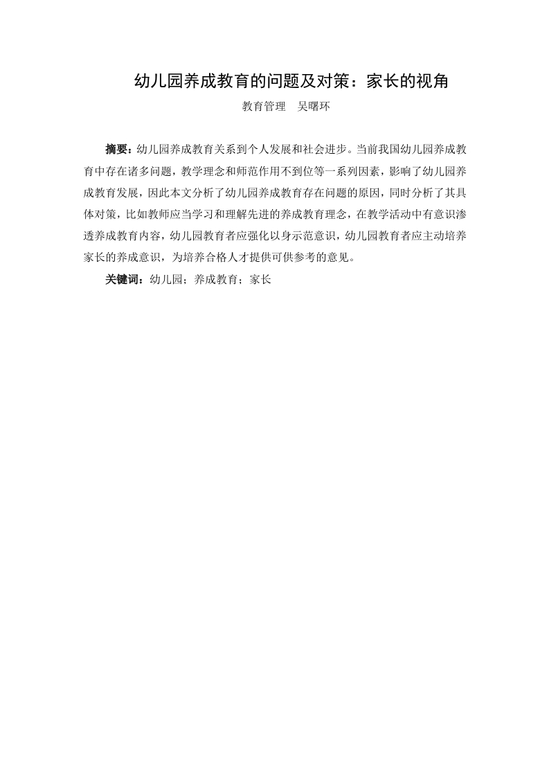 幼儿园养成教育的问题及对策:家长的视角教育管理吴曙环摘要:幼儿园养成教育关系到个人发展和社会进步。当前我国幼儿园养成教育中存在诸多问题,教学理念和师范作用不到位等一系列因素,影响了幼儿园养成教育发展,因此本文分析了幼儿园养成教育存在问题的原因,同时分析了其具体对策,比如教师应当学习和理解先进的养成教育理念,在教学活动中有意识渗透养成教育内容,幼儿园教育者应强化以身示范意识,幼儿园教育者应主动培养家长的养成意识,为培养合格人才提供可供参考的意见。关键词:幼儿园:养成教育:家长develop education of the Kindergarten andCountermeasures:the perspective of parentsAbstract:the develop education of the Kindergarten is related to personaldevelopment and social progress.There are many problems in our nursery to developeducation.The teaching philosophy,and teacher role is not in place affects the nurseryto develop educational development,this paper analyzes the develop education of theKindergarten problems,analysis of the specific measures such that teachers shouldlearn and understand advanced develop educational philosophy,awarenesspenetration in the teaching activities to develop the content of education.thekindergarten education should strengthen to the consciousness of itself demonstration,kindergarten education should take the initiative to train parents to cultivateawareness,to cultivate qualified personnel provided for reference views.Keywords:kindergarten;develop education;parents目录第一节问题提出.1第二节核心概念界定…第三节研究目的和意义.2第四节文献综述.第五节研究思路和方法第二章幼儿养成教育的理论概述.5第一节陈鹤琴关于幼儿养成教育的理论.5第二节陶行知关于幼儿养成教育的理论.6第三节蒙台梭利关于幼儿养成教育的理论…6第四节马卡连柯关于幼儿养成教育的理论..7第三章幼儿园养成教育的现状与问题…第一节幼儿园养成教育的基本构成.7第二节幼儿园养成教育的现状…第三节幼儿园养成教育存在的问题第四章幼儿园养成教育问题的原因分析9第一节教育理念与培养目标.9第二节课堂教学活动.…10第三节幼儿园文化…10第四节教师的素养.10第五节评价指标体系…10第一节学习和理解先进的养成教育理念11第二节教学活动中有意识渗透养成教育内容11第三节幼儿园教育者应强化以身示范意识第四节幼儿园教育者应主动培养家长的养成意识.12参考书籍14.15
