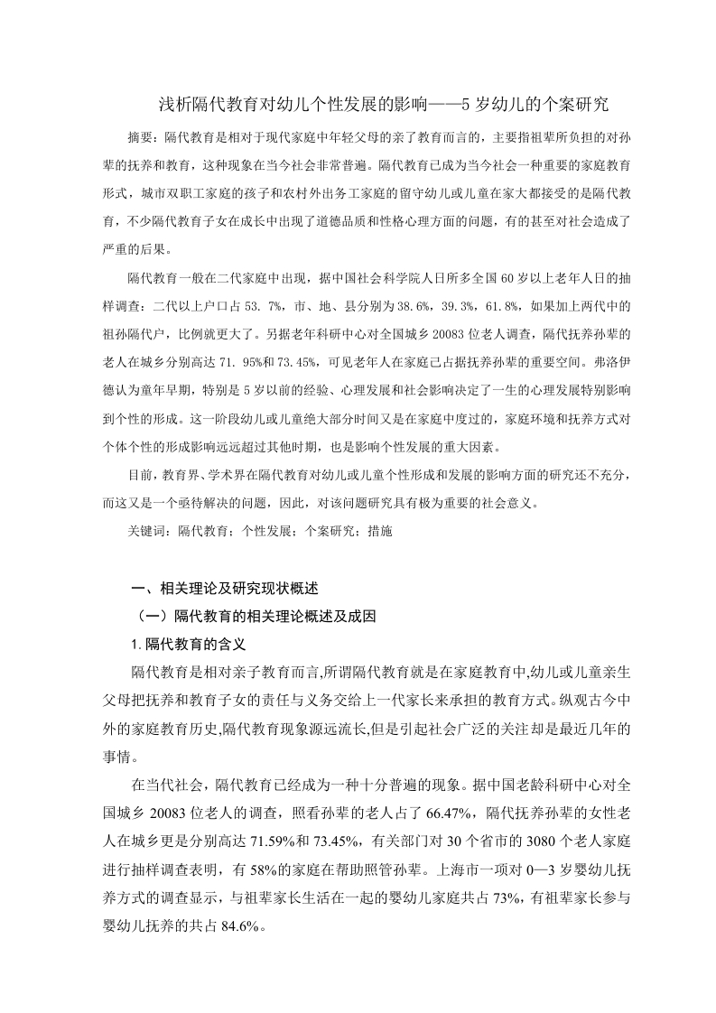 浅析隔代教育对幼儿个性发展的影响一一5岁幼儿的个案研究摘要:隔代教育是相对于现代家庭中年轻父母的亲了教育而言的,主要指祖辈所负担的对孙辈的抚养和教育,这种现象在当今社会非常普遍。隔代教育已成为当今社会一种重要的家庭教育形式,城市双职工家庭的孩子和农村外出务工家庭的留守幼儿或儿童在家大都接受的是隔代教育,不少隔代教育子女在成长中出现了道德品质和性格心理方面的问题,有的甚至对社会造成了严重的后果。隔代教育一般在二代家庭中出现,据中国社会科学院人日所多全国60岁以上老年人日的抽样调查:二代以上户口占53.7%,市、地、县分别为38.6%,39.3%,61.8%,如果加上两代中的祖孙隔代户,比例就更大了。另据老年科研中心对全国城乡20083位老人调查,隔代抚养孙辈的老人在城乡分别高达71.95%和73.45%,可见老年人在家庭己占据抚养孙辈的重要空间。弗洛伊德认为童年早期,特别是5岁以前的经验、心理发展和社会影响决定了一生的心理发展特别影响到个性的形成。这一阶段幼儿或儿童绝大部分时间又是在家庭中度过的,家庭环境和抚养方式对个体个性的形成影响远远超过其他时期,也是影响个性发展的重大因素。目前,教育界、学术界在隔代教育对幼儿或儿童个性形成和发展的影响方面的研究还不充分,而这又是一个亟待解决的问题,因此,对该问题研究具有极为重要的社会意义。关键词:隔代教育:个性发展:个案研究:措施一、相关理论及研究现状概述(一)隔代教育的相关理论概述及成因1.隔代教育的含义隔代教育是相对亲子教育而言,所谓隔代教育就是在家庭教育中,幼儿或儿童亲生父母把抚养和教育子女的责任与义务交给上一代家长来承担的教育方式。纵观古今中外的家庭教育历史,隔代教育现象源远流长,但是引起社会广泛的关注却是最近几年的事情。在当代社会,隔代教育已经成为一种十分普遍的现象。据中国老龄科研中心对全国城乡20083位老人的调查,照看孙辈的老人占了66.47%,隔代抚养孙辈的女性老人在城乡更是分别高达71.59%和73.45%,有关部门对30个省市的3080个老人家庭进行抽样调查表明,有58%的家庭在帮助照管孙辈。上海市一项对0一3岁婴幼儿抚养方式的调查显示,与祖辈家长生活在一起的婴幼儿家庭共占73%,有祖辈家长参与婴幼儿抚养的共占84.6%。2.隔代教育产生的原因隔代教育古已有之,在多代同堂的大家庭中更是司空见惯。但在以核心家庭为主流的当代社会里,隔代教育却再度勃兴,这绝非偶然,应该说,它既是世纪交替期间社会深刻变革的必然结果,也是人们各种复杂思想观念冲突激荡的当然产物。究其原因,主要包括以下几个方面。(1)根深蒂固的家庭伦理观念,奠定了隔代教育的历史渊源。长期的宗法制社会,形成了我国民众浓厚而独特的家庭伦理思想。所谓“含饴弄孙”,不仅是祖辈追求的理想境界,更是他们肩负的自觉责任。(2)年轻父母育儿观念发生了重大的变化,他们不再甘愿为儿女做牛马,就此形成了隔代教育的思想基础。当今社会,自我意识、主体观念、个性精神的发展和弘扬,使不少人意识到:他们首先是自己,其次才是父母:子女不仅是他们的儿女,更是子女自己,是社会的未来成员。由此,一旦俯首甘为马牛的心态消退,利用祖辈力量来解脱自己,就成为许多年轻父母的强烈愿望。(3)逐渐加快的生活节奏,让在职场打拼的年轻父母对隔代教育有着紧迫的需求。现代社会日趋剧烈的残酷竞争,迫使年轻父母在“教育一职业一教育”间不断地循环往复。紧张的学习、繁杂的工作等诸多压力,客观上使一些年轻父母无暇他顾。在子女教育上求助祖辈,就成为他们现实的选择。(4)第一代独生子女成为父母,加快了隔代教育的兴盛。长期的强制性计划生育政策,已经造成了大量的独生子女父母。被视为“抱大的一代”的他们,虽然与非独生子女在许多方面并无太大差异,但在养儿育女上更加不知所措,则是严峻的现实。(5)城镇社会转型导致的失业大军,成为隔代教育加剧的助推剂。深入改革带来的社会转型,使工业企业的失业人员急剧增加。他们的生活水平骤然下降,再加上社会保障不够有力,他们在抚养、教育子女方面产生许多难以克服的困难。无可奈何之下,祖辈往往被迫成为孙辈抚育的避风港。此外,日益壮大的农村留守部落,对隔代教育的蔓延起了推波助澜的作用。与城市中日渐普遍的因子女长大离家而形成的“空巢”家庭不同,农村家庭的“空心化”主要表现为年轻父母外出打工而留下老人、孩子成为留守部落,正缘于此,在广大农村,隔代教育已经成为一种相当普遍的现象(二)个性发展的理论概述及其影响因素1.个性发展的理论概述个性是指一个人整个的精神面貌,即具有一定倾向性的心理特征的总和。无论东方西方在不同的历史时期,许多人都相信:早期的生活经验对个体的个性发展有深远的影响。下面将结合西方主要的个性发展理论,个性形成和发展的影响因素,以及我国隔代教育现象的研究现状进行分析阐述。(1)精神分析学派的个性理论奥地利精神病学家弗洛伊德在大量临床研究的基础上创立了精神分析理论。弗洛伊德的个性理论中提出个性的结构包括伊底、自我、超我二大部分。伊底是最原始的,与生俱来的潜意识部分,其中贮藏着人性中最接近兽性的一些本能冲动,按照快乐原则,一味追求