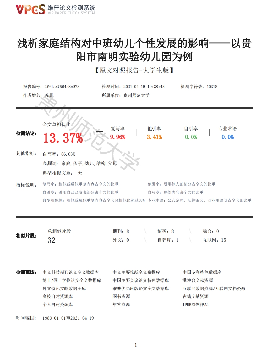 维普论文检测系统VIP PAPER CHECK SYSTEM浅析家庭结构对中班幼儿个性发展的影响一一以贵阳市南明实验幼儿园为例【原文对照报告-大学生版】报告编号:2ff1ac7564c8e973检测时间:2021-04-1910:38:43检测字符数:10318作者姓名:苏晨所属单位:贵州师范大学全文总相似比复写率他引率自引率专业术语检测结论:13.37%9.96%3.41%0.0%0.0%其他指标:自写率:86.63%高频词:家庭,孩子,幼儿,结构,父母典型相似文章:无指标说明:复写率:相似或疑似重复内容占全文的比重他引率:引用他人的部分占全文的比重自引率:引用自己已发表部分占全文的比重自写率:原创内容占全文的比重典型相似性:相似或疑似重复内容占全文总相似比超过30%专业术语:公式定理、法律条文、行业用语等占全文的比重总相似片段期刊:8博硕:8综合:0相似片段:32外文:0自建库:1互联网:15检测范围:中文科技期刊论文全文数据库中文主要报纸全文数据库中国专利特色数据库博士/硕士学位论文全文数据库中国主要会议论文特色数据库港澳台文献资源外文特色文献数据全库维普优先出版论文全文数据库互联网数据资源/互联网文档资源高校自建资源库图书资源古籍文献资源个人自建资源库年鉴资源IPUB原创作品时间范围:1989-01-01至2021-04-19维普论文检测系统VIP PAPER CHECK SYSTEM原文对照颜色标注说明:■自写片段■复写片段(相似或疑似重复)口引用片段(引用)■专业术语(公式定理、法律条文、行业用语等)院内论文代码:A1040106学号:1720030701099贵州师范大学求是学院本科毕业论文题目:浅析家庭结构对中班幼儿个性发展的影响一一以贵阳市南明实验幼儿园为例系别:学前教育专业:社会科学系年级:2017级姓名:苏晨指导教师:王雅洁(讲师)完成时间:2021年4月6日目录一、前言1(一)研究的背景1(二)研究的意义1(三)研究的方法2(四)研究的目的与对象2(五)概念界定与家庭类型2二、家庭结构对中班幼儿个性发展的正面影响3(一)核心家庭3(二)主干家庭3(三)联合家庭4(四)残缺家庭4(三)家庭结构对中班幼儿个性发展的现状调查结果与分析5(一)家庭结构模式的差异5(二)幼儿的教养方式差异5(三)幼儿与父母之间的关系亲密差异6四、家庭结构对中班幼儿个性发展影响中存在的问题6(一)核心家庭对幼儿个性发展的不利影响6(二)主干家庭对幼儿个性发展的不利影响6(三)联合家庭对幼儿个性发展的不利影响72维普论文检测系统VIP PAPER CHECK SYSTEM(四)残缺家庭对幼儿个性发展的不利影响7五、家庭结构模式对幼儿个性发展影响的改善策略8(一)针对核心家庭的改善策略8(二)针对主干家庭的改善策略8(三)针对联合家庭的改善策略9(四)针对残缺家庭的改善策略9六、总结9参考文献10附录11诚信声明12致谢12浅析家庭结构对中班幼儿个性发展的影响一一以贵阳市南明实验幼儿园为例苏晨摘要:幼儿个性问题是家庭、社会、学校及个人的生活经历等多种条件综合作用的结果,其中,家庭结构起到了非常重要的影响,是一种多因素、多方面的复杂变化来实现的。家庭结构正常的家庭,幼儿个性正常健康成长,而家庭结构有缺陷的家庭,幼儿的个性培养会受到阻碍。[1]家庭结构影响着家庭的所有功能,有结构缺陷的家庭没有办法完全实现家庭的功能,导致家庭成员之间产生缺乏功能、沟通不畅等各种情况,使幼儿缺乏家庭的关爱,从而影响幼儿个性的培养甚至造成负面影响。,本文通过对我国几种主要家庭结构模式进行全面分析,对此提出对影响幼儿个性的家庭结构的良好的建议和策略。关键词:家庭结构:中班幼儿:个性发展;影响Abstract:Children's personality problems are the result of a variety of conditions such asfamily,society,school and personal life experience.Among them,family structure plays a veryimportant role,which is a kind of multi-factor,multi-faceted complex change to achieve.In afamily with a normal family structure,children's personality grows normally and healthily,while ina family with a defective family structure,children's personality cultivation will be hindered.Family structure affects all functions of the family.Families with structural defects cannot fullyrealize the functions of the family,resulting in a lack of function between family members,poorcommunication and other situations,so that children lack of family care,thus affecting thecultivation of children's personality and even causing negative effects.Through a comprehensiveanalysis of several main family structure models in China,this paper puts forward some goodsuggestions and strategies to affect the family structure of children's personality.Key words:family structure;children;personality development;influence一、前言(一)研究的背景幼儿成长问题是社会、家庭、学校三个方面共同影响的,其中家庭环境中的家庭结构对幼儿的个性培养起到了非常重要的影响。家庭结构是指家庭成员相互作用、相互影响的状态。完整的家庭结构对幼儿的个性发展是很好的影响,近些年来,一些关于离婚的案件与幼儿个性研究来说,父母感情的破裂,给幼儿带来了过分紧张不安的生活。幼儿缺失温暖和陪伴,致使他们朝着不良的方向发展。所以,动员各方面的力量一起来稳定家庭结构,对于下一代幼儿的个性发展有重要意义。幼儿成长问题是社会、家庭、学校三个方面共同影响的,其中家庭环境中的家庭结构对幼儿的个性培养起到了非常重要的影响。家庭结构是指家庭成员相互作用、相互影响的状态。完整的家庭结构对幼儿的个性发展是很好的