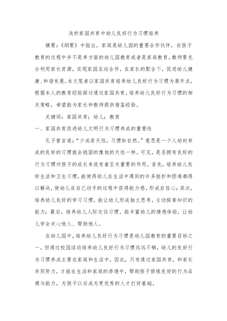 浅析家园共育中幼儿良好行为习惯培养摘要:《纲要》中指出,家庭是幼儿园的重要合作伙伴,在孩子教育的过程中并不是单方面的幼儿园教育或者是家庭教育,教师要充分利用家长资源,实现家园互动合作,在家长的配合下,促进幼儿健康、和谐发展。本文笔者以家园共育培养幼儿良好行为习惯为展开点,根据本人的教育经验探讨通过家园共育,培养幼儿良好行为习惯的相关策略,希望能为家长和教师提供借鉴经验。关键词:家园共育;幼儿;教育一、家园共育促进幼儿文明行为习惯养成的重要性孔子曾言道:“少成若天性,习惯如自然。”意思是一个人幼时养成的良好的习惯就会稳固的像他的天性一样。可见,是否拥有良好的行为习惯对孩子的成长来说有着至关重要的作用。首先,培养幼儿良好生活和卫生习惯,能使得幼儿在生活中遇到的许多挫折和困难都得以解决,使幼儿在自己动手的过程中获得能力感,形成自信心;其次,培养幼儿良好的学习习惯,能让幼儿形成独立思考,主动探索知识的能力;最后,培养幼儿人际交往习惯,能丰富幼儿的情感体验,让幼儿学会关心他人、帮助他人。在幼儿园中,培养幼儿良好行为习惯是幼儿园教育的重要目标之一,但通过校园活动培养幼儿良好行为习惯远远不够,幼儿的良好行为习惯养成主要在家庭和生活中,因此,只有通过家园共育,和家长共同努力,才能在生活和家庭的渗透中,帮助孩子修炼良好的行为品德与能力,为孩子以后成为更优秀的人才打好基础。二、家园共育促进幼儿文明行为习惯养成的现状1.家长不够重视随着经济的发展和生活水平的提高,越来越多的家长将重心放在孩子身上,幼儿也成为了家长手中的掌上明珠,在日常生活中,大部分家长处于宠爱心理,一手包办孩子生活上的一切。俗话说:“没有规矩,不成方圆。”家长不加以规矩约束幼儿的行为,培养幼儿良好行为习惯意识,无论是在生活上、学习上、习惯上,都会对幼儿产生影响,例如在我的教学经验里,到了大班下学期,还有孩子需要家长帮忙喂饭,穿衣服,收拾书包等。出现这种情况的原因,是因为家长对培养幼儿良好行为习惯的重要性认识不足,错误的认为,孩子的习惯差只是因为孩子年龄还小,空想着孩子长大后便会自己学会;或者认为幼儿良好习惯培养主要来源家庭教育,和学校教育关系不大,但当家长和教师进行沟通,了解了正确的育儿方式后,家长便能通过家园共育,有效的帮助孩子良好行为习惯的形成。可见,家长的忽视是导致幼儿园对幼儿良好行为培养始终不见成效的重要原因之一。2.教师专业能力不够幼儿教师作为孩子教育的引导者,因为专业能力不够在家园共育中也会出现许多问题,第一,部分在岗的年轻教师在上岗后缺乏教育经验,与家长沟通时略显青涩,不能抓住话语的重点,不能用学术的权威性让家长信服。第二,教师只认识自己在教育中的指导作用,在和家长传授教育经验时,单方面的把家长当成听众,只顾着给家长传授知识,不给家长思考的时间,家长便不能发表自己的看法,这便会影响到家长在家园共育中的主动性和积极性。3.双方教育观念不同家园共育得以顺利开展的前提是双方的教育方法能达成一致,然而家长和教师对幼儿的关注点却各有不同,相对孩子的良好习惯的培养,家长更关注孩子的成绩和智力开发,而教师更关心孩子的全面发展。因为双方的侧重点不同,家园在交流培养孩子良好习惯时,交流内容大多停留在表面,家长在与教师沟通时,更喜欢深层次的讨论孩子的学习情况和健康问题,这不仅不能让培养孩子习惯问题得到解决,也不利于家园共育活动的顺利开展,教师也无法充分利用家长资源达到教育目的。三、家园共育促进幼儿文明行为习惯养成的策略研究(一)生活习惯养成能否养成良好的生活习惯是帮助学生学会独自成长的关键。一旦养成良好的生活习惯,对孩子来说能够受益终生,他们在自己动手的过程中,能够获得能力感,在完成任务后受到大人的表扬,会形成强大的自信心。但当前许多孩子在家中受着“小皇帝”“小公主”的待