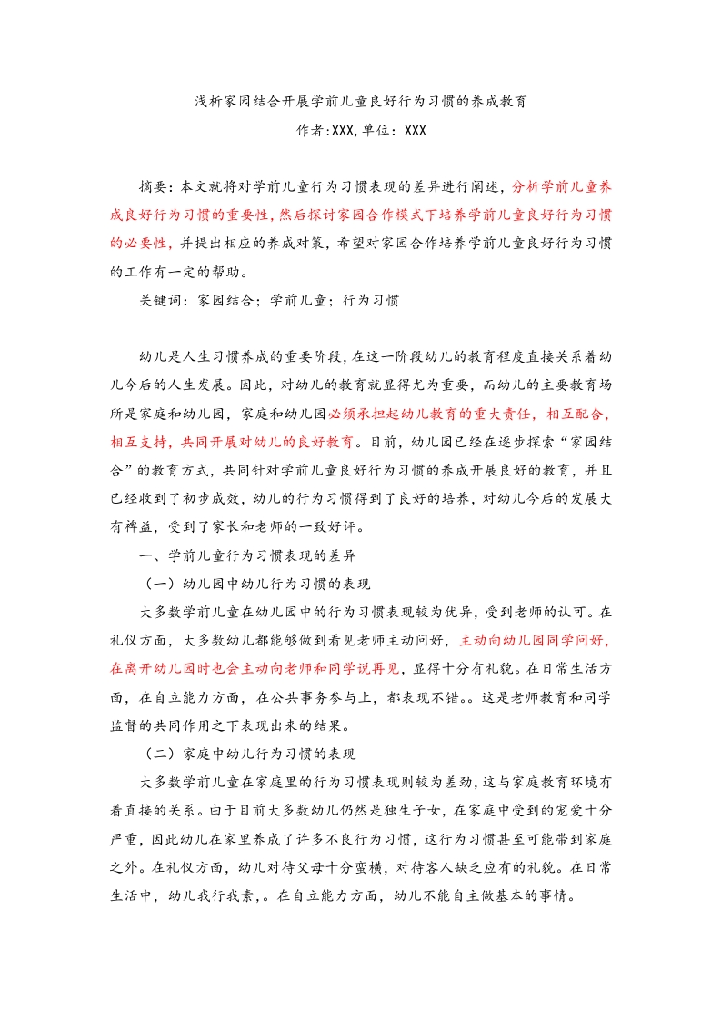 浅析家园结合开展学前儿童良好行为习惯的养成教育作者:XXX,单位:XXX摘要:本文就将对学前儿童行为习惯表现的差异进行阐述,分析学前儿童养成良好行为习惯的重要性,然后探讨家园合作模式下培养学前儿童良好行为习惯的必要性,并提出相应的养成对策,希望对家园合作培养学前儿童良好行为习惯的工作有一定的帮助。关键词:家园结合;学前儿童;行为习惯幼儿是人生习惯养成的重要阶段,在这一阶段幼儿的教育程废直接关系着幼儿今后的人生发展。因此,对幼儿的教育就显得尤为重要,而幼儿的主要教育场所是家庭和幼儿园,家庭和幼儿园必须承担起幼儿教育的重大责任,相互配合,相互支持,共同开展对幼儿的良好教育。目前,幼儿园已经在逐步探索“家园结合”的教育方式,共同针对学前儿童良好行为习惯的养成开展良好的教育,并且已经收到了初步成效,幼儿的行为习惯得到了良好的培养,对幼儿今后的发展大有裨益,受到了家长和老师的一致好评。一、学前儿童行为习惯表现的差异(一)幼儿园中幼儿行为习惯的表现大多数学前儿童在幼儿园中的行为习惯表现较为优异,受到老师的认可。在礼仪方面,大多数幼儿都能够做到看见老师主动问好,主动向幼儿园同学问好,在离开幼儿园时也会主动向老师和同学说再见,显得十分有礼貌。在日常生活方面,在自立能力方面,在公共事务参与上,都表现不错。。这是老师教育和同学监督的共同作用之下表现出来的结果。(二)家庭中幼儿行为习惯的表现大多数学前儿童在家庭里的行为习惯表现则较为差劲,这与家庭教育环境有着直接的关系。由于目前大多数幼儿仍然是独生子女,在家庭中受到的宠爱十分严重,因此幼儿在家里养成了许多不良行为习惯,这行为习惯甚至可能带到家庭之外。在礼仪方面,幼儿对待父母十分蛮横,对待客人缺乏应有的礼貌。在日常生活中,幼儿我行我素,。在自立能力方面,幼儿不能自主做基本的事情。二、学前儿童形成良好行为习惯的重要性和必要性(一)重要性良好的行为习惯往往能伴随人的一生,在幼儿时期就已经形成了良好的行为习惯,那么意味着将来的个人素质也能够保证在一个较高的水平。如果一个人从小就受到了良好的教育,并且在德、智、体、美、劳各个方面都表现得异常优秀,一般来说,这个人长大以后也会具有良好的综合素质。个人素质是全民素质的基础,如果每个人都注重提高个人的综合素质,那么全民素质也将随之提高,凡事积少成多,从小做起,要发展全民素质就要必须从幼儿教育开始抓起。(二)必要性良好的行为习惯能够促进幼儿智力、综合素质的全面发展,也是培养孩子各方面能力的关键。有些家长也许不太重视行为习惯的养成,但仔细看来如果孩子在幼儿期没有养成良好的文明礼貌习惯,这将影响幼儿以后的正常社会交往。例如,幼儿生活习惯不好,将直接影响幼儿身体的健康发展水平。若是运动习惯不好,在日常活动锻炼中就可能引发重大安全事故。若是幼儿学习习惯不好,就会导致其上课注意力不集中,降低了课堂学习的效率。因此,培养良好的行为习惯,将会解决生活学习中的诸多问题。反之,没有养成良好的行为习惯,将会影响幼儿在今后的学习生活。由此可见,良好的行为习惯养成是极为必要的。三、家园合作培养学前儿童良好行为习惯的对策(一)家园合作培养学前儿童良好行为习惯的途径1、提高教师素质,提升家长参与度和主动性家长和教师是不同场所内幼儿良好行为习惯养成主要责任人,两者有着共同的目标,有着良好的合作基础。但由于教师和家长所处立场、角度的不同,常容易因为教育幼儿的方式方法的不同而产生不必要的矛盾,导致教师与家长之间的合作受阻。这种矛盾对于家园合作共同开展学前儿童良好行为习惯的养成教育是十分不利的,这就要求教师和家长之间必须建立良好的交流合作方式。而幼儿园作为教育的主要场所,教师要主动积极承担起联系家长,和家长建立良好沟通的责任。教师要从以下方面提高自身素质,提升家长参与度和主动性。2、提升活动吸引力,促进家长育儿能力的提升幼儿园在举办亲子活动时,要仔细做好该活动的策划工作,多筹划具有特色的亲子活动,提升幼儿园亲子活动对家长的吸引力,便于教师与家长更好地进行沟通合作。幼儿园在策划亲子活动时,还要充分听取幼儿家长的相关意见,对于幼儿家长提出的意见进行仔细研究,认真考虑,对于好的建议给予积极接纳,对于欠妥的意见进行耐心解释,让家长对幼儿园产生充分的信任感。(二)家园合作培养学前儿童良好行为习惯的方式1、建立家园合作联系表家园合作联系表是家园合作的重要体现形式,幼儿园要根据幼儿情况建立家园合作表,在表中明确规定教师和家长所需要监督幼儿完成的任务。对于幼儿按照要求完成的任务,教师与家长给予及时的评价,主要对幼儿的完成程度就行评价,分为“好中差”三个级别,对于幼儿的特殊表现则记录在“表现”一栏当中,如果有其他事项则记录在“备注”一栏,以便于对幼儿建立全方位的行为习惯评价体系。2、开辟家长信箱幼儿园要在着力组建园方与家长沟通的有效渠道,例如建立家长信箱反馈平台。家长信箱是家长和教师之间互通有无的主要场所,家长可以把幼儿近些天在家中的行为习惯表现通过家长信箱反馈到教师手中,