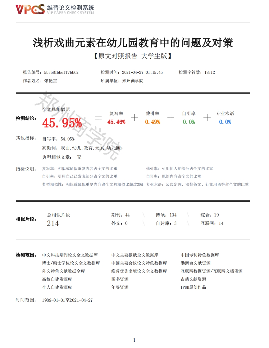 维普论文检测系统/IP PAPER CHECK SYSTEM浅析戏曲元素在幼儿园教育中的问题及对策【原文对照报告-大学生版】报告编号:5b3b8 fbbcff7bb62检测时间:2021-04-2701:15:45检测字符数:18312作者姓名:张艳杰所属单位:郑州商学院全文总相似比复写率他引率自引率专业术语检测结论:45.95%45.46%0.49%0.0%0.0%其他指标:自写率:54.05%高频词:戏曲,幼儿,教育,元素,幼儿园典型相似文章:无指标说明:复写率:相似或疑似重复内容占全文的比重他引率:引用他人的部分占全文的比重自引率:引用自己已发表部分占全文的比重自写率:原创内容占全文的比重典型相似性:相似或疑似重复内容占全文总相似比超过30%专业术语:公式定理、法律条文、行业用语等占全文的比重总相似片段期刊:44博硕:134综合:19相似片段:214外文:0自建库:3互联网:14检测范围:中文科技期刊论文全文数据库中文主要报纸全文数据库中国专利特色数据库博士/硕士学位论文全文数据库中国主要会议论文特色数据库港澳台文献资源外文特色文献数据全库维普优先出版论文全文数据库互联网数据资源/互联网文档资源高校自建资源库图书资源古籍文献资源个人自建资源库年鉴资源IPUB原创作品时间范围:1989-01-01至2021-04-27维普论文检测系统VIP PAPER CHECK SYSTEM原文对照颜色标注说明:■自写片段■复写片段(相似或疑似重复)口引用片段(引用)■专业术语(公式定理、法律条文、行业用语等)学号:20170646137郑州商学院本科毕业论文(设计)浅析戏曲元素在幼儿园教育中的问题及对策院部名称:文学与新闻传播学院专业名称:学前教育学生姓名:张艳杰指导教师:刘颂华副教授吉宇2021年5月摘要近年来,传统文化受到了越来越多的关注与重视,随着各界对发扬与传承传统文化越来越重视,传统戏曲也进入了人们的日常生活中然而在现今多元文化并存的时代戏曲的传承与发展遭遇坎坷。社会在变迁,时代在发展,文明在进步,以前的传统戏曲再优秀也不可能千年都不过时。随着国家越发重视中华文化的传承,戏曲这一艺术形式的传承与发展也迎来了新的契机。文化的传承离不开教育,而文化的传承更应该从小开始,故将优秀的传统文化引入幼儿园课程是非常必要的。幼儿园教育是基础教育之基础,幼儿时期正是培养孩子性格形成良好个性和习惯的重要时期,因此我们要把戏曲元素融入到幼儿园课程当中。幼儿园戏曲元素教育可促进幼儿在身体、认知、社会情感、审美等各方面全面发展,有利于加强幼儿的素质教育。据此,本研究在国内外已有的幼儿园戏曲元素的相关文献基础上,将观察法、访谈法和文献研究法相结合对幼儿园戏曲元素教育的现状进行研究。首先分析戏曲元素在幼儿园教育中存在的问题:然后发现影响幼儿园戏曲元素教育的因素:家园戏曲氛围淡薄造成戏曲元素教育合力不足;教师培养缺失致使戏曲教育师资匮乏:戏曲元素教育教学缺乏创新性。基于对现状的分析,最后提出解决戏曲元素在幼儿园教育中存在问题的相关的对策与建议,提出的对策主要有营造氛围,形成戏曲元素教育合力:强化师资,培养优秀且专业的戏曲教师:幼儿园切实履行指导职责,社会积极发挥引导作用等,只有多方合力,共同为孩子打造一个良好的生活学习环境,才能让他们更加健康、快乐地成长。关键词:戏曲元素教育:幼儿教育:幼儿园AbstractIn recent years,traditional culture has received more and more attention.With the increasingattention from all walks of life to carry forward and inherit traditional culture,traditional operahas also entered People's Daily life.However,in today's multicultural era,the inheritance anddevelopment of traditional opera have encountered frustrations.The society is changing,The Timesare developing,and the civilization is progressing.No matter how excellent the traditional operais,it is impossible for it to be out of time for thousands of years.As the country attaches moreimportance to the inheritance of Chinese culture,the inheritance and development of opera as an artform also ushered in a new opportunity.Cultural inheritance is inseparable from education,andcultural inheritance should start from childhood,so it is very necessary to introduce excellent2维普论文检测系统VIP PAPER CHECK SYSTEMtraditional culture into kindergarten curriculum.Kindergarten education is the basis of basiceducation,early childhood is an important period to cultivate children's character and form goodpersonality and habits,so we should integrate drama elements into the kindergarten curriculum.Theeducation of drama elements in kindergarten can promote children's all-round development inphysical,cognitive,social emotion,aesthetic and other aspects,which is conducive tostrengthening children's quality-oriented education.Therefore,based on the existing domestic andforeign literature on kindergarten drama elements,this study combines observation method,interviewmethod and literature research method to study the status quo of kindergarten drama elementeducation.Firstly,the problems existing in the kindergarten education of drama elements areanalyzed.Then we find the factors that affect the education of drama elements in kindergarten:theweak atmosphere of drama in our homes leads to the lack of joint efforts in the education of dramaelements;The lack of teacher training leads to the shortage of teachers in opera education;Theteaching of drama elements lacks innovation.Based on the analysis of the current situation,thispaper finally puts forward relevant countermeasures and suggestions to solve the problems existingin the kindergarten education of drama eleme