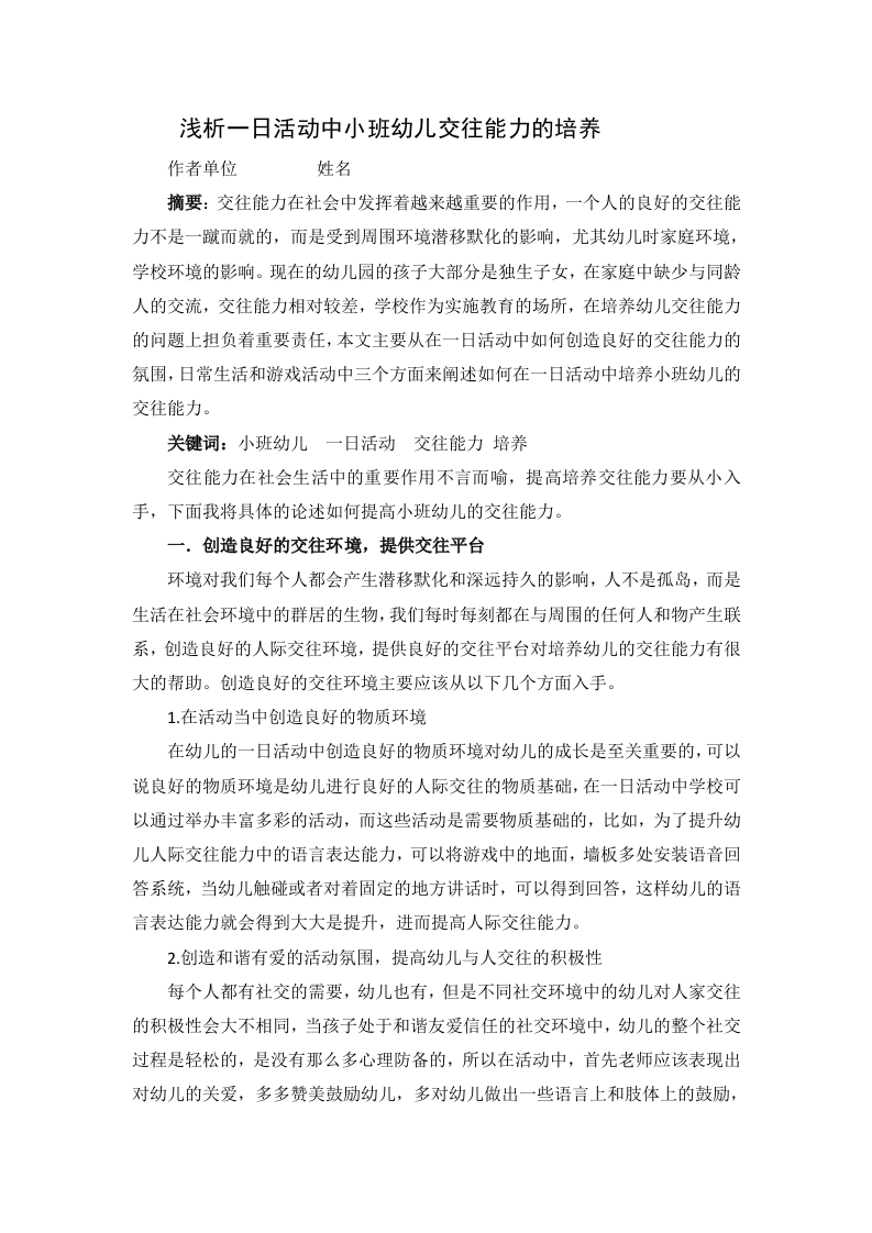 浅析一日活动中小班幼儿交往能力的培养作者单位姓名摘要:交往能力在社会中发挥着越来越重要的作用,一个人的良好的交往能力不是一蹴而就的,而是受到周围环境潜移默化的影响,尤其幼儿时家庭环境,学校环境的影响。现在的幼儿园的孩子大部分是独生子女,在家庭中缺少与同龄人的交流,交往能力相对较差,学校作为实施教育的场所,在培养幼儿交往能力的问题上担负着重要责任,本文主要从在一日活动中如何创造良好的交往能力的氛围,日常生活和游戏活动中三个方面来阐述如何在一日活动中培养小班幼儿的交往能力。关键词:小班幼儿一日活动交往能力培养交往能力在社会生活中的重要作用不言而喻,提高培养交往能力要从小入手,下面我将具体的论述如何提高小班幼儿的交往能力。一,创造良好的交往环境,提供交往平台环境对我们每个人都会产生潜移默化和深远持久的影响,人不是孤岛,而是生活在社会环境中的群居的生物,我们每时每刻都在与周围的任何人和物产生联系,创造良好的人际交往环境,提供良好的交往平台对培养幼儿的交往能力有很大的帮助。创造良好的交往环境主要应该从以下几个方面入手。1.在活动当中创造良好的物质环境在幼儿的一日活动中创造良好的物质环境对幼儿的成长是至关重要的,可以说良好的物质环境是幼儿进行良好的人际交往的物质基础,在一日活动中学校可以通过举办丰富多彩的活动,而这些活动是需要物质基础的,比如,为了提升幼儿人际交往能力中的语言表达能力,可以将游戏中的地面,墙板多处安装语音回答系统,当幼儿触碰或者对着固定的地方讲话时,可以得到回答,这样幼儿的语言表达能力就会得到大大是提升,进而提高人际交往能力。2.创造和谐有爱的活动氛围,提高幼儿与人交往的积极性每个人都有社交的需要,幼儿也有,但是不同社交环境中的幼儿对人家交往的积极性会大不相同,当孩子处于和谐友爱信任的社交环境中,幼儿的整个社交过程是轻松的,是没有那么多心理防备的,所以在活动中,首先老师应该表现出对幼儿的关爱,多多赞美鼓励幼儿,多对幼儿做出一些语言上和肢体上的鼓励,其次,老师应该教育幼儿,同学之间应该互相谦让,互相尊重,互相帮助,在幼儿之间形成良好的氛围人家交往氛围,帮助幼儿树立起对这个社会中人际交往的最基本的信任感,营造健康的人际交往的环境,帮助幼儿树立良好的人际交往的健康心理,提高幼儿人际交往的积极性。二.一日活动中不同活动的具体任务1.通过早晚接送,帮助孩子树立最基本的礼貌意识幼儿在早晨和晚上都需要父母接送,这时候教师要对幼儿进行最基本的礼貌教育,见到老师送是幼儿和父母要主动问好,和老师父母分别时要说再见,和父母说,父母辛苦了,早晚接送是幼儿一日活动中的重要组成部分,在这一过程中,也是父母和老师见面沟通交流的机会,要通过早晚接待活动,培养幼儿对父母和教师的最基本的礼貌意识。尊重他人,懂得感恩是人际交往中非常重要的一点,通过早晚接送,可以帮助幼儿树立起对老师,父母的感恩之心,懂得尊重老师和父母,进而通过对老师和父母的感恩培养幼儿的感恩之心的养成,感恩他人,感恩社会,这不仅对提升幼儿时代的感恩之心有很大的帮助,对于幼儿一声中的人际交往都非常重要。2.通过餐前活动,提升幼儿之间的沟通交往能力餐前是幼儿之间相互沟通和交流的关键时刻,受很多因素的影响,有些孩子不愿意和别人沟通交流,在日常活动中表现的比较孤僻,餐前正好是促进这些幼儿和其他幼儿沟通交流的好机会。因为餐前幼儿们坐在一起,是进行沟通交流的良好时机,幼儿之间的交流会带动那些比较孤僻的孩子进行沟通交流,学校也可以组织一些餐前的小游戏,通过餐前游戏提高幼之间的沟通交往和合作能力,这在幼儿的人际交往中也发挥着重要的作用。3,。通过在洗漱中排队培养幼儿谦逊有礼的人际交往习惯幼儿在上卫生间,或者洗漱的时间比较集中,很容易发生争抢插队的行为,造成幼儿之间人际关系的冲突,越是容易诱发冲突的地方,越是容易教育幼儿培养良好的人际交往习惯的地方,在很多孩子同时需要洗漱时,教师就应该要教育孩子要懂得谦让,要遵守纪律和安排,遵守纪律,先来后到,不要排队,遵守纪律是人际交往中的重要准则,让看到别人比你更着急,更需要帮助时,要学会礼让他人,帮助他人,这也是人际交往中非常重要的原则,所以,通过培养幼儿在洗漱时按照规矩排队,谦逊有礼是幼儿一日活动教育中非常有效的途径。三.在一日活动中设计促进幼儿之间行为交往的游戏活动爱玩是幼儿的天性,幼儿的年龄很小,通过说教的方式培养孩子的人际交往能力的效果不是很大,幼儿听不懂教师的表达,也不会对那些自己听的不太懂的说教感兴趣,还有就是人际交往本身就是要在实践中不断培养的,所以通过设计丰富多彩的小游戏一方面能够提升幼儿的活动积极性,激发幼儿的兴趣,另一方面也能寓教于乐,游戏的过程本身就是幼儿之间相互沟通和交流的过程,是最实践的效果非常好的提升幼儿人际交往能力的途径。并且通过让不同的幼儿共同完成一个游戏,可以增进幼儿之间交流协作能力,尤其是团队合作能力,每个人都不肯单打独斗的成功,这个社会也是需要我们团结协作才能创造出辉煌的时代,所以在游戏中对孩子交往能力