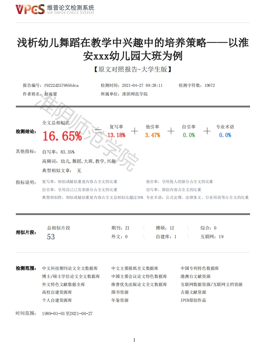维普论文检测系统VIP PAPER CHECK SYSTEM浅析幼儿舞蹈在教学中兴趣中的培养策略一一!以淮安xxx幼儿园大班为例【原文对照报告-大学生版】报告编号:f9222d2579856dca检测时间:2021-04-2709:28:11检测字符数:10672作者姓名:赵雨蒙所属单位:淮阴师范学院全文总相似比复写率他引率自引率专业术语检测结论:16.65%3.47%0.0%0.0%其他指标:自写率:83.35%高频词:幼儿,舞蹈,大班,教学,兴趣院典型相似文章:无指标说明:复写率:相似或疑似重复内容占全文的比重他引率:引用他人的部分占全文的比重自引率:引用自己已发表部分占全文的比重自写率:原创内容占全文的比重典型相似性:相似或疑似重复内容占全文总相似比超过30%专业术语:公式定理、法律条文、行业用语等占全文的比重总相似片段期刊:21博硕:12综合:0相似片段:53外文:0自建库:1互联网:19检测范围:中文科技期刊论文全文数据库中文主要报纸全文数据库中国专利特色数据库博士/硕士学位论文全文数据库中国主要会议论文特色数据库港澳台文献资源外文特色文献数据全库维普优先出版论文全文数据库互联网数据资源/互联网文档资源高校自建资源库图书资源古籍文献资源个人自建资源库年鉴资源IPUB原创作品时间范围:1989-01-01至2021-04-27维普论文检测系统VIP PAPER CHECK SYSTEM原文对照颜色标注说明:■自写片段■复写片段(相似或疑似重复)引用片段(引用)■专业术语(公式定理、法律条文、行业用语等)毕业论文HNU学生姓名赵雨蒙学号0714170113学院教育科学学院专业学前教育(师范)题目大班幼儿舞蹈教学中兴趣培养策略的研究一一以淮安市Q幼儿园为例冷英嘉讲师/硕士指导教师(姓名)(专业技术职称/学位)2021年月摘要:儿童舞蹈是一种综合表达形式,结合了身体动作,语言,戏剧表演和音乐,以反映儿童的生活。对于大班幼儿,他们的活动自主性、主动性提高,活动更有目的、有计划,他们在舞蹈学习时往往会增加自己的想法。适当难度的舞蹈动作让他们对幼儿舞蹈产生浓厚的兴趣。对于大班幼儿,在对幼儿舞蹈产生兴趣的基础上可以充分调动幼儿的积极性,使幼儿集中注意进行舞蹈学习,然后带幼儿积极参与各种舞蹈活动,感受舞蹈活动的快乐。本文用了观察法、访谈法、文献法等方法对大班幼儿舞蹈教学兴趣的重要性、兴趣培养的现状、兴趣缺失的原因与分析以及培养策略等几方面进行了研究。关键词:幼儿舞蹈,教学,兴趣培养2维普论文检测系统VIP PAPER CHECK SYSTEMAbstract:Situational teaching is the most important part of promoting quality education,and ithas been widely used in primary Chinese In this paper,through the teaching of the classroom inprimary Chinese,to understand the classroom examples and combine the relevant theoreticalpropositions at home and abroad,it is found that situational teaching can stimulate students'enthusiasm for learning,passively and actively,and understand the books in a complete situationcan live and learn to use,expand the extension of life in all aspects.However,some teachers havesome misunderstandings about the situational teaching,which leads the teacher to create anunbalanced situation and lack emotional involvement so that students may lose the dominant position.Therefore,teachers should be solid theoretical basis,and according to the actual situation,varyaccording to the course,vary,so that the context of teaching to the greatest extent possible toplay the greatest value.目录1绪论31.2选题意义41.4研究设计6阴师范学院Key words:children dance,teaching,interest development1.1选题依据41.3概念界定和文献综述51.3.1概念界定51.3.2文献综述52幼儿园舞蹈教学中兴趣的重要性73大班幼儿舞蹈教学中兴趣培养的现状73.1幼儿园大班教师对幼儿舞蹈教学的重视程度73.2大班幼儿在舞蹈教学时的注意集中程度84大班幼儿在舞蹈教学中兴趣缺失的原因及分析94.1幼儿舞蹈音乐选取的成人化94.2幼儿舞蹈教学方法单一104.3大班幼儿在舞蹈教学中注意力不集中115大班舞蹈教学中提高幼儿兴趣的策略115.1结合大班幼儿生理特点采取的方法115.2结合大班幼儿的心理特点,运用鼓励性语言进行传递115.3营造良好的大班幼儿学习外部环境125.4将大班幼儿暂时的兴趣转化成为长期兴趣13结论14参考文献14附录151绪论1.1选题依据随着社会经济的发展,越来越多的家长重视幼儿艺术的培养,希望能陶治情操,增强气质,促进身心发展,形成良好的意志和道德,甚至成为幼儿的一门技能。目前,许多舞蹈教师的教学方式单一,没有根据幼儿的心理特点制定教学计划。尤其是在大班幼儿对舞蹈学习的兴趣上,没有给予足够的重视和引导,导致幼儿处于被动学习状态[1]。这样一来,他们学不好舞蹈,也增加了幼儿学习舞蹈的阻力,不利于幼儿的舞蹈学习。由此可见,兴趣是幼儿学好舞蹈的重要环节,也是本文研究的重点。1.2选题意义幼儿舞蹈在舞蹈教育中占有重要地位。它生动、直观,提起了大班幼儿们的兴趣,它是幼儿自我表达的主要方法和途径。大班幼儿自我意识增强,他们总是对他们感兴趣的东西感兴趣。如果舞蹈成为大班幼儿们感兴趣的东3