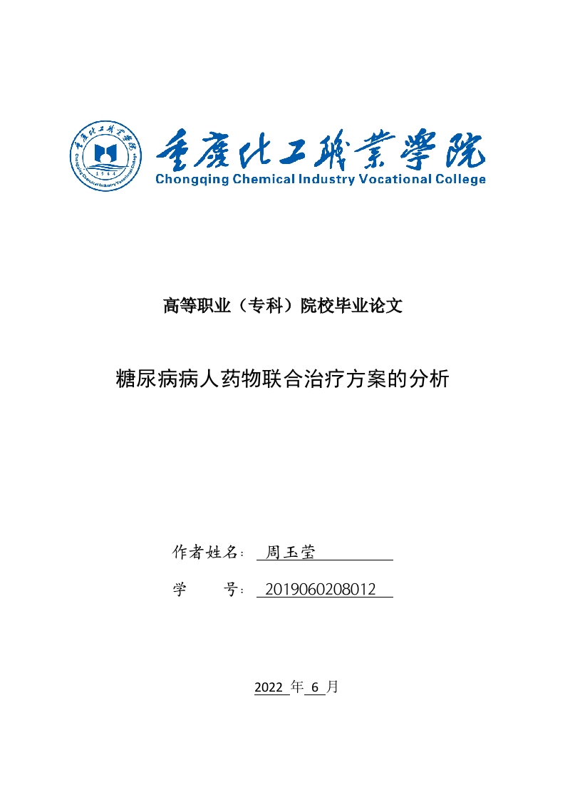 Chongqing Chemical Industry Vocational College高等职业(专科)院校毕业论文糖尿病病人药物联合治疗方案的分析作者姓名:周玉莹学号:20190602080122022年6月高等职业(专科)院校毕业论文糖尿病病人药物联合治疗方案的分析专业名称:药品服务与管理指导教师姓名、职称:孔庆新教授学生所属培养单位:制药工程学院论文答辩日期:2022年6月1日重庆化工职业学院毕业论文摘要众所周知,高血糖的主要疾病机理为胰岛素抵抗与体内胰脏中产生的胰岛素不足,它所表现的糖代谢异常也是丰富多变:有的以空腹情况下的血糖上升为主,有的则以饭后血糖上升为主,但更多的则是在空腹情况下与饭后血糖均上升。本篇对于糖尿病的联合治疗的方案主要分析了磺脲类、双胍类、胰岛素为主的药物治疗方法以及带给糖尿病患者的益处。关键词:糖尿病:联合治疗:分析