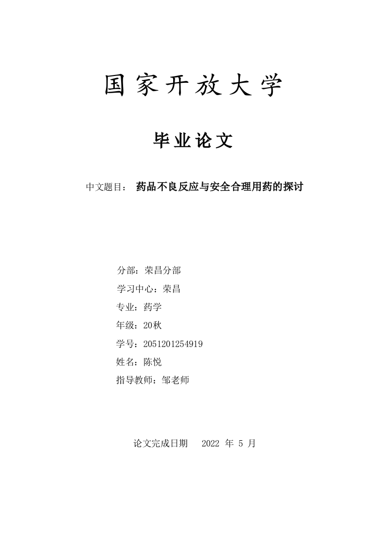 国家开放大学中文题目:药品不良反应与安全合理用药的探讨分部:荣昌分部学习中心:荣昌专业:药学年级:20秋学号:2051201254919姓名:陈悦指导教师:邹老师论文完成日期2022年5月目录摘要一、前言2二、不合理应用抗生素所致相关疾病发生.2三、提前预防不良反应的发生,提升自我防御意识3(一)药品因素3(二)患者自身因素.4(三)其他因素四、药品不良反应监测法规体系现状五、怎样做到安全用药…(一)按说明书要求服用药品(二)科学的用药习惯(三)理性选择用药8六、总结参考文献摘要药品不良反应(Adverse Drug Reaction,ADR)是临床诊疗及患者用药过程中常见的药害事件之一,但现实工作中对ADR的管理应用无论从政策法规、检验人员、覆盖面、信息来源或是专业度等方面都存在欠缺。掌握ADR是临床合理用药的前提之一,本文将从不合理应用抗生素导致ADR引申出对ADR的现实探讨,再分别从造成药品不良反应的因素分析,对相关政策法规提出建议,最后对如何安全用药提出分析和建议。综上,希望对ADR的分析对临床和患者用药有借鉴,以减少因管理不到位和不了解ADR导致的药害事件,促进临床科学合理使用药品。关键词:药品不良反应;合理用药;药物监测