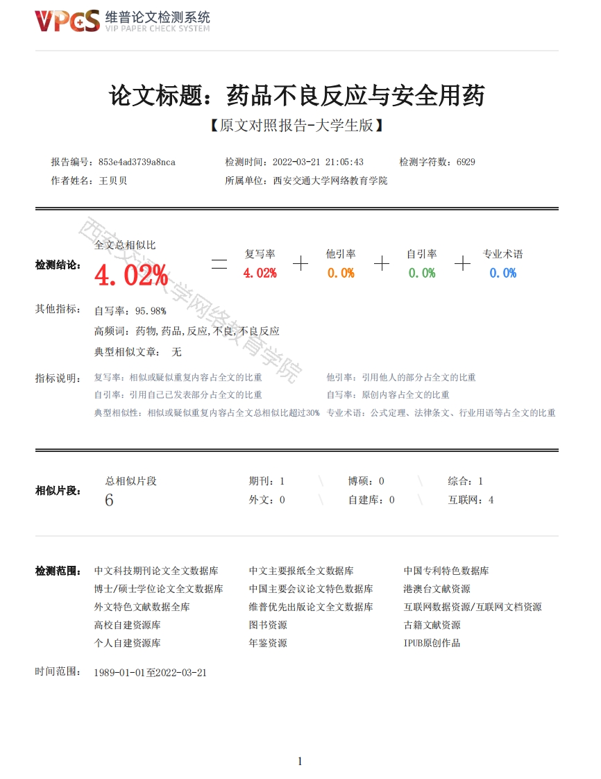 维普论文检测系统VIP PAPER CHECK SYSTEM论文标题:药品不良反应与安全用药【原文对照报告-大学生版】报告编号:853e4ad3739a8nca检测时间:2022-03-2121:05:43检测字符数:6929作者姓名:王贝贝所属单位:西安交通大学网络教育学院全文总相似比复写率他引率自引率专业术语检测结论:4.02%4.02%0.0%0.0%0.0%其他指标:自写率:95.98%高频词:药物,药品,反应,不良,不良反应典型相似文章:无指标说明:复写率:相似或疑似重复内容占全文的比重院他引率:引用他人的部分占全文的比重自引率:引用自己已发表部分占全文的比重自写率:原创内容占全文的比重典型相似性:相似或疑似重复内容占全文总相似比超过30%专业术语:公式定理、法律条文、行业用语等占全文的比重总相似片段期刊:1博硕:0综合:1相似片段:6外文:0自建库:0互联网:4检测范围:中文科技期刊论文全文数据库中文主要报纸全文数据库中国专利特色数据库博士/硕士学位论文全文数据库中国主要会议论文特色数据库港澳台文献资源外文特色文献数据全库维普优先出版论文全文数据库互联网数据资源/互联网文档资源高校自建资源库图书资源古籍文献资源个人自建资源库年鉴资源IPUB原创作品时间范围:1989-01-01至2022-03-21维普论文检测系统VIP PAPER CHECK SYSTEM原文对照颜色标注说明:■自写片段■复写片段(相似或疑似重复)口引用片段(引用)■专业术语(公式定理、法律条文、行业用语等)安交通论文药品不良反应与安全用药论文以育学院申请人:王贝贝学科(专业):药学指导教师:张寒2022年2月网络教育学院毕业设计(论文)任务书专业班级药学层次专升本姓名王贝贝学号319093815850807一、毕业设计(论文)题目药品不良反应与安全用药二、毕业设计(论文)工作自2022年2月1日起至2022年2月21日止三、毕业设计(论文)基本要求:论文的总体结构应分为:题目、摘要、目录、正文、结论、参考文献和附录等几部分组成。论文应该有自己的创意和观点,设计方案合理、可行,图面质量符合规定,文理通顺,论点明确,论据充分,结论正确。根据论文研究方向,独立进行文献查找和分析文献资料。指导教师:网络教育学院毕业设计(论文)考核评议书指导教师评语:建议成绩:指导教师签名:年月日答辩小组意见:2维普论文检测系统VIP PAPER CHECK SYSTEM负责人签名年月日答辩小组成员毕业设计(论文)答辩委员会意见:负责人签名:年月日论文题目:药品不良反应与安全用药学科(专业):药学申请人:王贝贝指导教师:张寒摘要在当今社会,由于科技特别是医疗科技的飞速发展,各类药物层出不穷,药瓶量与品种的数量日益增加。药物复杂性也愈来愈高,药物所带来的社会问题也愈来愈多,应防止或不合理应用药物,为避免严重不良反应状况的出现,对处方药必须要科学合理地应用。而正确选用用药方法在诊断过程中起着关键性作用,需要临床医生在诊断清楚的基础上对症下药,还需要对用药过程有全方位的认识,很多药物的副作用会对人体健康造成非常恶劣的影响,特别是在长时间服用或者单次服用剂量过大时,身体甚至还可能出现药物中毒的情况,因此,必须要对药物不良反应和药物副作用有一个相对全面的了解、在服药之前明确药物的具体影响,提出更具针对性的应对措施。科学的服药方式可以有效降低药物的副作用。从这个角度来看,在当代医学技术如此发达的今天,必须要采用更加科学合理的方式对新药进行应用,避免不良反应导致的一系列负面效应。关键词:不良反应:合理用药论文类型:理论研究目录1绪论....2药品使用现状2.1广泛滥用抗生素药物···2.2相关法律法规实行力度不够3导致药品不良反应的因素3.1药品因素······3.2患者自身的原因·····4不良反应如何判断······4.1从时间判断········5合理用药,减少药品的不良反应发生·5.2有效性参考文献3