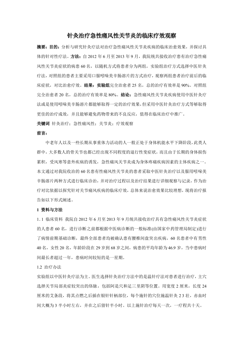 针灸治疗急性痛风性关节炎的临床疗效观察摘要:目的:分析与研究针灸疗法对治疗急性痛风性关节炎疾病的临床治愈效果,并探讨具体的针对性疗法。方法:自2012年6月至2013年9月,我院统共接收治疗患有治疗急性痛风性关节炎症状的病患60名,以随机方式将患者分为两组,实验组治疗方式选择中医针灸疗法,对照组的患者主要采用口服吲哚美辛肠溶片的方式治疗,观察两组患者治疗前后的临床症状,对比治愈疗效。结果:实验组完全治愈者25名,总的治疗有效率是90%。对照组完全治愈者20名,总的治疗有效率是80%。结论:急性痛风性关节炎疾病使用中医针灸疗法或是使用吲哚美辛肠溶片都能够取得一定的治疗效果,但采用中医针灸治疗方式等够取得更佳的治疗成效,并且能够避免药物带来的不良反应,值得在临床治疗中推广。关键词针灸治疗:急性痛风性:关节炎:疗效观察前言:中老年人以及一些长期从事重体力活动的人一般正处于身体机能水平下降阶段,此类人群中,大多数人的骨关节也都己经出现不同程度的退行性变症状,而且由于长期的身体损伤累积,受风寒等意外疾病的诱发,急性痛风关节炎成为身体疼痛疾病因素的主体疾病之一。本文通过对我院收治的60名患有性痛风性关节炎的患者采取中医针灸治疗以及服用吲哚美辛肠溶片两种方式进行临床诊治,并对治疗过程以及治疗结果进行详细观察与记录,作为治疗对比依据以探究针对关节痛风疾病的临床疗效,总体来说治愈效果比较理想,现将治疗报告如以下形式阐述。1资料与方法1.1临床资料我院自2012年6月至2013年9月统共接收治疗具有急性痛风性关节炎症状的人患者60名,进行诊断之前都根据中医病诊断的一般标准(由国家中药管理局制定)进行了病情前期基础诊断,最终全部患者均被确认患有腰椎间盘突出疾病,60名患者中有男性40名,女性20名,年龄阶段在29岁到68岁之间,病患的平均年龄为46.9岁,当中患病时间最长者超过一年,患病时间较短的是一星期。12治疗办法实验组以中医针灸疗法为主。医生选择针灸治疗方法中的是温针疗法对患者进行治疗,主穴选择关节局部炎症较突出的络脉,包括阿是穴和足三里阴等位置。用宽度2厘米,长度24厘米的艾条段,将其点燃之后插在银针针柄部位,每个施针的穴位施温针灸23壮,赤血时间大概为3半小时左右,并在之后留针半小时。以上施针治疗每天一次,一疗程共十天。对照组主要服用吲哚美辛肠溶片,患者每天服用两次,每次75毫克,服用十天。13治疗效果评判的主要标准1)完全治愈:患者身体不再出现关节疼痛症状,可以完成一般日常活动,并且能够投入正常生活与工作。2)治疗显效:病患经过我院的针灸疗法治疗后,在进行日常活动至疲劳之后偶尔依然会发生腰关节疼痛的症状,基本能够完成正常活动,且不影响正常的生活与工作。3)治疗有效:病患经过我院治疗后关节疼痛症状有明显的缓解与减轻,活动依然受限,但有好转迹象,并且己经能够参加到较为轻度的劳力工作中。4)治疗无效:经过全部针灸治疗疗程治疗后,病患的关节疼痛症状依然明显,身体体征以及腰部功能障碍问题等均没有发生变化。1.4统计学处理用SPSS11.0统计软件,计量数据以均数标准差表示,用药前后各指标差异性比较采用配对t检验,P<0.05为差异有统计学意义2结果本研究针对我院自20126月至2013年9月接受治疗的患有急性痛风性关节炎的60名患者进行治疗过程以及治疗结果的详细记录,十天一疗程,实验组经过系统针灸治疗,对照组服用吲哚美辛肠溶片,60名患有腰椎间盘突出疾病的患者中完全治愈者40名,占66.67%,治疗显效者12名,占20%,治疗有效但未治愈者5名,占8.3%,无效者3名,占5%。总的治疗有效人数是57人,总治疗有效率是95%。由治疗结果表明,中医针灸疗法以及服用吲哚美辛肠溶片对于急性痛风性关节炎疾病都有有十分显著的治疗效果。疗效。本院自2012年6月至2013年9月收治的60名急性痛风性关节炎患者治疗结果完全治愈治疗显效治疗有效但未治愈无效总有效人数(人)453951比例(%)75%5%5%15%85%p<0.05实验组与对照组临床治疗记录对比人数完全治愈治疗显效治疗有效但未治愈无效总有效实验组302511390%对照组30202680%3讨论急性痛风性关节炎大多数是因为外力因素导致身体组织受损甚至退化,主要的临床症状表现为关节疼痛、发麻等。该疾病主要集中发生于40岁到60岁左右的年龄阶层中。目前针对急性痛风性关节炎疾病的治疗一般采取中医针灸疗法以及服用吲哚美辛肠溶片的方式进行治疗处理,治疗最终目的在于缓解、减轻以及消除病患的疾病疼痛困扰,避免疾病再次复发。选择不同的治疗手法可以取得不同的疗效对。本研究中实验组的急性痛风性关节炎患者主要选择温针灸治疗办法,治愈率高达90%,且治愈过程较为轻松,患者受到的治疗伤害较小。中医专门的温针灸疗法可以通过施针入穴,让患者受损部位活血化瘀,并且促进患者的关节炎症缓解,从而更快地使得关节各个神经的生理功能性恢复正常,进而关节神经生理功能。对照组的病患在整个疗程中只要采用口服吲哚美辛肠溶片方式治疗,治愈率为80%。治疗研究过程以及研究结果表明,中医针灸治疗以及口服用药方式在治疗急性痛风关节炎疾病中都有有十分显著的临床治愈效果,能够有效缓解病患关节疼痛病状痛苦,并提高病患身体一般生理功能,投入正常生活与工作中