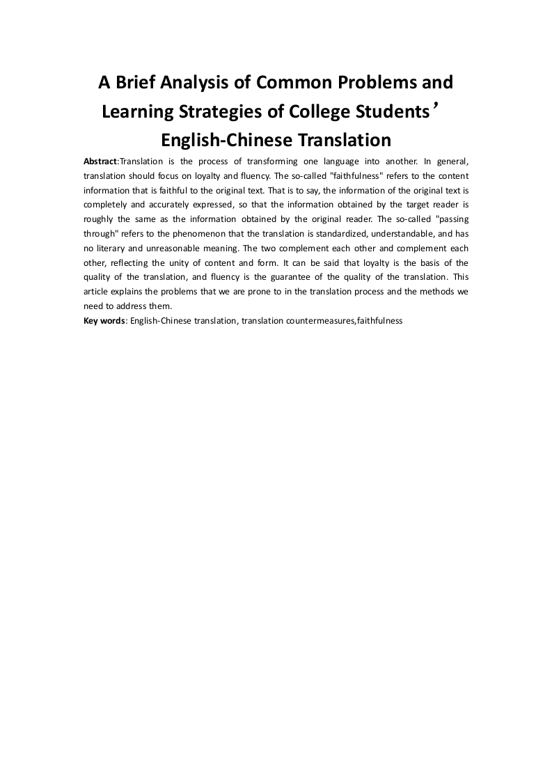 A Brief Analysis of Common Problems andLearning Strategies of College Students'English-Chinese TranslationAbstract:Translation is the process of transforming one language into another.In general,translation should focus on loyalty and fluency.The so-called "faithfulness"refers to the contentinformation that is faithful to the original text.That is to say,the information of the original text iscompletely and accurately expressed,so that the information obtained by the target reader isroughly the same as the information obtained by the original reader.The so-called "passingthrough"refers to the phenomenon that the translation is standardized,understandable,and hasno literary and unreasonable meaning.The two complement each other and complement eachother,reflecting the unity of content and form.It can be said that loyalty is the basis of thequality of the translation,and fluency is the guarantee of the quality of the translation.Thisarticle explains the problems that we are prone to in the translation process and the methods weneed to address them.Key words:English-Chinese translation,translation countermeasures,faithfulness目录1 Introduction.2 Characteristics of English-Chinese Translation and Difficulties.....32.1Characteristics of English-Chinese Translation.......32.1.1Sentence translation should be concise and concise....32.1.2Meaning Translation Should Be Equivalent and Complete.............42.1.3Use terminology concretely and appropriately.4.3 Common Problems of Chinese College Students in English-Chinese Translation........53.2 Having Difficulties in Language Expression......63.3 Overlooking the Differences between Chinese and English..........64 Causes of the Problems........................85 Learning Strategies of English-Chinese Translation....Reference…1 IntroductionWith the promotion of China's international status,it is inevitable that the country has intensifiedits diplomatic efforts.As a result,more and more translators are playing the role of languageconversion in international affairs.Chinese universities have gradually set English translationcourse as a compulsory or optional course in order to find and cultivate a number of high-endtalents in English translation.However,in the actual teaching process,we find that there are aseries of problems in College English translation classroom teaching.If these problems can not beeffectively improved,there will be a serious crisis in our translation classroom teaching.2CharacteristicsofEnglish-ChineseTranslation and Difficulties2.1 Characteristics of English-Chinese Translation2.1.1Sentence translation should be concise and conciseWhen conducting international business and trade,special attention should be paid to efficiencyand time.Both sides should adhere to the principle of efficiency and conciseness in theirdiscussions and exchanges,and also pay attention to business etiquette.Therefore,everybusiness English translator should elaborate the content of raw materials accurately andconcisely in order to improve the efficiency of business negotiation.At the same time,whentranslating texts of international trade,we should not only ensure the accuracy and concisenessof the wording,but also pay attention to the use of polite tone.That is to say,business Englishshould not use rhetoric as much as possible,but should pay attention to the conciseness andobjectivity of language.2.1.2Meaning Translation Should Be Equivalent and CompleteIf we want the target readers to understand cearly the requirements of the sender,we shouldnot only use accurate and specific translation terminology,but also ensure that it has completemeaning.Integrity means that translators should fully and completely represent all theinformation involved in raw materials,and should not miss out.Especially important businessguidelines and data,they must ensure their integrity and faithfulness.The integrity and