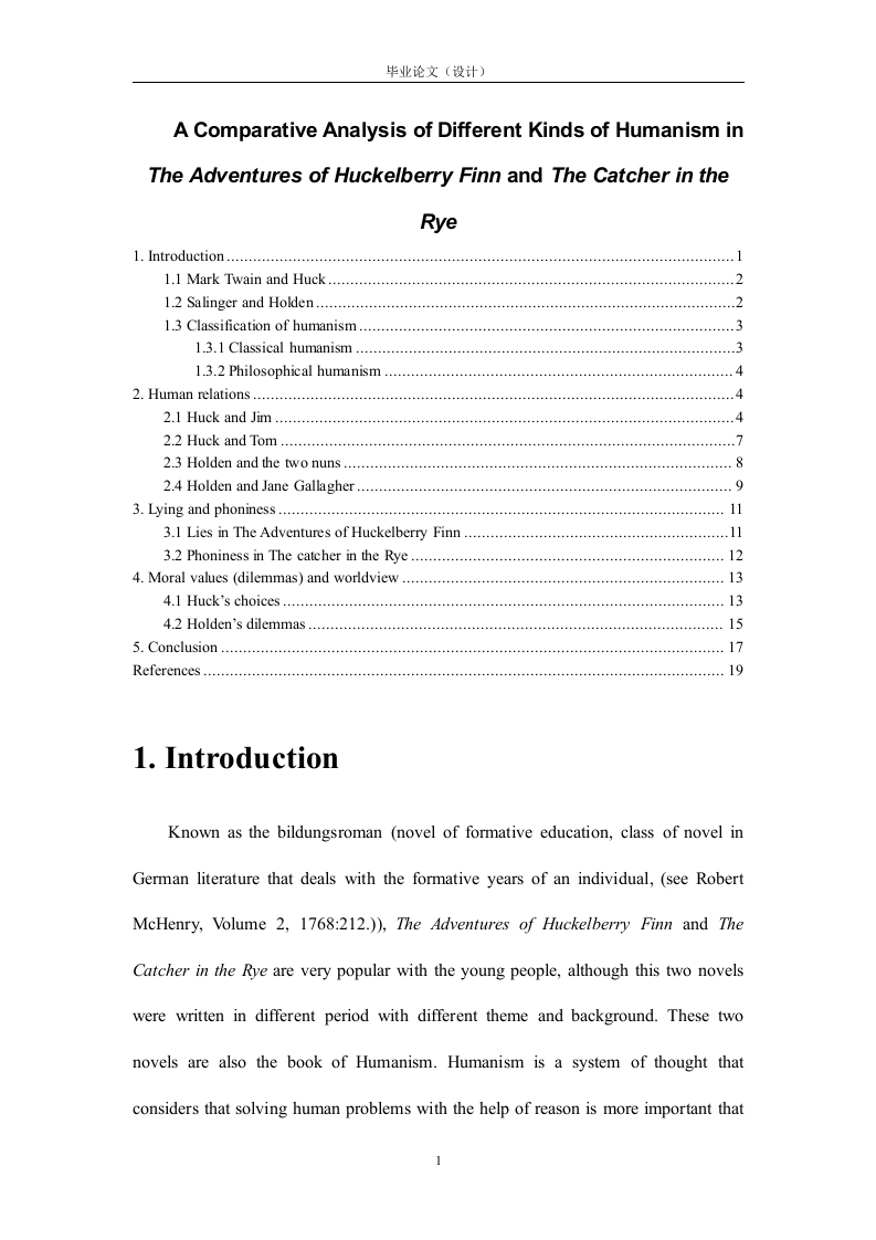 毕业论文〔设计)A Comparative Analysis of Different Kinds of Humanism inThe Adventures of Huckelberry Finn and The Catcher in theRye1.Introduction.1.1 Mark Twain and Huck..............21.2 Salinger and Holden..................21.3 Classification of humanism....31.3.1 Classical humanism.......31.3.2 Philosophical humanism....42.Human relations…2.1 Huck and Jim .............42.2 Huck and Tom…2.3 Holden and the two nuns...........82.4 Holden and Jane Gallagher.........3.Lying and phoniness.113.1 Lies in The Adventures of Huckelberry Finn..3.2 Phoniness in The catcher in the Rye....................124.Moral values (dilemmas)and worldview134.1 Huck's choices…...........................34.2 Holden's dilemmas.......155.Conclusion….............................17References.…191.IntroductionKnown as the bildungsroman (novel of formative education,class of novel inGerman literature that deals with the formative years of an individual,(see RobertMcHenry,Volume 2,1768:212.)),The Adventures of Huckelberry Finn and TheCatcher in the Rye are very popular with the young people,although this two novelswere written in different period with different theme and background.These twonovels are also the book of Humanism.Humanism is a system of thought thatconsiders that solving human problems with the help of reason is more important that毕业论文〔设计)religious beliefs.It emphasizes the fact that the basic nature of human being is good.(see Sally Wehmeier,1970:862.)In this dissertation I am going to compareHumanism in two books and find out the different emphasizing aspects on Humanism.It also can reflect the different humanistic ideas in 19th century and 20h century.1.1 Mark Twain and HuckThe name of Mark Twain is much better known than Samuel Clemens.In thehistory of American literature,Twain is a great realist and satirist in late 19th century.His major works were written in the period from 1870-1910 when America wastransformed from free trade capitalism to monopolistic stage with a high speed.Mostof his works reflect the American social life and have great significance.In 1884,Mark Twain wrote one of the most controversial and remembered novels in the worldof literature,The Adventures of Huckleberry Finn.Twain made Huckleberry Finnrepresent him fictionally in this book.Huck did the same typical boy things as Twain.Twain based this book on things that were happening during this time in his life.InThe Adventures of Huckleberry Finn,Mark Twain reveals the American social lifeand concern about the humanity and conscience's development and perfection.1.2 Salinger and HoldenComparing the past life experience of Salinger with the Holden who is theprotagonist in his masterpiece The Catcher in the Rye,it is clear that there are somany similarities in them.No wonder Salinger can reveal the younger boy's mental2毕业论文〔设计)activity profoundly and strike a sympathetic chord among the young people."TheCatcher in the Rye is like an autobiography.He had Holden raised in a similar settingas himself,and all of Holden's outstanding characteristics like his reclusive nature,discontent,and anger towards the movie industry are all from Salinger's personal life"(Net.1).Salinger created Holden for criticizing the coldness,phony,superficialnessand lack of the humanistic care in the world.1.3 Classification of humanismWhat is humanism?Nobody can easily answer this question because thedefinitions of humanism are very different in different period of the time.Thedevelopment of Humanism has been passed through a long time and its emphasizingaspects are various.Although they share many fundamental principles,there is a greatdeal of variety among them-not simply in their conclusions about specific issues,butalso in their more philosophic attitudes.So,this dissertation will summarize two kindsof Humanism,Classical Humanism and Philosophical Humanism.1.3.1 Classical humanism"Classical humanism hold the belief that individual worth came from theindividual's capacity to reason,which could shape character and life according torarional standards."(Net.2)Lewis Loflin regards Classical Humanism as a philosophy of reason and sciencein the pursuit of knowledge.Therefore,when it comes to the question of the most3