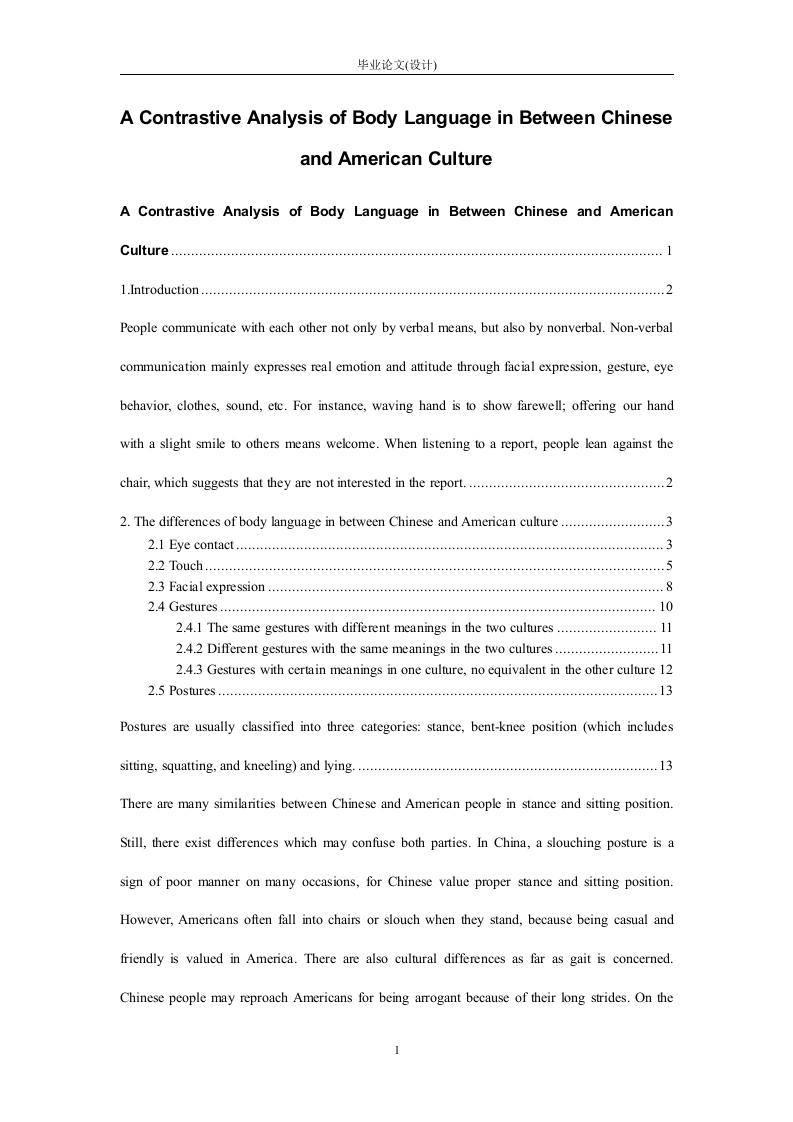 毕业论文(设计)A Contrastive Analysis of Body Language in Between Chineseand American CultureA Contrastive Analysis of Body Language in Between Chinese and AmericanCulture..1.Introduction.…People communicate with each other not only by verbal means,but also by nonverbal.Non-verbalcommunication mainly expresses real emotion and attitude through facial expression,gesture,eyebehavior,clothes,sound,etc.For instance,waving hand is to show farewell;offering our handwith a slight smile to others means welcome.When listening to a report,people lean against thechair,which suggests that they are not interested in the report...........22.The differences of body language in between Chinese and American culture..........................32.1 Eye.32.4 Gestures.…2.4.1 The same gestures with different meanings in the two cultures..112.4.2 Different gestures with the same meanings in the two cultures..........................1.12.4.3 Gestures with certain meanings in one culture,no equivalent in the other culture 12Postures are usually classified into three categories:stance,bent-knee position (which includessitting,squatting,and kneeling)and lying...13There are many similarities between Chinese and American people in stance and sitting position.Still,there exist differences which may confuse both parties.In China,a slouching posture is asign of poor manner on many occasions,for Chinese value proper stance and sitting position.However,Americans often fall into chairs or slouch when they stand,because being casual andfriendly is valued in America.There are also cultural differences as far as gait is concerned.Chinese people may reproach Americans for being arrogant because of their long strides.On the毕业论文(设计)other hand,Chinese people's gait may be thought as shy and timid.The differences are caused bythe simple reason that Americans need more space than Chinese do.Besides,there is anotherunderlying reason:Chinese culture stresses modesty,so it is improper to swagger.Standing witharms akimbo is common in America with neutral meaning.Such a posture may be adopted both bymen and women.Women adopt this posture to show their impatience.However,such a posture isregarded as a threat in China...13Sitting posture is a constant source of cultural misunderstandings.For example:Americans feelvery relaxed at home and in their private offices.They may sometimes sit on the carpeted floor orthe ground.This is taken as a dirty habit in China.When Chinese have to sit on the floor or theground,they invariably spread a handkerchief or a newspaper.Americans in turn would interpretthis to be a dirty habit because to them,handkerchiefs should not be used to mop the floor,norshould newspapers be littered here and there.When American teachers sit on the desk in class tocreate a light atmosphere,Chinese students are often shocked by that.Besides,an American in hisprivate office may lean far back in his chair or even put his legs up on desk when talking on thephone or to other people.To them,it is a sign of being relaxed.A male leader may put his legs upon the desk to show his amicability and friendliness.Nevertheless,such a posture is extremelyFrom these differences,we may note the values,norms,and beliefs of Chinese and American ofculture,which is reflected in the nonverbal codes.In the United States,the emphasis is uponinformality,but Chinese emphasize the good manner reflected in standing or sitting.A well-knownsaying may prove it:(we should)stand as straight as a pine and sit as upright as a bell..............153.The similarities of body language in between Chinese and American culture........................162毕业论文(设计)1.IntroductionPeople communicate with each other not only by verbal means,but also bynonverbal.Non-verbal communication mainly expresses real emotion and attitudethrough facial expression,gesture,eye behavior,clothes,sound,etc.For instance,waving hand is to show farewell;offering our hand with a slight smile to others meanswelcome.When listening to a report,people lean against the chair,which suggeststhat they are not interested in the report.All of us feel that it is more difficult to communicate with the foreigners bytelephone than to do it face to face.This is just because there is no help fromnonverbal or body language.Psychologist estimates that sixty to eighty percent of allcommunication is conducted through non-verbal communication.It's believed that theinformation delivered by a person's appearance and action is much more than that of aperson's words.Birdwhistell,an American scholar,deems that among all means ofexpressing meaning and emotion,more than sixty-five percent is finished throughfacial expression,action,gesture,posture,etc.Some studies in America indicate thatin expressing emotion and attitude,intonation and facial expression can convey morethan ninety-three percent of information while language can only deliver about sevenpercent of information.From the fingers mentioned above,we know that non-verbalcommunication plays an important role in intercultural communication.It can transmitmuch more information and emotion.Body language is a means of non-verbal3