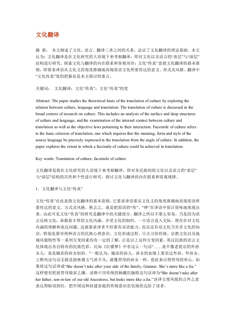 文化翻译摘要:本文阐述了文化、语言、翻译三者之间的关系,论证了文化翻译的理论基础。本文认为:文化翻译是在文化研究的大语境下来考察翻译,即对文化以及语言的“表层”与“深层”结构进行研究,探索文化与翻译的内在联系和客观规律:文化“传真”意指文化翻译的基本准则,即要求译语从文化义的角度准确地再现原语文化所要传达的意义、形式及风格。翻译中“文化传真”度的把握也是本文探讨的重点。关键词:文化翻译:文化“传真”:文化“传真”的度Abstract:The paper studies the theoretical basis of the translation of culture by exploring therelation between culture,language and translation.The translation of culture is discussed in thebroad context of research on culture.This includes an analysis of the surface and deep structuresof culture and language,and the examination of the internal contact between culture andtranslation as well as the objective laws pertaining to their interaction.Facsimile of culture refersto the basic criterion of translation,one which requires that the meaning,form and style of thesource language be precisely expressed in the translation from the angle of culture.In addition,thepaper explores the extent to which a facsimile of culture could be achieved in translation.Key words:Translation of culture;facsimile of culture文化翻译是指在文化研究的大语境下来考察翻译,即对各民族间的文化以及语言的“表层”与“深层”结构的共性和个性进行研究,探讨文化与翻译的内在联系和客观规律。1.文化翻译与文化“传真”文化“传真”在此意指文化翻译的基本原则。它要求译语要从文化义的角度准确地再现原语所要传达的意义、方式及风格。换言之,就是把原语的“形”、“神”在译语中原计原味地体现出来。由此可见文化“传真”的研究是翻译中的关键部分。翻译之所以不那么容易,乃是因为语言反映文化,承载着丰厚的文化内涵,并受文化的制约。一旦语言进入交际,便存在对文化内涵的理解和表达问题。这就要求译者不但要有双语能力,而且还有双文化乃至多文化的知识,特别是要对两种语言的民族心理意识、文化形成过程、历史习俗传统、宗教文化以及地域风貌特性等一系列互变因素均有一定的了解。正是以上这些互变因素,英汉民族的语言文化体现出各自特有的民族色彩。比如《红楼梦》中有这么一句话“...竞不像老祖宗的外孙女儿,竞是嫡亲的孙女似的。”一般认为,嫡亲的孙儿、孙女的血缘上要亲过外孙、外孙女。王熙凤这句话无疑是指林黛玉气质不凡,就像贾母的孙女一样,借此来讨得贾母的欢心。如果将这句话译成“She doesn't take after your side of the family,Grannie.She's more like a Jia.”这样便有贬损贾母娘家之嫌。谙熟中国传统的杨戴伉俪将这句话译为She doesn't take afterher father,son-in-law of our old Ancestress,.but looks more like a Jia.”该译文使凤姐的言外之意表达得贴切到位,把中国这种封建家庭的传统意识忠实地传达给了读者。有时即便对某成语典故的文化含义有所了解,但在翻译中不能根据语境灵活处理,也有可能达不到“传真”的效果。比如a dog in the manger'”常被直译为“狗占马槽”,但用在下面的两例中似乎就不合适了。-Let me have the skates.You don't know how to skate.Don't be a dog in the manger.译文:把冰鞋给我,你不会滑冰,不要狗占马槽。(此句中划线部分应该译成“不要占着茅坑不拉屎”为妥。)There you are the dog in the manger!You won't let him discuss you affairs,and you areannoyed when he talks about his own.译文:你狗占马槽!你不让他谈你的事,可他讲他自己的事你又恼了。(此句中划线部分应译为“你不干还不让别干!”才达意。)英汉两民族的宗教信仰不同,自然也会体现在语言方面。英语中出现的文化主要是基督教文化《圣经》在整个西方文明的形成和发展中起了不可估量的作用。与之相应的是在我国影响极为深远的佛教文化。两种文化在思维习惯上、语言表达形式上,词汇意象和含义上,都有着自己的特色,故翻译时特别要引起注意。例如Hawkes把《红楼梦》中的阿弥陀佛”竞然译成God bless my soul'”,把上帝拿来代替佛教的无量寿佛,这很可能让西方人以为中国人也信奉上帝。这样的译文大大地削减了中国文化内涵。又如“天诛地灭”这一成语运用“天”、“地”作为最高权力的象征,但它只能适用于深受天道观影响的中国,故不能用反映基督教信仰的Go取代。某些含异域感情色彩的词语的翻译也是一个难点。由上可见,“文化翻译”的的确确是在“文化研究的大语境”下做翻译,而文化“传真”是做好文化翻译的关键。2.翻译中文化“传真”度的把握文化“传真”不仅仅指忠实原语,而且是在考虑异域文化的前提下寻求一种最佳的翻译方法。至于什么是它的“度”还没有固定的定规可循,所以如何准确地把握它的尺度还有待译者经过长期的磨砺和探索。笔者拟就双语转换的“度”这个问题从以下三个方面谈谈自己肤浅的认识。2.1探究词语的历史、社会背景意义及文化内涵,准确把握文化“传真”文化翻译既要考虑历史、社会背景,又要注重那些有同有异,大同小异,同中有异的词语,译者要保持清晰的思维,既要注重文化深层的蕴含,又要了解语言表层含义的异同之处。2.1a摆脱性忌讳和性压抑的民族心理制约不同民族的社会风尚,伦理道德的异同,有时也使原文难以予以忠实传译。比如在法国,男女间