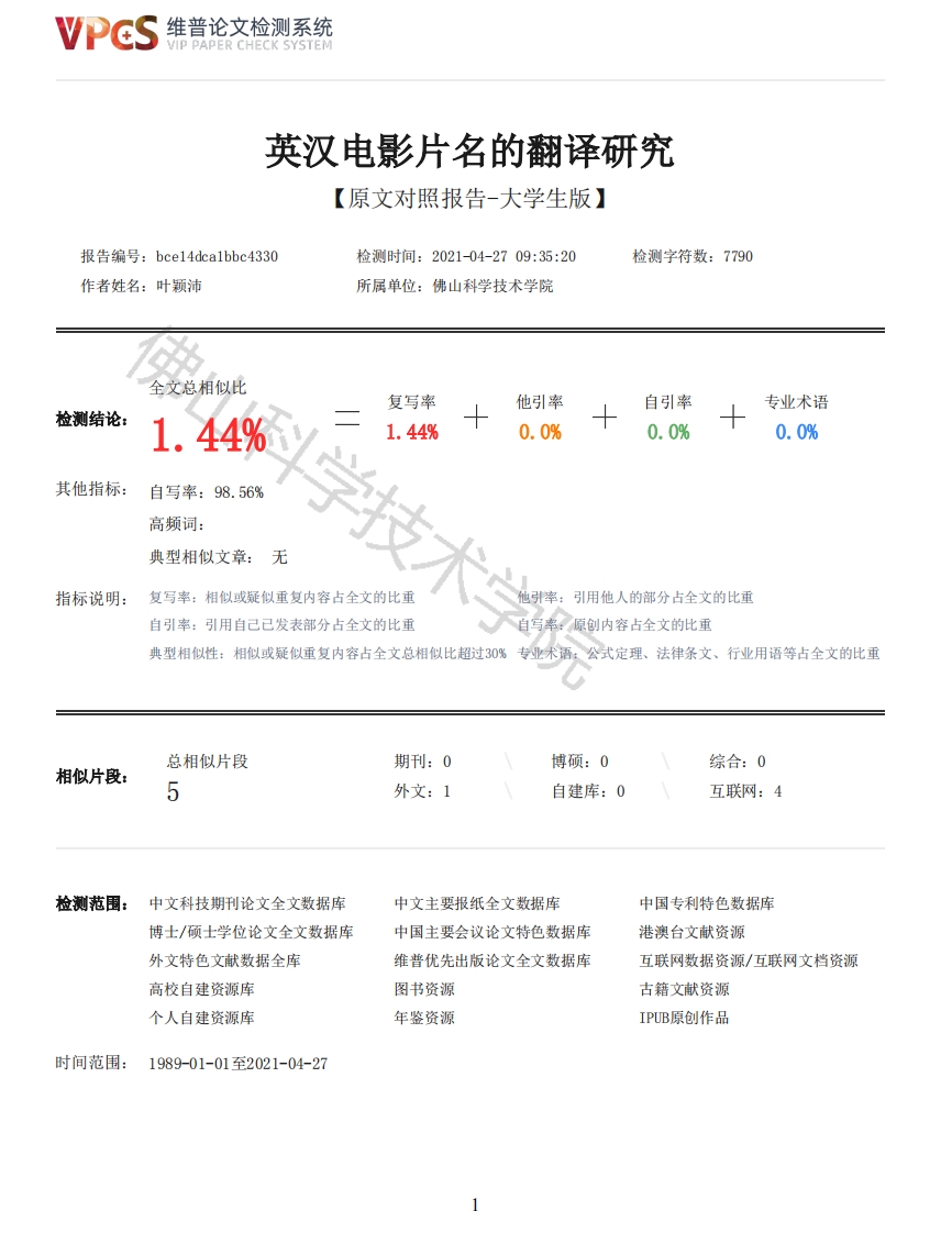 维普论文检测系统VIP PAPER CHECK SYSTEM英汉电影片名的翻译研究【原文对照报告-大学生版】报告编号:bce14 dcalbbc4330检测时间:2021-04-2709:35:20检测字符数:7790作者姓名:叶颖沛所属单位:佛山科学技术学院全文总相似比复写率他引率自引率专业术语检测结论:1.44%1.44%0.0%0.0%0.0%其他指标:自写率:98.56%高频词:典型相似文章:无指标说明:复写率:相似或疑似重复内容占全文的比重引用他人的部分占全文的比重自引率:引用自己已发表部分占全文的比重自写率:原创内容占全文的比重典型相似性:相似或疑似重复内容占全文总相似比超过30%专业术语:公式定理、法律条文、行业用语等占全文的比重总相似片段期刊:0博硕:0综合:0相似片段:5外文:1自建库:0互联网:4检测范围:中文科技期刊论文全文数据库中文主要报纸全文数据库中国专利特色数据库博士/硕士学位论文全文数据库中国主要会议论文特色数据库港澳台文献资源外文特色文献数据全库维普优先出版论文全文数据库互联网数据资源/互联网文档资源高校自建资源库图书资源古籍文献资源个人自建资源库年鉴资源IPUB原创作品时间范围:1989-01-01至2021-04-27维普论文检测系统VIP PAPER CHECK SYSTEM原文对照颜色标注说明:■自写片段■复写片段(相似或疑似重复)口引用片段(引用)■专业术语(公式定理、法律条文、行业用语等)A Study on the Translation of English and Chinese Movie TitlesYE Ying PeiAbstractWith the internationalization of movie culture,title translation naturally becomes a kind ofintercultural communication behavior.As a finishing touch,a good movie title is critical to boththe audience and the market.In view of this,Skopos theory should be applied to movie titletranslation.This paper first describes the characteristics and functions of movie titles,as wellas the differences between English and Chinese movie titles.Then,it gives a brief overview of thecore framework or concept of skopos theory,and analyzes the feasibility of its application in movietitle translation.Combining with the current situation of movie title translation such as multiplenames (a comparison of Chinese translation of English movie titles in mainland China,Hong Kong andTaiwan),from domestication to foreignization,and the "formulaic"translation mode,some feasibletechniques for movie title translation are proposed.It includes four standards of value ofinformation value,cultural value,aesthetic value and commercial value and three methods oftransliteration,literal translation and free translation.In the end,it puts forward threerequirements for translators:(1)Outstanding aesthetic appreciation ability of movies;(2)Goodknowledge of literature:(3)Correct translation mentality.Key words:movie titles;skopos theory:translation strategiesA Study on the Translation of English and Chinese Movie TitlesName:YE Ying Pei No..20170160202C1ass:17英语(师范)2班1.IntroductionThis chapter gives an introduction to the research background,significance and researchquestions of the paper.1.1 Research BackgroundWith the continuous development of globalization,China is increasingly connected with all partsof the world.The introduction of English movies not only enriches people's daily life,but alsopromotes cross-cultural commmunication.As a finishing touch,a good movie title is critical to boththe audience and the market.Based on the Skopos Theory,this paper takes Oscar-winning movies asexamples,analyzes the current situation of movie title translation,summarizes the methods ofEnglish movie title translation into Chinese,and aims to provide new reference for movie titletranslation.1.2 SignificanceThe issue of translation has always been concerned by the outside world.Many translation2维普论文检测系统VIP PAPER CHECK SYSTEMstandards have been put forward by theorists both at home and abroad.For example,Yan Fu's "Xin-Da-Ya”,Zhang Peiji's“Faithfulness and Smoothness”,Newmark's“Semantic Translation”,Nida'"Dynamic Equivalence"and so on.Many scholars have devoted themselves to the translation ofliterary works and technical terms,but the research on the translation of movie titles is few andscattered.There are similarities and differences between English movie titles and Chinese movietiles due to the differences in language culture and way of thinking between China and the west.There are also similarities and differences in Chinese Mainland,Hong Kong and Taiwan movie titletranslation due to linguistic and historical reasons.The innovations of this paper are as follow:first,the selected examples are all Oscar Awardmovies,which is more representative.Second,Chinese translation of English movie titles in Chinesemainland Hong Kong and Taiwan are listed in the form of a table,which is more intuitive.Third,itis of practical significance to summarize the methods of translating English movie titles intoChinese based on the current situation of translation.1.3 Research Questions(1)What are the features and functions of movie titles?(2)What are the differences between English and Chinese movie titles?(3)What are the current situations of movie title translation?(4)What are the suggestions on Chinese translation of English movie titles?2.Features and Functions of Movie TitlesThis chapter explains the features and functions of movie titles,and makes a comparison betweenEnglish and Chinese movie titles.2.1 Features of Movie TitlesCompared with other texts,movie titles not only have the traditional features of language,culture and aesthetics,but also have the unique features of advertising.2.1.1 Language FeatureThe main linguistic feature of movie titles is conciseness,which highly summarizes the contentof movies.A long movie title is often difficult to be remembered and to interest the audiences.Interms of part of speech,Most English movie titles are nouns o