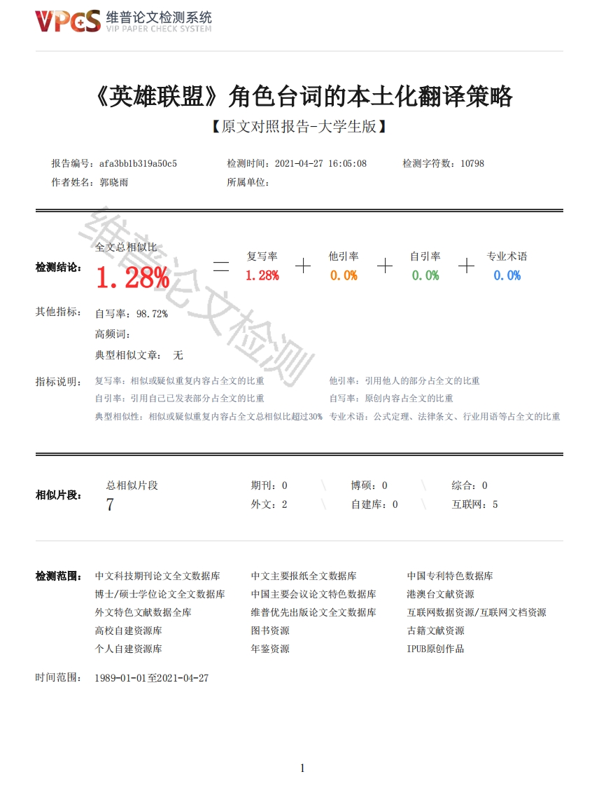 维普论文检测系统/IP PAPER CHECK SYSTEM《英雄联盟》角色台词的本土化翻译策略【原文对照报告-大学生版】报告编号:afa3bb1b319a50c5检测时间:2021-04-2716:05:08检测字符数:10798作者姓名:郭晓雨所属单位:全文总相似比复写率他引率自引率专业术语检测结论:1.28%1.28%0.0%0.0%0.0%其他指标:自写率:98.72%高频词:典型相似文章:无检测指标说明:复写率:相似或疑似重复内容占全文的比重他引率:引用他人的部分占全文的比重自引率:引用自己已发表部分占全文的比重自写率:原创内容占全文的比重典型相似性:相似或疑似重复内容占全文总相似比超过30%专业术语:公式定理、法律条文、行业用语等占全文的比重总相似片段期刊:0博硕:0综合:0相似片段:外文:2自建库:0互联网:5检测范围:中文科技期刊论文全文数据库中文主要报纸全文数据库中国专利特色数据库博士/硕士学位论文全文数据库中国主要会议论文特色数据库港澳台文献资源外文特色文献数据全库维普优先出版论文全文数据库互联网数据资源/互联网文档资源高校自建资源库图书资源古籍文献资源个人自建资源库年鉴资源IPUB原创作品时间范围:1989-01-01至2021-04-27VPGS维普论文检测系统VIP PAPER CHECK SYSTEM原文对照颜色标注说明:■自写片段■复写片段(相似或疑似重复)引用片段(引用)■专业术语(公式定理、法律条文、行业用语等)本科生毕业论文(设计)册学部:外语学部专业:英语年级:2017级1班学生姓名:郭晓雨指导教师:栗文达论文编号:2021230401027二O二一年五月十日河北师范大学汇华学院本科生毕业论文(设计)任务书姓名郭晓雨学部外语专业英语学号2017511999毕业论文(设计)题目《英雄联盟》角色台词的本土化翻译策略指导教师栗文达职称副教授研究方向翻译和文学论文(设计)基本要求:本篇论文将从《英雄联盟》入手,以英文原版台词传入国内后的本土化翻译作为切入点,深入探讨游戏中的本土化翻译策略,并思考本土化翻译策略对于其他游戏翻译的启发,希望能为游戏的本土化翻译提供借鉴基本环节包括:1.了解《英雄联盟》的国内外翻译研究现状。2.观看《英雄联盟》英雄台词系列记录短片和台词介绍,了解掌握大部分英雄角色的台词。3.学习本土化翻译策略,深入分析探究游戏采用的本土化翻译策略。4.撰写论文大纲,分部分仔细研读思考,完成论文的写作。环节1要求:了解创作背景。环节2要求:观看一系列短片,关注创作者对于台词设计及国内译者对于台词翻译的思路。环节3要求:查阅相关资料,以核心期刊、硕博论文为主。环节4要求:明确各个部分的主题,采用针对性的观看,思考整合完成论文写作。学术规范:要求论文论点明确,论据充分,有一定的新意和价值:层次分明,论述清晰:语言流畅,表达自然;书写符合规范,达到字数要求。2维普论文检测系统VIP PAPER CHECK SYSTEM论文(设计)研究目标:此论文旨在从本土化翻译策略这一角度研究《英雄联盟》中的角色台词。本论文以本土化翻译作为切入点,通过对游戏中的台词进行分析,探究其中所采取的本土化翻译策略。主要参考文献:[1]Chesterman,A.1989.Reading in translation theory.Helsinki:0y Finn Lectura Ab.[2]Esselink,B.2000.A practical guide to localization.Amsterdam:John Benjamins PublishingCompany..[3]谭载喜.翻译学[M].湖北.湖北教育出版社,2005.[4]张武江,译创在游戏本地化翻译中的应用[J],现代传播,2013(12):165-166指导教师:年月日教研室主任:年月日注:任务书由学生依据教师指导填写。本表一式三份,学部、指导教师、学生各一份。河北师范大学汇华学院本科生毕业论文(设计)开题报告书姓名郭晓雨学部外语专业英语年级(班)2017级1班论文《英雄联盟》角色台词中的本土化翻译策略指导教师栗文达题目课题《英雄联盟》作为一款MOBA游戏运营的教科书,其本土化翻译策略的采用在其中发挥了作用。《英雄联论证盟》中的不同英雄角色台词采用了不同的本土化翻译策略。方案《英雄联盟》是一款近年发展火热的MOBA游戏。其人物称号,场景以及台词的翻译都运用了不同的翻译方设计式,本文以《英雄联盟》中的英雄角色台词作为切入点,探究本土化翻译策略在其中的应用。2020年12月30日一1月15日确定论文题目和主题2020年1月15日一3月28日毕业论文的初稿写作进度计划2021年4月6日一4月25日进一步修改论文2021年4月日一4月日审阅,修改,交终稿2021年5月中旬论文答辩指导师指导教师:意见年月日教研室意教研室主任:见年月日河北师范大学汇华学院本科生毕业论文(设计)文献综述The research on video games in Chinese academic circles started relatively late,but in thecontext of the rapid expansion of the Chinese video game market and the gradual development of thevideo game industry,Chinese scholars have also made certain achievements in video game research bytranslating and studying the research results of western game science and combining them withChinese practice.Domestic research on video games began in 2003.Using 'video games'as key words,107 researchreports and papers were collected on the CNKI,most of which mainly focus on the two themesincluding the development of the video game industry and the live broadcast of video game.Theresearch subjects are relatively scattered and no independent "video game"subjects have been formed.According to the data shown in the table,among the many studies on video game,those on the3