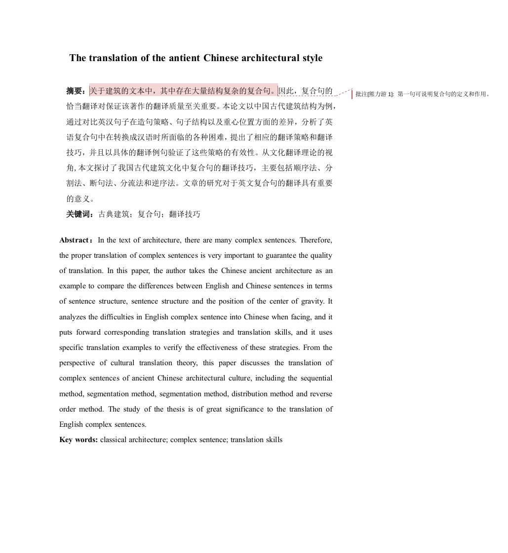 The translation of the antient Chinese architectural style摘要:关于建筑的文本中,其中存在大量结构复杂的复合句。因此,复合句的批注熊力游非第一句可说明复合句的定义和作用。恰当翻译对保证该著作的翻译质量至关重要。本论文以中国古代建筑结构为例,通过对比英汉句子在造句策略、句子结构以及重心位置方面的差异,分析了英语复合句中在转换成汉语时所面临的各种困难,提出了相应的翻译策略和翻译技巧,并且以具体的翻译例句验证了这些策略的有效性。从文化翻译理论的视角,本文探讨了我国古代建筑文化中复合句的翻译技巧,主要包括顺序法、分割法、断句法、分流法和逆序法。文章的研究对于英文复合句的翻译具有重要的意义。关键词:古典建筑:复合句:翻译技巧Abstract:In the text of architecture,there are many complex sentences.Therefore,the proper translation of complex sentences is very important to guarantee the qualityof translation.In this paper,the author takes the Chinese ancient architecture as anexample to compare the differences between English and Chinese sentences in termsof sentence structure,sentence structure and the position of the center of gravity.Itanalyzes the difficulties in English complex sentence into Chinese when facing,and itputs forward corresponding translation strategies and translation skills,and it usesspecific translation examples to verify the effectiveness of these strategies.From theperspective of cultural translation theory,this paper discusses the translation ofcomplex sentences of ancient Chinese architectural culture,including the sequentialmethod,segmentation method,segmentation method,distribution method and reverseorder method.The study of the thesis is of great significance to the translation ofEnglish complex sentences.Key words:classical architecture;complex sentence;translation skillsCatalog2 The basic language features of2 compound sentences.....2.1 sentence composition complex12.2 word order is very different from Chinese.........22.3 sentence making is mainly use the hypotaxis method....3 current problems in the translation of English complex sentences24 the translation of Chinese architectural culture...............44.I Sequential translation.44.3 Segmentation method..4.4 Shunt method.…4.5 Reverse translation.55.Conclusion.…6Reference documentation...............m批注旅力游2小:4.是对于复合句的翻译方法,不是对中国建筑文化的翻译。1 Instruction批注旅力游3引:可将1.2整合为introduction部分,主要简There are great differences between the two languages,Chinese and English.述复合句的定义,功能以及特点。There are one or more independent clause or some components of the subordinateclause in English complex sentence.Time and logical sequence is not exactly thesame between the main clause and subordinate clause in complex sentences ofChinese and English.So their positions are not exactly the same.English has SVOstructure;That is,the time of each component is closely linked through grammar."The seven sentence patterns of English are derived and extended by the SV stablestructure.Chinese has TC structure;that's the topic and the model.This is verydifferent from the sentence structure of English.To grasp this is the premise oftranslation.The treatment of Noun Clauses is translation in regular sequence and the divisionin the translation.At the same time,the sentence level should be adjusted according tothe logic of the sentence.Before translating noun clauses,we must first classify themeaning groups.This can accurately determine the sentence is composed of what批注[據力游4小:此段为名词性从句的翻译,名词性从句属information and then be processed into Chinese sentences based on the information.于复合句的一种,放在此处不合适,Here is more commonly used translation in regular sequence and the division in thetranslation.If close to English and Chinese word order,we can directly use ordinaltranslation.This can not only ensure the transmission of the original information,andit is also more convenient to do.If the English sentence structure and Chinesedifferences too large,at the same time the components are closely connected;Use thedivision in the translation here.We will be connected to the information in accordancewith the characteristics of Chinese that are split into several sentences.So that readerscan easily understand,but also it is in line with the characteristics of Chineselanguage.At the same time,we should find out the logic of the sentence.Because thecharacteristics of the paper are logical,the translation should be logical.The implicitlogic of sentences must be expressed in Translation to ensure that the implicit logiccan be embodied in the translation.Only in this way can we meet the characteristicsof academic papers.2 The basic language features of 2 compound sentences2.1 sentence composition complex"The compound sentence is constituted by a main clause and one or more clausesin the sentence.In a sentence,usually it is the main body of the whole sentence,andcan exist independently;However the clause is a sentence,which cannot existindependently."Although a clause cannot exist alone,it contains a subject and apredicate,just like a sentence.But the difference is that clauses often require anassociated word to guide.Complex sentences can be roughly divided into twocategories:principal and subordinate complex sentences and compound sentences.These two types of complex sentence can be subdivided into several different types ofcomplex sentences,which leads to the difficulty of understanding of the originaltranslation increases,so complex sentence has become a big problem in Englishtranslation.