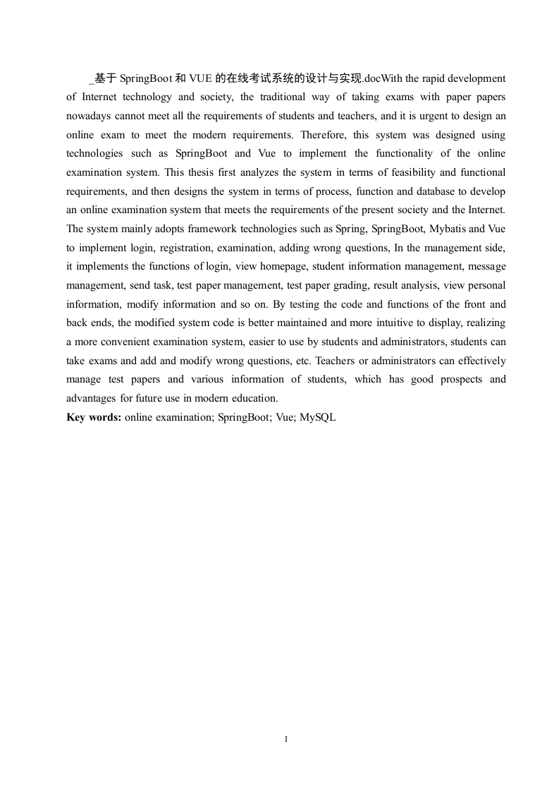 _基于SpringBoot和VUE的在线考试系统的设计与实现.doc With the rapid developmentof Internet technology and society,the traditional way of taking exams with paper papersnowadays cannot meet all the requirements of students and teachers,and it is urgent to design anonline exam to meet the modern requirements.Therefore,this system was designed usingtechnologies such as SpringBoot and Vue to implement the functionality of the onlineexamination system.This thesis first analyzes the system in terms of feasibility and functionalrequirements,and then designs the system in terms of process,function and database to developan online examination system that meets the requirements of the present society and the Internet.The system mainly adopts framework technologies such as Spring,SpringBoot,Mybatis and Vueto implement login,registration,examination,adding wrong questions,In the management side,it implements the functions of login,view homepage,student information management,messagemanagement,send task,test paper management,test paper grading,result analysis,view personalinformation,modify information and so on.By testing the code and functions of the front andback ends,the modified system code is better maintained and more intuitive to display,realizinga more convenient examination system,easier to use by students and administrators,students cantake exams and add and modify wrong questions,etc.Teachers or administrators can effectivelymanage test papers and various information of students,which has good prospects andadvantages for future use in modern education.Key words:online examination;SpringBoot;Vue;MySQL目录第1章绪论1.1现状与发展11.4本章小结.…232.1可行性分析...32.1.1技术可行性2.1.2经济可行性2.1.3操作可行性32.2.1功能需求..32.2.2性能需求2.3.2 SpringBoot...42.3.3Vue技术..42.3.4 MySQL...552.5业务流程图...62.6本章小结.第3章系统设计..83.1功能设计.83.2实体图设计.3.3E-R图设计...93.4数据库物理设计..103.5本章小结.…13144.1登录注册....144.1.1注册功能..144.1.2登陆功能144.1.3修改个人信息164.1.4修改个人密码174.2学生184.2.1考试...184.2.2查看成绩..194.2.3错题管理.·20。204.3.1管理员信息管理204.3.2学生信息管理214.3.3消息信息管理214.3.4公告信息管理224.3.5题型信息管理224.3.6试题信息管理234.3.7答题信息管理..234.3.8发布任务..234.3.9成绩分析.24254.4.1登陆注册运行效果254.4.2学生运行效果274.4.3管理员运行效果..2832335.1测试目的和意义.....335.2测试过程345.3测试用例.345.4测试结论3637参考文献3839