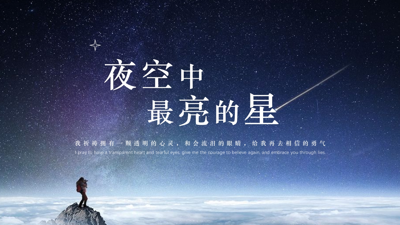 夜空中最亮的星我祈祷拥有兰颗透明的心灵,和会流泪的眼睛,给我再去相信的勇气pray to have a transparent heart and tearful eyes,give me the courage to believe again,and embrace you through lies.目录页我祈祷拥有一颗透明的心灵3我祈祷拥有一颗透明的心灵pray to have a transparent heart and tearful eyes,give methe courage to believe again,and embrace you through lies.the courage to believe again,and embrace you through lies.我祈祷拥有一颗透明的心灵只我祈祷拥有一颗透明的心灵I pray to have a transparent heart and tearful eyes.give mepray to have a transparent heart and tearful eyes,give methe courage to believe again,and embrace you through liesthe courage to believe again,and embrace you through liesI pray to have a transparent.heart and tearful eyes第一节我祈祷拥有一颗透明的心灵,和会流泪的眼睛,给我再去相信的勇气
