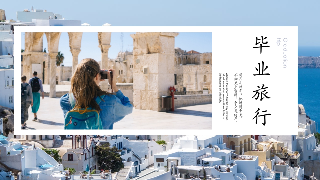 the heavens on this nightdon't know what season it would be inWhen is the moon?Ask the sky for wine不知天上宫阀,今夕是何年明月几时有?把酒问青天。毕业旅行GraduationPART 01年度个人工作概述Please be back in 10 Minutes第一站相见欢·林花谢了春红当火车开入这座陌生的ANOTHER DAY HAS GONE,I'M STILL ALL ALONE城市那是从来就没有见过的霓虹我打开离别时你送第一站相见欢林花谢了春红我的信件ANOTHER DAY HAS GONE,I'M STILL ALL ALONE忽然感到无比的思念看不见雪的冬天不夜的城市第一站相见欢·林花谢了春红我听见有人欢呼有人在ANOTHER DAY HAS GONE,I'M STILL ALL ALONE.哭泣早习惯穿梭冲满诱惑的黑夜但却无法忘记你的脸第一站相见欢•林花谢了春红ANOTHER DAY HAS GONE,I'M STILL ALL ALONE.
