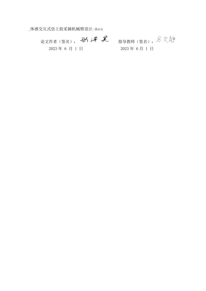体感交互式仿上肢采摘机械臂设计.docx指导教师(签名):房文静2023年6月1日2023年6月1日摘要农业采摘机械臂是提高农业自动化程度和生产效率的重要手段,针对传统农业采摘机械臂控制方式单一、与用户的交互性和控制效率较低的问题,提出并设计一种基于仿生学,能够实时模仿上肢采摘行为的体感交互式仿上肢机械臂系统。系统采用ST32微处理器作为主控芯片,采用6个舵机构建六轴仿生机械臂结构。红外接收器模块获取人体手臂姿态信息,通过无线收发芯片实现手臂姿态的无线传输:机械臂接收端完成手臂姿态的无线接收及解析,从而控制机械臂模仿人体上肢的动作。试验结果表明,系统对仿人体机械臂动作的平均识别率为96%以上,动作跟随的平均响应时间为2-3s,能够按照人体手臂的运动轨迹做出相应的模拟动作,跟随人体手臂完成各种抓握、屈伸、旋转等动作,较好地实现仿上肢采摘机械臂的功能关键词:STM32;体感交互;机械臂;手臂姿态;采摘ABSTRACTAiming at the problems of single control mode,interaction with users and low controlefficiency of traditional agricultural picking manipulator,a somatosensory interactive imitationupper limb manipulator system based on bionics that can imitate upper limb picking behavior inreal time is proposed and designed.The system adopts STM32 microprocessor as the main controlchip,and uses 6 servos to build a six-axis bionic robotic arm structure.The infrared receiver moduleobtains the human arm posture information,and realizes the wireless transmission of the armposture through the wireless transceiver chip;The receiving end of the robotic arm completes thewireless reception and analysis of the arm posture,thereby controlling the robotic arm to imitate themovements of the upper limbs of the human body.The test results show that the average recognitionrate of the system's human-like robotic arm is more than 96%,and the average response time ofaction following is 2-3s,which can make corresponding simulated actions according to themovement trajectory of the human arm,follow the human arm to complete various grasping,flexion,rotation and other actions,and better realize the function of imitating upper limb picking roboticarm.Key words:STM32;Somatosensory interaction;Mechanical arm;Arm posture;pick