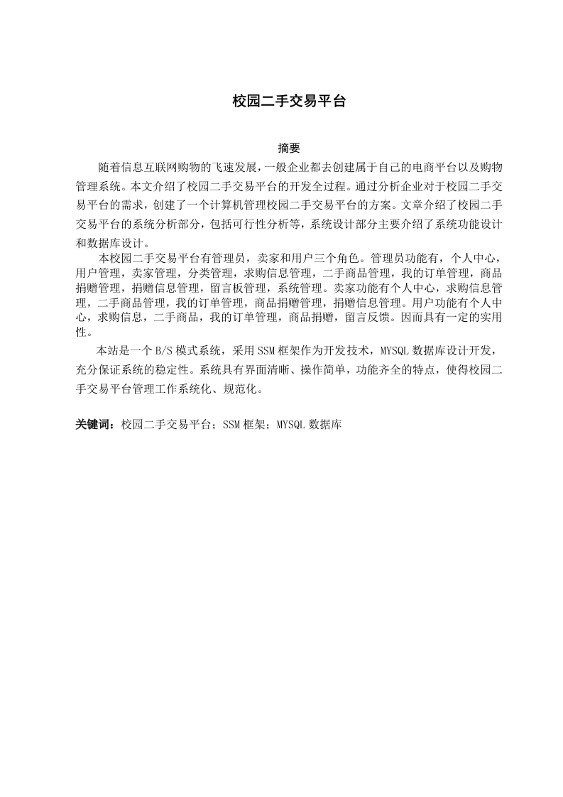 校园二手交易平台摘要随着信息互联网购物的飞速发展,一般企业都去创建属于自己的电商平台以及购物管理系统。本文介绍了校园二手交易平台的开发全过程。通过分析企业对于校园二手交易平台的需求,创建了一个计算机管理校园二手交易平台的方案。文章介绍了校园二手交易平台的系统分析部分,包括可行性分析等,系统设计部分主要介绍了系统功能设计和数据库设计。本校园二手交易平台有管理员,卖家和用户三个角色。管理员功能有,个人中心,用户管理,卖家管理,分类管理,求购信息管理,二手商品管理,我的订单管理,商品捐赠管理,捐赠信息管理,留言板管理,系统管理。卖家功能有个人中心,求购信息管理,二手商品管理,我的订单管理,商品捐赠管理,捐赠信息管理。用户功能有个人中心,求购信息,二手商品,我的订单管理,商品捐赠,留言反馈。因而具有一定的实用性。本站是一个B/S模式系统,采用SSM框架作为开发技术,MYSQL数据库设计开发,充分保证系统的稳定性。系统具有界面清晰、操作简单,功能齐全的特点,使得校园二手交易平台管理工作系统化、规范化。关键词:校园二手交易平台:SSM框架;MYSQL数据库AbstractWith the rapid development of information Internet shopping,most companiescreate their own e-commerce platforms and shopping management systems.Thisarticle introduces the whole process of the development of the campussecond-hand trading platform.By analyzing the needs of enterprises for thecampus second-hand trading platform,a program of computer management of thecampus second-hand trading platform was created.The article introduces thesystem analysis part of the campus second-hand trading platform,includingfeasibility analysis,etc.The system design part mainly introduces the systemfunction design and database design.This campus second-hand trading platform has three roles:administrator,seller and user.Administrator functions include personal center,usermanagement,seller management,classification management,purchase informationmanagement,second-hand product management,my order management,commoditydonation management,donation information management,message board management,and system management.Seller functions include personal center,purchaseinformation management,second-hand product management,my order management,product donation management,and donation information management.Userfunctions include personal center,purchase information,second-hand goods,myorder management,goods donation,and message feedback.So it has a certainpracticability.This site is a B/S model system,using SSM framework as the developmenttechnology,MYSQL database design and development,fully guarantee thestability of the system.The system has the characteristics of clear interface,simple operation and complete functions,which makes the management of thecampus second-hand trading platform systematized and standardized.Keywords:Campus second-hand trading platform;SSM framework;MYSQLdatabase目录校园二手交易平台1系统概述…1.1研究背景1.2研究目的13系统设计思想…2相关技术32.1 MYSQL数据库32.2B/S结构32.3SSM框架简介43系统分析…3.1可行性分析….63.1.1技术可行性.63.1.2经济可行性3.1.3操作可行性73.2系统性能分析.3.2.1系统安全性73.2.2数据完整性3.3系统界面分析…3.4系统流程和逻辑…4系统概要设计…4.1概述…4.2系统结构4.3.数据库设计4.3.1数据库实体.124.3.2数据库设计表5系统详细实现195.1管理员模块的实现5.1.1留言板管理.195.1.2求购信息管理.205.1.3二手商品管理.205.2卖家模块的实现215.2.1发布二手商品5.2.2个人信息5.3用户模块的实现225.3.1求购信息225.3.2二手商品.225.3.3商品捐赠….23
