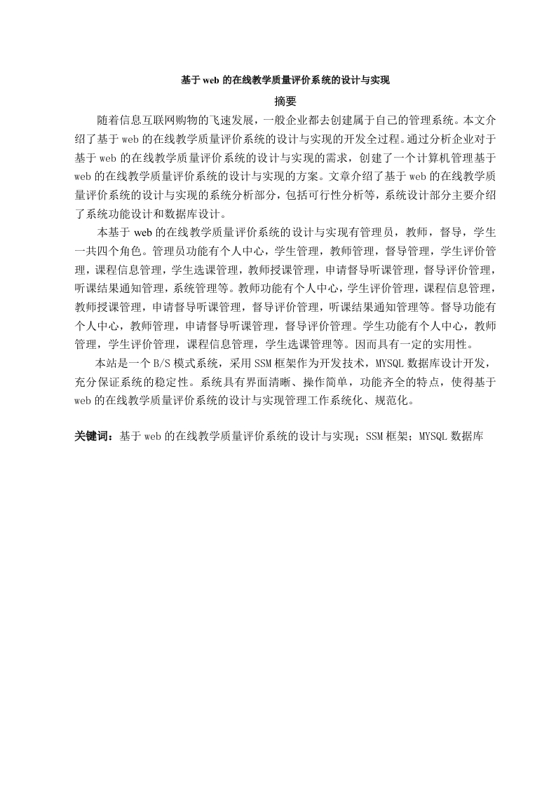 基于web的在线教学质量评价系统的设计与实现摘要随着信息互联网购物的飞速发展,一般企业都去创建属于自己的管理系统。本文介绍了基于web的在线教学质量评价系统的设计与实现的开发全过程。通过分析企业对于基于web的在线教学质量评价系统的设计与实现的需求,创建了一个计算机管理基于web的在线教学质量评价系统的设计与实现的方案。文章介绍了基于web的在线教学质量评价系统的设计与实现的系统分析部分,包括可行性分析等,系统设计部分主要介绍了系统功能设计和数据库设计。本基于wb的在线教学质量评价系统的设计与实现有管理员,教师,督导,学生一共四个角色。管理员功能有个人中心,学生管理,教师管理,督导管理,学生评价管理,课程信息管理,学生选课管理,教师授课管理,申请督导听课管理,督导评价管理,听课结果通知管理,系统管理等。教师功能有个人中心,学生评价管理,课程信息管理,教师授课管理,申请督导听课管理,督导评价管理,听课结果通知管理等。督导功能有个人中心,教师管理,申请督导听课管理,督导评价管理。学生功能有个人中心,教师管理,学生评价管理,课程信息管理,学生选课管理等。因而具有一定的实用性本站是一个B/S模式系统,采用SSM框架作为开发技术,MYSQL数据库设计开发,充分保证系统的稳定性。系统具有界面清晰、操作简单,功能齐全的特点,使得基于web的在线教学质量评价系统的设计与实现管理工作系统化、规范化。关键词:基于w©b的在线教学质量评价系统的设计与实现:SSM框架:MYSQL数据库AbstractWith the rapid development of information Internet shopping,most companiescreate their own management systems.This article introduces the whole processof the design and implementation of the web-based online teaching qualityevaluation system.By analyzing the needs of enterprises for the design andimplementation of a web-based online teaching quality evaluation system,acomputer-managed web-based online teaching quality evaluation system design andimplementation plan was created.The article introduces the system analysis partof the design and implementation of the web-based online teaching qualityevaluation system,including feasibility analysis,etc.The system design partmainly introduces the system function design and database design.The design and implementation of this web-based online teaching qualityevaluation system has four roles:administrator,teacher,supervisor,andstudent.The administrator functions include personal center,studentmanagement,teacher management,supervision management,student evaluationmanagement,course information management,student selection management,teacher teaching management,application for supervision and evaluationmanagement,supervision and evaluation management,notification management oflecture results,system management,etc.Teacher functions include personalcenter,student evaluation management,course information management,teacherteaching management,application supervision and listening management,supervision and evaluation management,and notification management of listeningresults.Supervision functions include personal center,teacher management,application supervision and attendance management,supervision and evaluationmanagement.Student functions include personal center,teacher management,student evaluation management,course information management,studentselection management,etc.So it has a certain practicability.This site is a B/S model system,using SSM framework as the developmenttechnology,MYSQL database design and development,fully guarantee thestability of the system.The system has the characteristics of clear interface,simple operation and complete functions,which makes the design andimplementation of the web-based online teaching quality evaluation systemsystematized and standardized.Keywords:Design and implementation of web-based online teaching qualityevaluation system;SSM framework;MYSQL database目录1.1研究背景1.2研究目的1.3系统设计思想2相关技术.…32.1 MYSQL数据库32.2B/S结构2.3SSM框架简介3系统分析…63.1可行性分析3.1.1技术可行性3.1.2经济可行性63.1.3操作可行性3.2系统性能分析73.2.1系统安全性73.2.2数据完整性73.3系统界面分析…3.4系统流程和逻辑4系统概要设计.…4.1概述104.2系统结构.114.3.数据库设计4.3.1数据库实体4.3.2数据库设计表.155系统详细实现.205.1管理员模块的实现,.205.1.1学生信息管理.205.1.2教师信息管理215.1.3督导信息管理5.2教师模块的实现