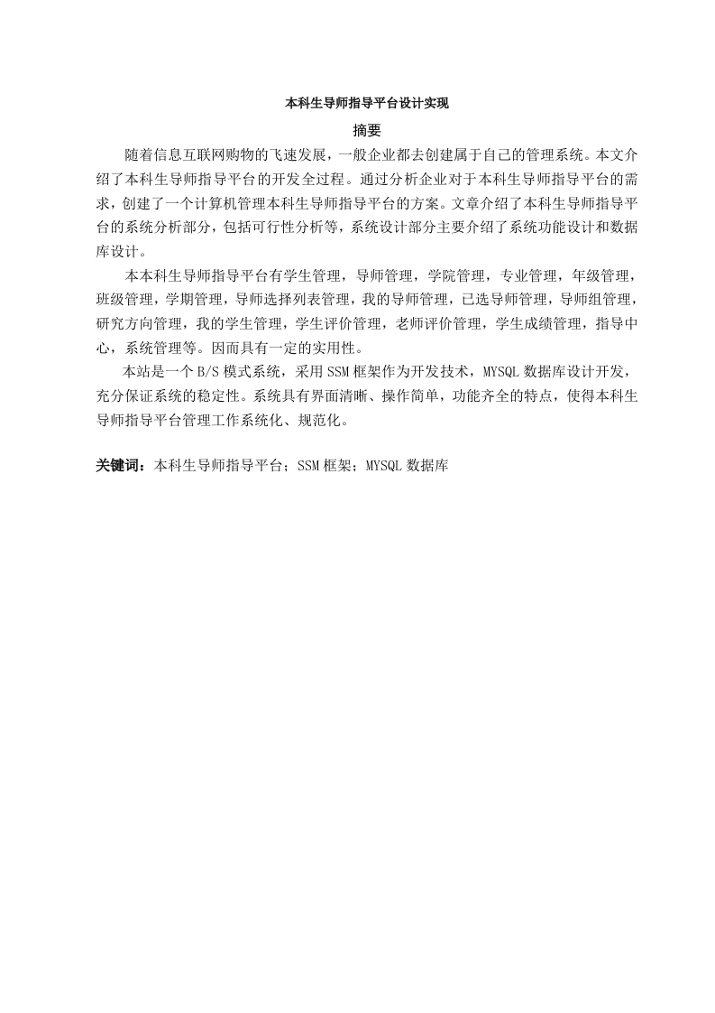 本科生导师指导平台设计实现摘要随着信息互联网购物的飞速发展,一般企业都去创建属于自己的管理系统。本文介绍了本科生导师指导平台的开发全过程。通过分析企业对于本科生导师指导平台的需求,创建了一个计算机管理本科生导师指导平台的方案。文章介绍了本科生导师指导平台的系统分析部分,包括可行性分析等,系统设计部分主要介绍了系统功能设计和数据库设计。本本科生导师指导平台有学生管理,导师管理,学院管理,专业管理,年级管理,班级管理,学期管理,导师选择列表管理,我的导师管理,已选导师管理,导师组管理,研究方向管理,我的学生管理,学生评价管理,老师评价管理,学生成绩管理,指导中心,系统管理等。因而具有一定的实用性。本站是一个B/S模式系统,采用SSM框架作为开发技术,MYSQL数据库设计开发,充分保证系统的稳定性。系统具有界面清晰、操作简单,功能齐全的特点,使得本科生导师指导平台管理工作系统化、规范化。关键词:本科生导师指导平台:SSM框架:MYSQL数据库AbstractWith the rapid development of information Internet shopping,most companiescreate their own management systems.This article introduces the wholedevelopment process of the undergraduate tutor guidance platform.By analyzingthe needs of enterprises for undergraduate tutor guidance platform,a programof computer management undergraduate tutor guidance platform was created.Thearticle introduces the system analysis part of the undergraduate tutor guidanceplatform,including feasibility analysis,etc.The system design part mainlyintroduces the system function design and database design.The undergraduate tutor guidance platform includes student management,tutor management,college management,professional management,age management,class management,semester management,tutor selection list management,mytutor management,selected tutor management,tutor group management,researchdirection management My student management,student evaluation management,teacher evaluation management,student performance management,guidance center,system management,etc.So it has a certain practicability.This site is a B/S mode system,using SSM framework as the developmenttechnology,MYSQL database design and development,fully guarantee thestability of the system.The system has the characteristics of clear interface,simple operation and complete functions,which makes the undergraduate tutorsguide the platform management work systematically and standardized.Keywords:Undergraduate tutor guidance platform:SSM framework;MYSQLdatabase目录1系统概述.1.1研究背景1.2研究目的1.3系统设计思想2相关技术…32.1 MYSQL数据库2.2B/S结构2.3SSM框架简介43系统分析.63.1可行性分析3.1.1技术可行性3.1.2经济可行性3.1.3操作可行性73.2系统性能分析.…3.2.1系统安全性3.2.2数据完整性73.3系统界面分析73.4系统流程和逻辑94系统概要设计.104.1概述.…104.2系统结构4.3.数据库设计114.3.1数据库实体114.3.2数据库设计表.135系统详细实现5.1管理员模块的实现5.1.1学生管理.195.1.2年级管理.195.1.3我的导师.205.2学生模块的实现…5.2.1导师选择列表5.2.2已选导师管理5.2.3我的导师管理.216系统测试.226.1概念和意义226.2特性.226.3重要性….236.4测试方法….236.5功能测试236.6可用性测试.246.7性能测试246.8测试分析.25