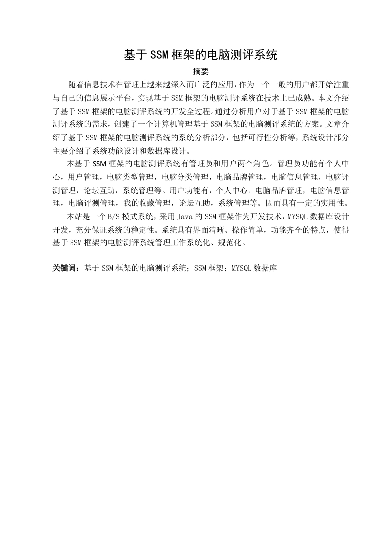 基于SSM框架的电脑测评系统摘要随着信息技术在管理上越来越深入而广泛的应用,作为一个一般的用户都开始注重与自己的信息展示平台,实现基于SSM框架的电脑测评系统在技术上已成熟。本文介绍了基于SSM框架的电脑测评系统的开发全过程。通过分析用户对于基于SSM框架的电脑测评系统的需求,创建了一个计算机管理基于SSM框架的电脑测评系统的方案。文章介绍了基于SSM框架的电脑测评系统的系统分析部分,包括可行性分析等,系统设计部分主要介绍了系统功能设计和数据库设计。本基于SSM框架的电脑测评系统有管理员和用户两个角色。管理员功能有个人中心,用户管理,电脑类型管理,电脑分类管理,电脑品牌管理,电脑信息管理,电脑评测管理,论坛互助,系统管理等。用户功能有,个人中心,电脑品牌管理,电脑信息管理,电脑评测管理,我的收藏管理,论坛互助,系统管理等。因而具有一定的实用性。本站是一个B/S模式系统,采用Java的SSM框架作为开发技术,MYSQL数据库设计开发,充分保证系统的稳定性。系统具有界面清晰、操作简单,功能齐全的特点,使得基于SSM框架的电脑测评系统管理工作系统化、规范化关键词:基于SSM框架的电脑测评系统:SSM框架:MYSQL数据库AbstractWith the more and more in-depth and extensive application of informationtechnology in management,as a general user,they have begun to pay attentionto their own information display platform,and the realization of a computerevaluation system based on the SSM framework is technically mature.This articleintroduces the whole development process of computer evaluation system basedon SSM framework.By analyzing the user's needs for a computerized evaluationsystem based on the SSM framework,a program for computer management of thecomputerized evaluation system based on the SSM framework was created.Thearticle introduces the system analysis part of the computer evaluation systembased on the SSM framework,including feasibility analysis,etc.The systemdesign part mainly introduces the system function design and database design.The computer evaluation system based on the SSM framework has two roles:administrator and user.Administrator functions include personal center,usermanagement,computer type management,computer classification management,computer brand management,computer information management,computerevaluation management,forum mutual assistance,system management,etc.Userfunctions include personal center,computer brand management,computerinformation management,computer evaluation management,my collectionmanagement,forum mutual assistance,system management,etc.So it has a certainpracticability.This site is a B/S model system,using Java's SSM framework as thedevelopment technology,and MYSQL database design and development,which fullyguarantees the stability of the system.The system has the characteristics ofclear interface,simple operation and complete functions,which makes themanagement of the computer evaluation system based on the SSM frameworksystematized and standardized.Keywords:Computer evaluation system based on SSM framework;SSM framework;MYSQL database目录1系统概述…1.1研究背景11.2研究目的11.3系统设计思想2相关技术…22.1 MYSQL数据库.22.2B/S结构.32.3SSM框架简介3系统分析3.1可行性分析63.1.1技术可行性3.1.2经济可行性63.1.3操作可行性3.2系统性能分析…73.2.1系统安全性3.2.2数据完整性3.3系统界面分析…73.4系统流程和逻辑94系统概要设计…4.2系统结构.114.3.数据库设计124.3.1数据库实体124.3.2数据库设计表.145系统详细实现…5.1管理员模块的实现….185.1.1用户信息管理5.1.2电脑类型管理5.1.3电脑信息管理195.2用户模块的实现205.2.1前台首页.205.2.2电脑评测…205.2.3我的收藏.216系统测试…6.1概念和意义216.2特性…226.3重要性.