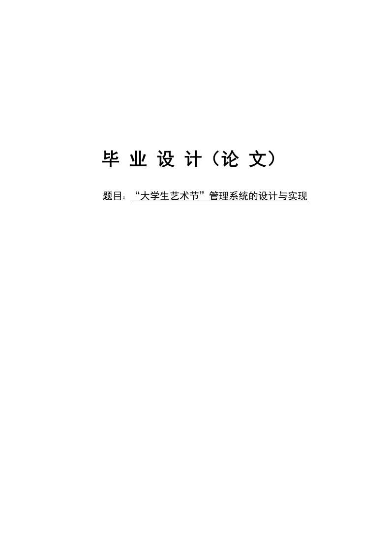 毕业设计(论文)题目:“大学生艺术节”管理系统的设计与实现摘要互联网发展至今,无论是其理论还是技术都已经成熟,而且它广泛参与在社会中的方方面面。它让信息都可以通过网络传播,搭配信息管理工具可以很好地为人们提供服务。针对“大学生艺术节”方面的信息管理混乱,出错率高,信息安全性差,劳动强度大,费时费力等问题,采用“大学生艺术节”管理系统可以有效管理,使信息管理能够更加科学和规范。“大学生艺术节”管理系统在Eclipse环境中,使用Java语言进行编码,使用Mysql创建数据表保存本系统产生的数据。系统可以提供信息显示和相应服务,其管理员管理表演项目,比赛项目,比赛结果以及节前信息,管理表演项目以及比赛项目报名信息。用户参与表演项目与比赛项目的报名,对表演项目与比赛项目进行收藏和留言。总之,“大学生艺术节”管理系统集中管理信息,有着保密性强,效率高,存储空间大,成本低等诸多优点。它可以降低信息管理成本,实现信息管理计算机化。关键词:“大学生艺术节”管理系统:Java语言;MysqlAbstractSince the development of the Internet,both its theory and technology havematured,and it has been widely involved in all aspects of society.It allowsinformation to be disseminated through the Internet,and it can serve people well withinformation management tools.In view of the chaotic information management of the"College Student Art Festival",high error rate,poor information security,high laborintensity,time-consuming and laborious problems,the use of the "College Student ArtFestival"management system can effectively manage and make informationmanagement more scientific and standardized.The management system of "College Students Art Festival"is in the Eclipseenvironment,using Java language for coding,using Mysql to create data tables tosave the data generated by the system.The system can provide information displayand corresponding services.Its administrator manages performances,competitions,competition results and pre-holiday information,and manages performances andcompetition registration information.Users participate in the registration ofperformances and competitions,and collect and leave messages for performances andcompetitions.In short,the "College Student Art Festival"management system centralizedmanagement information,has many advantages such as strong confidentiality,highefficiency,large storage space,and low cost.It can reduce the cost of informationmanagement and realize the computerization of information management.Key Words "College Students Art Festival"management system;Java language;Mysql