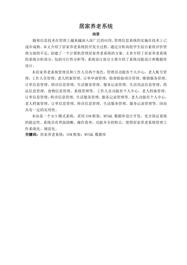 居家养老系统摘要随着信息技术在管理上越来越深入而广泛的应用,管理信息系统的实施在技术上已逐步成熟。本文介绍了居家养老系统的开发全过程。通过分析高校学生综合素质评价管理方面的不足,创建了一个计算机管理居家养老系统的方案。文章介绍了居家养老系统的系统分析部分,包括可行性分析等,系统设计部分主要介绍了系统功能设计和数据库设计。本居家养老系统管理员和工作人员两个角色。管理员功能有个人中心,老人账号管理,工作人员管理,老人档案管理,订单申请管理,检查检验项目管理,维修服务管理,订单信息管理,转诊信息管理,生活服务管理,服务记录管理,生活用品信息管理,药品信息管理,食物信息管理,系统管理等。工作人员功能有个人中心,老人档案管理,订单信息管理,转诊信息管理,生活服务管理,服务记录管理等。老人功能有个人中心,老人档案管理,订单信息管理,转诊信息管理,生活服务管理,服务记录管理等。因而具有一定的实用性。本站是一个B/S模式系统,采用SSM框架,MYSQL数据库设计开发,充分保证系统的稳定性。系统具有界面清晰、操作简单,功能齐全的特点,使得居家养老系统管理工作系统化、规范化。关键词:居家养老系统:SSM框架;MYSQL数据库AbstractWith the deepening and extensive application of information technology inmanagement,the implementation of management information systems has graduallymatured in technology.This article introduces the whole process of thedevelopment of the home care system.By analyzing the deficiencies in themanagement of comprehensive quality evaluation of college students,acomputer-managed home care system was created.The article introduces the systemanalysis part of the home care system,including feasibility analysis,etc.Thesystem design part mainly introduces the system function design and databasedesign.The two roles of the home care system administrator and staff.Administratorfunctions include personal center,elderly account management,staff management,elderly file management,order application management,inspection projectmanagement,maintenance service management,order information management,referral information management,life service management,service recordmanagement,life Supply information management,drug information management,food information management,system management,etc.Staff functions includepersonal center,elderly file management,order information management,referral information management,life service management,service recordmanagement,etc.The functions of the elderly include personal center,elderlyfile management,order information management,referral information management,life service management,service record management,etc.So it has a certainpracticability.This site is a B/S mode system,using SSM framework,MYSQL database designand development,fully guarantee the stability of the system.The system hasthe characteristics of clear interface,simple operation and complete functions,which makes the management of the home care system systematized andstandardized.Keywords:Home care system;SSM framework:MYSQL database目录1系统概述…1.1研究背景1.2研究目的1.3系统设计思想2相关技术…2.1 MYSQL数据库22.2B/S结构.2.3SSM框架简介3系统分析…3.1可行性分析…3.1.1技术可行性3.1.2经济可行性.63.1.3操作可行性3.2系统性能分析…3.2.1系统安全性3.2.2数据完整性73.3系统界面分析…73.4系统流程和逻辑94系统概要设计.…4.1概述…4.2系统结构4.3.数据库设计124.3.1数据库实体4.3.2数据库设计表.135系统详细实现…195.1管理员模块的实现….195.1.1老人账号管理5.1.2工作人员管理…205.2工作人员模块的实现.215.2.1老人档案管理5.2.1转诊信息管理.215.2老人功能模块的实现225.2.2首页….225.2.3订单申请…225.2.3转诊信息6系统测试…236.1概念和意义.….23