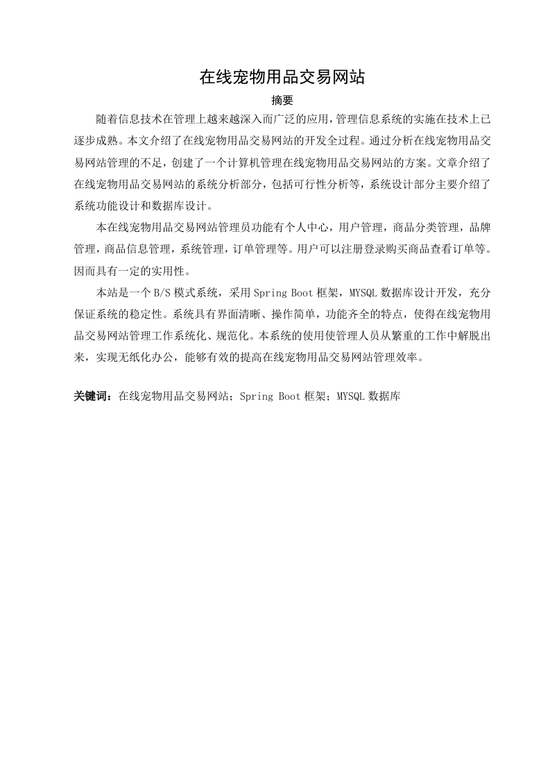 在线宠物用品交易网站摘要随着信息技术在管理上越来越深入而广泛的应用,管理信息系统的实施在技术上已逐步成熟。本文介绍了在线宠物用品交易网站的开发全过程。通过分析在线宠物用品交易网站管理的不足,创建了一个计算机管理在线宠物用品交易网站的方案。文章介绍了在线宠物用品交易网站的系统分析部分,包括可行性分析等,系统设计部分主要介绍了系统功能设计和数据库设计。本在线宠物用品交易网站管理员功能有个人中心,用户管理,商品分类管理,品牌管理,商品信息管理,系统管理,订单管理等。用户可以注册登录购买商品查看订单等。因而具有一定的实用性。本站是一个B/S模式系统,采用Spring Boot框架,MYSQL数据库设计开发,充分保证系统的稳定性。系统具有界面清晰、操作简单,功能齐全的特点,使得在线宠物用品交易网站管理工作系统化、规范化。本系统的使用使管理人员从繁重的工作中解脱出来,实现无纸化办公,能够有效的提高在线宠物用品交易网站管理效率。关键词:在线宠物用品交易网站;Spring Boot框架;MYSQL数据库AbstractWith the deepening and extensive application of information technology inmanagement,the implementation of management information systems has graduallymatured in technology.This article introduces the entire development processof an online pet supplies trading website.By analyzing the deficiencies in themanagement of online pet supplies trading sites,a computer-managed online petsupplies trading site program was created.The article introduces the systemanalysis part of the online pet supplies trading website,including feasibilityanalysis,etc.The system design part mainly introduces the system functiondesign and database design.The administrator functions of this online pet supplies trading websiteinclude personal center,user management,commodity classification management,brand management,commodity information management,system management,ordermanagement,etc.Users can register and log in to purchase goods to view orders,etc.So it has a certain practicability.This site is a B/S model system,using Spring Boot framework,MYSQL databasedesign and development,fully guarantee the stability of the system.The systemhas the characteristics of clear interface,simple operation and completefunctions,which makes the management of online pet supplies trading websitessystematized and standardized.The use of this system frees managers from heavywork,realizes a paperless office,and can effectively improve the managementefficiency of online pet supplies trading websites.Keywords:Online pet supplies trading website;Spring Boot framework;MYSQLdatabase目录1系统概述…1.1研究背景1.2研究目的…11.3系统设计思想…2相关技术…22.1 MYSQL数据库2.2B/S结构2.3 Spring Boot框架简介43系统分析…43.1可行性分析.…3.1.1技术可行性43.1.2经济可行性53.1.3操作可行性3.2系统性能分析…53.2.1系统安全性53.2.2数据完整性3.3系统界面分析…63.4系统流程和逻辑4系统概要设计84.1概述.…84.2系统结构…4.3.数据库设计4.3.1数据库实体94.3.2数据库设计表115系统详细实现.….155.1管理员模块的实现.155.1.1用户信息管理.155.1.2商品分类管理.155.1.3品牌信息管理165.1.4商品信息管理165.2用户模块的实现5.2.1商品信息.175.2.2我的收藏.185.2.3我的订单.19.206.1概念和意义.206.2特性.206.3重要性.…216.4测试方法..…216.5功能测试226.6可用性测试6.7性能测试.