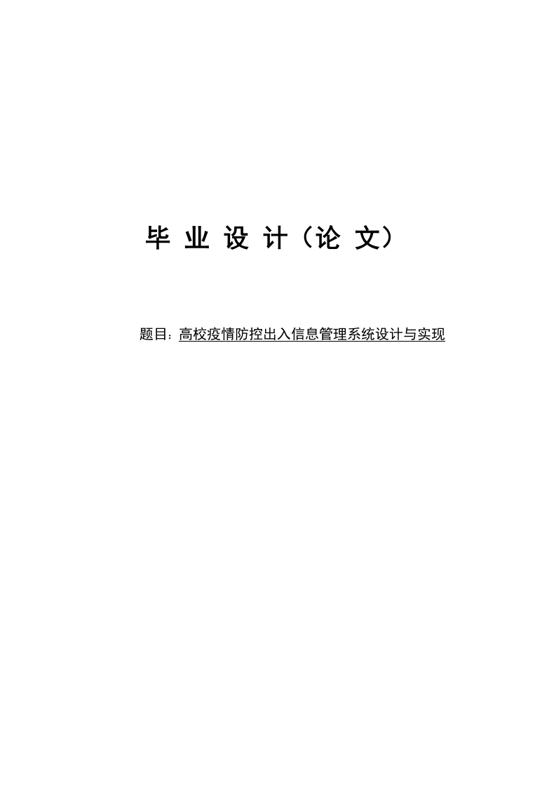 毕业设计(论文)题目:高校疫情防控出入信息管理系统设计与实现摘要现代经济快节奏发展以及不断完善升级的信息化技术,让传统数据信息的管理升级为软件存储,归纳,集中处理数据信息的管理方式。本高校疫情防控出入信息管理系统就是在这样的大环境下诞生,其可以帮助管理者在短时间内处理完毕庞大的数据信息,使用这种软件工具可以帮助管理人员提高事务处理效率,达到事半功倍的效果。此高校疫情防控出入信息管理系统利用当下成熟完善的SSM框架,使用跨平台的可开发大型商业网站的Java语言,以及最受欢迎的RDBMS应用软件之一的Mysql数据库进行程序开发.高校疫情防控出入信息管理系统的开发根据操作人员需要设计的界面简洁美观,在功能模块布局上跟同类型网站保持一致,程序在实现基本要求功能时,也为数据信息面临的安全问题提供了一些实用的解决方案。可以说该程序在帮助管理者高效率地处理工作事务的同时,也实现了数据信息的整体化,规范化与自动化。关键词:高校疫情防控出入信息管理系统:SSM框架;Mysql;自动化AbstractThe fast-paced development of the modern economy and the continuousimprovement and upgrading of information technology have allowed the managementof traditional data information to be upgraded to software storage,induction,andcentralized management of data information.This book lending system was born insuch a large environment,which can help managers to process huge data informationin a short time.Using this software tool can help managers improve transactionprocessing efficiency and achieve double the result with half the effort.This booklending system uses the current mature and perfect SSM framework,cross-platformJava language that can be used to develop large-scale commercial websites,andMysql database,one of the most popular RDBMS application software,for programdevelopment.It realizes the functions of book basic data management,bookborrowing and return,review of registered teacher information,and announcementinformation release.The development of the book lending system is designed to besimple and beautiful according to the needs of the operator.The layout of the functionmodule is consistent with the same type of website.When the program realizes thebasic requirements,it also provides some practical solutions for the security problemsfaced by the data information..It can be said that this program not only helpsmanagers efficiently handle work affairs,but also realizes the integration,standardization and automation of data information.Key Words:Book borrowing system;SSM framework;Mysql;automation