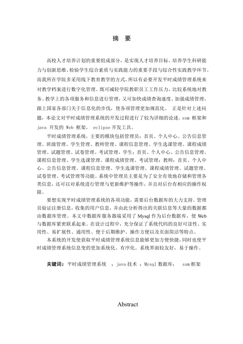 摘要高校人才培养计划的重要组成部分,是实现人才培养目标、培养学生科研能力与创新思维、检验学生综合素质与实践能力的重要手段与综合性实践教学环节。而我所在学院多采用线下教育教学的方式,所以有必要开发平时成绩管理系统来对教学档案进行数字化管理。既可减轻学院教职员工工作压力,比较系统地对教务、教学上的各项服务和信息进行管理,又可加快成绩查询速度、加强成绩管理,跟上国家各部门关于信息化的步伐,使各项管理更加规范化。正是针对上述问题,本论文对平时成绩管理系统的开发过程进行了较为详细的论述,ssm框架和java开发的Web框架,eclipse开发工具。平时成绩管理系统,主要的模块包括管理员;首页、个人中心、公告信息管理、班级管理、学生管理、教师管理、课程信息管理、学生选课管理、课程成绩管理、试题管理、试卷管理、考试管理,学生:首页、个人中心、公告信息管理、课程信息管理、学生选课管理、课程成绩管理、考试管理:教师:首页、个人中心、公告信息管理、课程信息管理、学生选课管理、课程成绩管理、试题管理、试卷管理、考试管理等功能。系统中管理员主要是为了安全有效地存储和管理各类信息,还可以对系统进行管理与更新维护等操作,并且对后台有相应的操作权限。要想实现平时成绩管理系统的各项功能,需要后台数据库的大力支持。管理员验证注册信息,收集的用户信息,并由此分析得出的关联信息等大量的数据都由数据库管理。本文中数据库服务器端采用了Mysql作为后台数据库,使Wb与数据库紧密联系起来。在设计过程中,充分保证了系统代码的良好可读性、实用性、易扩展性、通用性、便于后期维护、操作方便以及页面简洁等特点。本系统的开发使获取平时成绩管理系统信息能够更加方便快捷,同时也使平时成绩管理系统信息变的更加系统化、有序化。系统界面较友好,易于操作。关键词:平时成绩管理系统;java技术;Mysql数据库;ssm框架AbstractAs an important part of the talent training plan in Colleges and universities,it isan important means and comprehensive practical teaching link to achieve the goal oftalent training,cultivate students'scientific research ability and innovative thinking,and test students'comprehensive quality and practical ability.And my college mostlyadopts the way of offline education and teaching,so it is necessary to develop theusual performance management system to carry out digital management of teachingarchives.It can not only reduce the work pressure of the faculty and staff,but alsosystematically manage the various services and information of educationaladministration and teaching,accelerate the speed of score inquiry,strengthen thescore management,keep up with the pace of informatization of various departmentsof the state,and make the management more standardized.In view of the aboveproblems,this paper discusses the development process of usual performancemanagement system in detail,including SSM framework,web framework developedby Java and eclipse development tool.Peacetime performance management system,the main modules includeadministrator;home,personal center,announcement information management,classmanagement,student management,teacher management,course informationmanagement,student course selection management,course performance management,test management,paper management,examination management,student;home,personal center,announcement information management,course informationmanagement,student course selection management It has the following functions:Science,course performance management,examination management;teacher;homepage,personal center,announcement information management,course informationmanagement,student course selection management,course performance management,test paper management,examination management,etc.The administrator in thesystem is mainly for the safe and effective storage and management of all kinds ofinformation,can also manage and update the system maintenance and otheroperations,and has the corresponding operation authority on the background.In order to realize the functions of the usual performance management system,itneeds the strong support of the background database.The administrator verifies theregistration information,collects the user information,and obtains the associationinformation and so on massive data by the database management.In this paper,thedatabase server uses MySQL as the background database,so that the web anddatabase are closely linked.In the design process,it fully ensures the good readability,practicability,expansibility,universality,easy to maintain,easy to operate and concisepage of the system code.The development of the system makes it more convenient to obtain theinformation of the usual performance management system,and also makes theinformation of the usual performance management system more systematic andorderly.The system interface is friendly and easy to operate.Key words:usual performance management system;Java technology;MySQLdatabase;SSM framework目录酒要Abstract.1系统概述…1.1概述…1.2试题意义1.3主要内容2系统开发环境.…52.1SSM结构模式52.2JAVA简介2.3访问数据库实现方法…52.4系统对MySQL数据库的两种连接方式.63需求分析…73.1技术可行性:技术背景3.2经济可行性…3.3操作可行性:83.4系统设计规则…83.5系统流程和逻辑….84系统概要设计…12124.2系统结构…124.3数据库设计….144.3.1数据库实体144.3.2数据库设计表164.4数据表…第5章系统详细设计