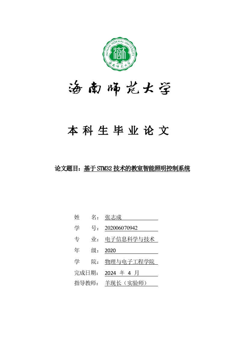 本科生毕业论文论文题目:基于STM32技术的教室智能照明控制系统姓名:张志成学号:202006070942专业:电子信息科学与技术年级:2020学院:物理与电子工程学院完成日期:2024年4月指导教师:羊现长(实验师)本科生毕业论文独创性声明本人声明所呈交的毕业论文是本人在导师指导下进行的研究工作及取得的研究成果,除了文中特别加以标注和致谢的地方外,本论文中没有抄袭他人研究成果和伪造数据等行为。与我一同工作的同志对本研究所做的任何贡献均已在论文中作了明确的说明并表示谢意。论文作者签名:日期:20年月日本科生毕业论文使用授权声明海南师范大学有权保留并向国家有关部门或机构送交毕业论文的复印件和磁盘,允许毕业论文被查阅和借阅。本人授权海南师范大学可以将本毕业论文的全部或部分内容编入有关数据库进行检索,可以采用影印、缩印或其他复印手段保存、汇编毕业论文。论文作者签名:日期:20年月日指导教师签名:日期:20年月日目录1绪论51.1研究意义…1.2研究现状…1.2.1国外研究现状.1.2.2国内研究现状.1.3研究主要内容…2教室智能照明控制系统硬件方案设计62.1系统总体设计方案…2.2系统元器件选择…72.2.1单片机选型.72.2.2人员数量统计系统选择…82.2.3显示器选择82.2.4外部时钟芯片选择…103系统硬件电路设计l23.1单片机最小控制系统…3.2电源连接电路…3.3人员数量统计电路.…3.4系统显示电路…3.5按键电路…