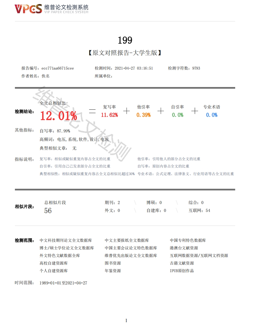 维普论文检测系统VIP PAPER CHECK SYSTEM199【原文对照报告-大学生版】报告编号:ecc771aa66715cee检测时间:2021-04-2703:16:51检测字符数:9793作者姓名:佚名所属单位:全文总相似比复写率他引率自引率专业术语检测结论:12.01%11.62%0.39%0.0%0.0%其他指标:自写率:87.99%高频词:电压,系统,软件,设计,电流典型相似文章:无指标说明:复写率:相似或疑似重复内容占全文的比重他引率:引用他人的部分占全文的比重自引率:引用自己已发表部分占全文的比重自写率:原创内容占全文的比重典型相似性:相似或疑似重复内容占全文总相似比超过30%专业术语:公式定理、法律条文、行业用语等占全文的比重总相似片段期刊:2博硕:0综合:0相似片段:56外文:0自建库:0互联网:54检测范围:中文科技期刊论文全文数据库中文主要报纸全文数据库中国专利特色数据库博士/硕士学位论文全文数据库中国主要会议论文特色数据库港澳台文献资源外文特色文献数据全库维普优先出版论文全文数据库互联网数据资源/互联网文档资源高校自建资源库图书资源古籍文献资源个人自建资源库年鉴资源IPUB原创作品时间范围:1989-01-01至2021-04-27维普论文检测系统VIP PAPER CHECK SYSTEM原文对照颜色标注说明:■自写片段■复写片段(相似或疑似重复)引用片段(引用)■专业术语(公式定理、法律条文、行业用语等)河南师范大学新联学院本科毕业论文学号:19220172018基于STM32F103单片机智能电表交流电压电流设计专业名称:电子信息工程年级班别:2017级姓名:张陆涛指导教师:武志燕2021年4月基于STM32F103单片机智能电表交流电压电流设计摘要随着我国电网电力输出功率的持续稳定增长和国际电网运行安全管理水平的持续稳步提高,传统的电网系统传感器控制系统不仅暴露越来越多技术缺陷,此硬件设计主要实现:在应用和WF中安装智能手机时两个模块之间的交流互连期间,向用户提供的交流输入电压,功率和输出功率,也可以实时直接显示在智能手机上。但是,当您的输出功率峰值更大时超过200W,功率继电器可能会自动停止或切换。如果继电器的启动功率不足或仅超过200W,我们可以选择手动控制继电器的启动暂停控制开关。关键词:MCU,wifi模块,交流电压和输出的电流测量,Android APPAbstractWith the continuous and steady growth of the output power of China's power grid powersystem and the continuous and steady improvement of the operation safety management level of theinternational power grid voltage system,the traditional power grid system sensor control system notonly exposes more and more technical defects,this hardware design mainly realizes:when a smartphone is installed in the app and WiFibetween the two modules During AC interconnection,AC input voltage,power and output powersupplied to users can also be directly displayed on the smart phone in real time.However,when youroutput power peak is greater than 200W,the power relay may automatically stop or switch.If thestart-up power of a relay is not enough or only more than 200W,we can choose to manually controlthe start-up pause control switch of the relay.Keywords:MCU,WiFi module,AC voltage and current detection,android app目录绪论11.设计方案及方案的讨论21.1明确的控制计划22.硬件配置电路原理42.1系统软件功能设计与架构设计方案42.2STM32MCU关键电路原理52维普论文检测系统VIP PAPER CHECK SYSTEM2.3ESP8266WIFI模块的电路原理图62.4交流电压电流和电压互感器模块电路的通讯原理73.系统设计方案103.1编程语言选择103.2MCU软件开发的自然环境103.3AM开发软件的全过程113.4PL2303串行通讯程序流程编程模块的详细介绍123.5程序流程图134系统硬件调试144.1电源电路硬件焊接144.2系统软件调试144.3硬件配置检查16参考文献17感谢17绪论交流数字电压电流量计是一种测量仪器,它使用数字测量技术将连续脉冲信号转换为离散的可变数字格式。由于传统的模拟电压计量器的功能简单且测量精度相对较低,因此已经无法适应于数字时代的要求。微控制器的工作水平很高,精度高,耐用性强和具有抗干扰自动化技术的控制功能,扩展性强,易于集成以及与电子计算机即时通讯等特点[1]。如今,有各种各样的由不同型号和规格的智能单片机设计的智能数字通信交流电压测量仪及其数模转换器广泛用于汽车电子行业和电气行业的生产测量中。自动化技术检验设备的主要目的是在检验工业生产过程中,自动识别系统软件等各种新型智能计量电子信息技术,具有较强的技术专业性和生产能力和活力。新型在线全自动数字通信交流电压表以其高精度,可测量的电压结果,高可靠性,高像素和高性价比而著称。电压和电流的测量是电子设备测量的关键部分。测量设备可以分为两种类型:模拟和数字。模拟电压安培表选择针型式。使用磁电检流计作为测量指示器。检流计内径规或电流度上的测量电压是在电磁场中与电阻R串联的关键。测量仪表板头由这种仪表板头的一部分组成。为了更好地利用电磁线圈在电磁场中的基本原理来接收来自电磁场的转矩,从而制定计方案,是一种设计方法。数字伏安表首先,根据模拟模/数(A/D)转换器,将模拟输入立即转换为数字量,然后使用电子式电压计数器对其进行测量,然后六位数的十进制数字表示测量的相关电压变量的值。在进行高频和低频电压测量时,所需的测量精度不一定低于数字伏安表。因此,它将仍然在电压和高频电流的测量中具有关键影响。近年来,数字电压表和电流表的发展