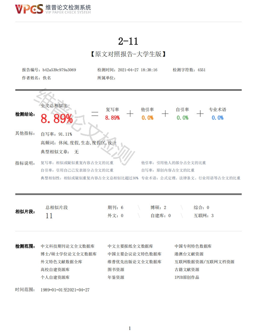 维普论文检测系统VIP PAPER CHECK SYSTEM2-11【原文对照报告-大学生版】报告编号:b42a539c979a3069检测时间:2021-04-2718:38:16检测字符数:4551作者姓名:佚名所属单位:全文总相似比复写率他引率自引率专业术语检测结论:8.89%8.89%0.0%0.0%0.0%其他指标:自写率:91.11%高频词:休闲,度假,生态,度假区,设计典型相似文章:无指标说明:复写率:相似或疑似重复内容占全文的比重他引率:引用他人的部分占全文的比重自引率:引用自己已发表部分占全文的比重自写率:原创内容占全文的比重典型相似性:相似或疑似重复内容占全文总相似比超过30%专业术语:公式定理、法律条文、行业用语等占全文的比重总相似片段期刊:6博硕:2综合:0相似片段:11外文:0自建库:0互联网:3检测范围:中文科技期刊论文全文数据库中文主要报纸全文数据库中国专利特色数据库博士/硕士学位论文全文数据库中国主要会议论文特色数据库港澳台文献资源外文特色文献数据全库维普优先出版论文全文数据库互联网数据资源/互联网文档资源高校自建资源库图书资源古籍文献资源个人自建资源库年鉴资源IPUB原创作品时间范围:1989-01-01至2021-04-27维普论文检测系统VIP PAPER CHECK SYSTEM原文对照颜色标注说明:■自写片段■复写片段(相似或疑似重复)口引用片段(引用)■专业术语(公式定理、法律条文、行业用语等)编号:山东艺术学院毕业论文浅谈休闲生态旅游度假区景观设计一一以栖霞山脚下休闲度假区为例孙淑文指导教师:黄兆成宋玉立专业名称:艺术设计(环境设计)学位级别:学士班级:17级环境设计2班学号:201706182论文提交日期:2021年5月论文答辩日期:2021年5月浅谈休闲生态旅游度假区景观设计一一以栖霞山脚下休闲度假区为例摘要:随着社会经济的不断发展以及愈发注重休闲生态旅游的当下,人们想要的是能在休闲放松的同时亲近自然的度假体验。因此,拥有生态自然景观资源和多样休闲服务的以休闲生态为主题的旅游度假区满足了人们需求。本文从休闲生态化的概念、生态化休闲需要对度假区景观设计的要求和休闲生态度假区景观设计的原则为前提,结合当地环境将其运用到度假区景观设计中,打造休闲化生态化的新型旅游度假村。关键词:休闲生态:度假区:景观设计:实践随着社会及经济建设的快速发展,生存压力、住房压力、情感压力等等方面使人们急需一个舒缓压力的地方,而旅游恰巧满足人们的需求。依据资料显示,当前世界旅游业不仅已经成为世界最大的三大产业之一,也是世界上所有行业中从业人员最多的行业。世界著名的经济学家奈恩比曾经预言,旅游业很可能成为21世纪的“产业金矿”。旅游业的快速发展,随之相应行业也萌芽发展起来。度假村就是其中之一,但是普普通通的度假村,已经吸引不了游客驻足,如何让游客流连忘返,成为首要问题。如今,生态休闲需求越来越多,这无疑为度假村发展的方向指了一盏明灯。1、“休闲生态化”阐释“休闲”有两层含义一是指在闲暇时间用“玩”的方式来调节身心,二是获得精神上慰藉:“生态”一般指生物在一定的自然环境下能够正常持续生存和发展的状态。“休闲生态化”则将两者相结合,在不打扰其他生物正常活动生存的情况下,建造休闲设施,在自然的怀抱下娱乐玩耍,放松身心,人与自然融为一体,生态环境物质文化和真、善、美的价值意义得以共同实现。2、生态化休闲需要对度假区景观设计的要求2维普论文检测系统VIP PAPER CHECK SYSTEM目前,旅游者的个性化、休闲化、生态化的消费需求增加,为迎合市场需求,度假旅游周边产业及其主要载体一一度假区也需要注入新的灵魂。个性化需求要求度假区景观设计将实用性与情调性相结合。度假区设计的基本目的是为了满足人们的基本要求,但是不能仅仅局限在这一方面,设计还要具有一定的个性、艺术性和品味性。当今世界,人们面对同质化的度假区,已渐渐失去兴趣,但若度假区拥有自己独特情调,那么就是拥有了核心竞争力。当然实用性与情调性缺一不可,如果其中一方面缺失,那么设计的效果及吸引力将大大折扣。因此,在满足人们与动植物需求的同时,设计时应将美学等融入其中,利用光影、色彩、声音、材质质感等形式要素加以创造特色景观,形成核心竞争力,也实现度假区景观设计的个性化。休闲需求要求度假区景观设计以人为本,动静结合。人们来度假区的目的就是放松休闲,度假区设计就要考虑到人们的需求,应以人为本,迎合大众心理,满足游客需求,为游客提供优质的服务。当然,我们也要充分考虑到每个人的休闲需求都有所不同,所以在设计方面要动静结合,要有安静和热闹的区域。这样,无论是想要安静的人,还是想要热闹的人,都能得到满足,引领人们舒缓心情放松身体,从而充分发挥度假区的休闲娱乐功能。生态化需求需要度假区景观设计重生态、轻设计。以往,传统度假区在建造与运营中经常对环境造成污染,现今,随着人们对生态需求的增加,清新的空气,优美的环境才是人们选择与否重要因素之一,也是度假区的立足之本。总之,在进行景观设计时,要因地制宜,尽量避免破坏原有自然景观,还要尽可能利用现有资源。如此,这样不仅保护了环境,为旅游者提供良好的度假环境,满足人与自然和谐共处的理念,也为度假区的建设节省成本开支。3、休闲生态度假区景观设计的原则休闲生态度