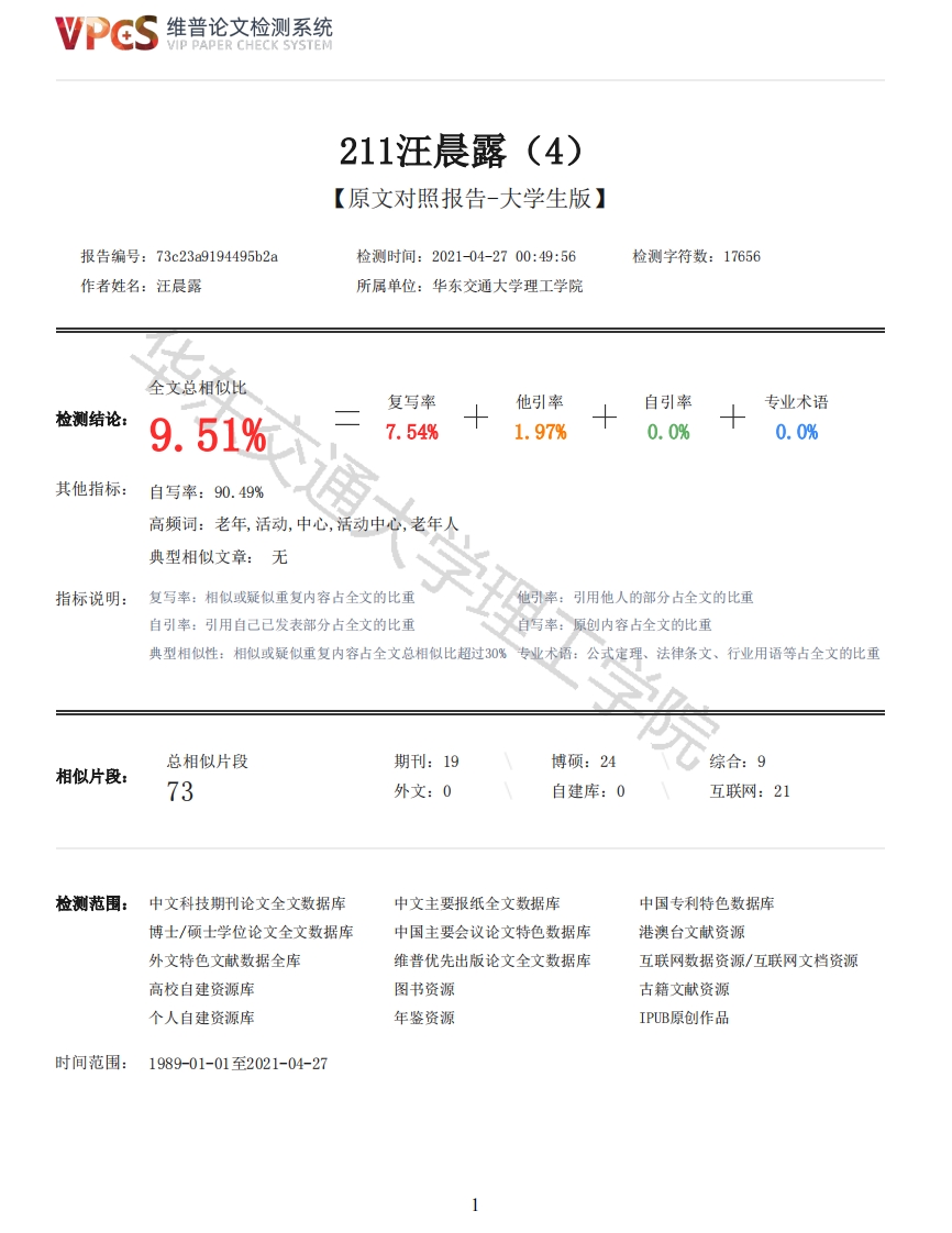 维普论文检测系统VIP PAPER CHECK SYSTEM211汪晨露(4)【原文对照报告-大学生版】报告编号:73c23a9194495b2a检测时间:2021-04-2700:49:56检测字符数:17656作者姓名:汪晨露所属单位:华东交通大学理工学院全文总相似比复写率他引率自引率专业术语检测结论:9.51%7.54%1.97%0.0%0.0%其他指标:自写率:90.49%高频词:老年,活动,中心,活动中心,老年人典型相似文章:无指标说明:复写率:相似或疑似重复内容占全文的比重他引率:引用他人的部分占全文的比重自引率:引用自己已发表部分占全文的比重自写率:原创内容占全文的比重典型相似性:相似或疑似重复内容占全文总相似比超过30%专业术语:公式定理、法律条文、行业用语等占全文的比重总相似片段期刊:19博硕:24综合:9相似片段:73外文:0自建库:0互联网:21检测范围:中文科技期刊论文全文数据库中文主要报纸全文数据库中国专利特色数据库博士/硕士学位论文全文数据库中国主要会议论文特色数据库港澳台文献资源外文特色文献数据全库维普优先出版论文全文数据库互联网数据资源/互联网文档资源高校自建资源库图书资源古籍文献资源个人自建资源库年鉴资源IPUB原创作品时间范围:1989-01-01至2021-04-27维普论文检测系统VIP PAPER CHECK SYSTEM原文对照颜色标注说明:■自写片段■复写片段(相似或疑似重复)口引用片段(引用)■专业术语(公式定理、法律条文、行业用语等)Institute of Technology.East China Jiaotong University毕业论文Graduation Thesis(2017一2021年)题目乡镇老年活动中心的现状与对策研究一以洪源镇为例分院:人文法学分院专业:公共事业管理班级:公管2017-2学号:20170710830211学生姓名:汪晨露指导教师:宋佳梅起讫日期:2020.10-2021.05华东交通大学理工学院毕业论文原创性申明本人郑重申明:所呈交的毕业论文是本人在导师指导下独立进行的研究工作所取得的研究成果。论文中引用他人的文献、数据、图件、资料,均已在论文中特别加以标注引用,除此之外,本论文不含任何其他个人或集体已经发表或撰写的成果作品。对本文的研究作出重要贡献的个人和集体,均已在文中以明确方式表明。本人完全意识到本申明的法律后果由本人承担。毕业论文作者签名:日期:年月日毕业论文版权使用授权书本毕业论文作者完全了解学院有关保留、使用毕业论文的规定,同意学校保留并向国家有关部门或机构送交论文的复印件和电子版,允许论文被查阅和借阅。本人授权华东交通大学理工学院可以将本论文的全部或部分内容编入有关数据库进行检索,可以采用影印、缩印或扫描等复制手段保存和汇编毕业论文。(保密的毕业论文在解密后适用本授权书)毕业论文作者签名:指导教师签名:签字日期:年月日签字日期:年月日摘要当前我国老年人口不断增加,人口出生率不断下降,老龄化趋势明显。为应对我国老龄化进程加速的现象,国2维普论文检测系统VIP PAPER CHECK SYSTEM家推出了一系列政策,以推动公共养老服务业的健康发展。在上述人口大背景下,洪源镇着力于老年活动中心建设,深入开展老年文化体育服务。本文通过研究当前与未来老年人的养老需求和养老意愿,结合洪源镇老年活动中心实际发展情况,探究满足老年人活动需求的乡镇老年活动中心的发展道路。本文将以事实为依据,通过实地考察和问卷、访谈等形式洪源镇老年活动中心规模与设施、管理与服务、老年人满意程度等方面进行了解和分析,发现现阶段洪源镇老年活动中心存在缺乏统筹规划、宣传手段单一、融资渠道少、了解沟通不足、政府缺乏重视等问题。本文通过参考国内外成功典型和研究文献,提出了完善配套设、加大宣传力度、拓宽融资渠道、丰富服务内容、建设人才队伍等对策与建议,从而提高老年人的生活质量。关键词:老年活动中心;乡镇;养老AbstratAt present,China's aging trend is obvious,the elderly population is increasing,and the birthrate is declining.In response to the accelerated aging process in China,the state has launched aseries of policies to promote the healthy development of public pension services.In the context ofthe above population,Hongyuan town focuses on the construction of elderly activity center andcarries out in-depth cultural and sports services for the elderly.This paper studies the current and future needs and wishes of the elderly,combined with theactual development of the elderly activity center in Hongyuan Town,explores the development path ofthe township elderly activity center to meet the needs of the elderly.Based on the facts,thispaper will understand and analyze the scale and facilities,management and service,elderlysatisfaction of the elderly activity center in Hongyuan town through field investigation,questionnaire and interview.Referring to the relevant theories and scholars'research literature athome and abroad,this paper puts forward some countermeasures and suggestions,such as improving thesupporting facilities,increasing publicity,broadening financing channels,enriching servicecontent,and building talent team,so as to improve the quality of life of the elderly.Key words:senior citizens activity center;villages and towns;provide for the aged目录摘要1Abstrat2目录1学院一、绪论1(一)研究背景及研究意义11、研究背景12、研究意义2(二)研究目标、主要特色和方法21、研究目标22、主要特色23、研究方法2(三)相关理论31、需求层次理论32、活动理论3(四)相关概念31、老龄化32、老年活动中心4二、国内外现状对比综述5(一)国内研究51.政策支持方面52.