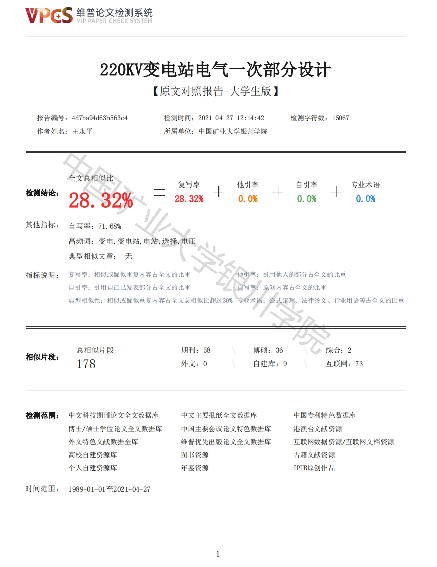维普论文检测系统VIP PAPER CHECK SYSTEM220KV变电站电气一次部分设计【原文对照报告-大学生版】报告编号:4d7ba94d63b563c4检测时间:2021-04-2712:14:42检测字符数:15067作者姓名:王永平所属单位:中国矿业大学银川学院全文总相似比复写率他引率自引率专业术语检测结论:28.32%28.32%0.0%0.0%0.0%其他指标:自写率:71.68%高频词:变电,变电站,电站,选择,电压典型相似文章:无指标说明:复写率:相似或疑似重复内容占全文的比重他引率:引用他人的部分占全文的比重自引率:引用自己已发表部分占全文的比重自写率:原创内容占全文的比重典型相似性:相似或疑似重复内容占全文总相似比超过30%专业术语:公式定理、法律条文、行业用语等占全文的比重总相似片段期刊:58博硕:36综合:2相似片段:178外文:0自建库:9互联网:73检测范围:中文科技期刊论文全文数据库中文主要报纸全文数据库中国专利特色数据库博士/硕士学位论文全文数据库中国主要会议论文特色数据库港澳台文献资源外文特色文献数据全库维普优先出版论文全文数据库互联网数据资源/互联网文档资源高校自建资源库图书资源古籍文献资源个人自建资源库年鉴资源IPUB原创作品时间范围:1989-01-01至2021-04-27维普论文检测系统VIP PAPER CHECK SYSTEM原文对照颜色标注说明:■自写片段■复写片段(相似或疑似重复)口引用片段(引用)■专业术语(公式定理、法律条文、行业用语等)中国矿业大学银川学院本科毕业综合训练(2021届)题目220kV变电站电气一次部分设计系别信息工程学院专业电气工程及其自动化年级2017级学生姓名王永平指导教师张凤2021年3月20日摘要变电站作为电力系统的一个重要组成部分,它是电力系统中电压变换、电能接受和分配、电力流向控制和电压调整的电力设施,将电能安全、可靠和经济地输送到每个电力用户。本课题主要为220V变电站作电气一次部分的设计,并且绘制电气主接线图。其中,本变电站按有两台主变压器,220kV、110kV及10kV三个电压等级进行设计。本课题主要进行了变压器选择、无功补偿装置选择、电气主接线设计、短路电流计算及高压电气设备(包括断路器、隔离开关、TA、TV、避雷器、熔断器等)选择和校验。关键词:变电站,电气主接线,变压器,无功补偿装置,电气设备目录1绪论11.1课题研究的背景与意义11.2国内外研究动态11.3工程设计主要依据11.4本变电站建设的必要性21.5本变电站在系统中的地位和作用21.6设计原始数据21.6.1负荷顶测及发展情况21.6.2接入系统方案21.6.3建设规模22主变压器42.1主变压器容量和台数的确定42维普论文检测系统VIP PAPER CHECK SYSTEM2.1.1容量的确定42.1.2主变压器台数的确定42.2主变压器型式选择42.2.1变电站主变压器相数的选择42.2.2绕组数量和连接方式的选择42.3本变电站主变压器选择52.3.1台数和容量52.3.2型式选择52.3.3中性点接地方式63无功补偿装置73.1无功补偿论证73.1.1容性无功补偿73.1.2感性无功补偿73.2本变电站无功补偿装置选择73.2.1台数和容量74电气主接线84.1主接线的设计原则84.1.1主接线的设计依据84.1.2主接线设计的基本要求4.2主接线的基本接线94.2.1单母线接线94.2.2单母线分段接线94.2.3双母线接线94.2.4双母线分段接线104.2.5桥形接线104.2.6增设旁路母线的接线10矿业大学银学院4.2.7母线接线方式分类及其主要特点和适用范围11增设旁路母线的接线124.3本变电站电气主接线设计134.3.1220kV电压侧接线134.3.2110kV电压侧接线144.3.310kV电压侧接线155短路电流计算175.1短路电流计算的一般规定175.2短路电流计算步骤175.3本变电站短路电流计算186高压电气设备选择196.1电气设备的一般要求196.1.1一般原则196.1.2技术条件196.2高压断路器216.2.1高压断路器的种类216.2.2本变电站高压断路器选择216.3隔离开关236.3.1本变电站隔离开关选择236.4电流互感器246.4.1本变电站电流互感器选择243