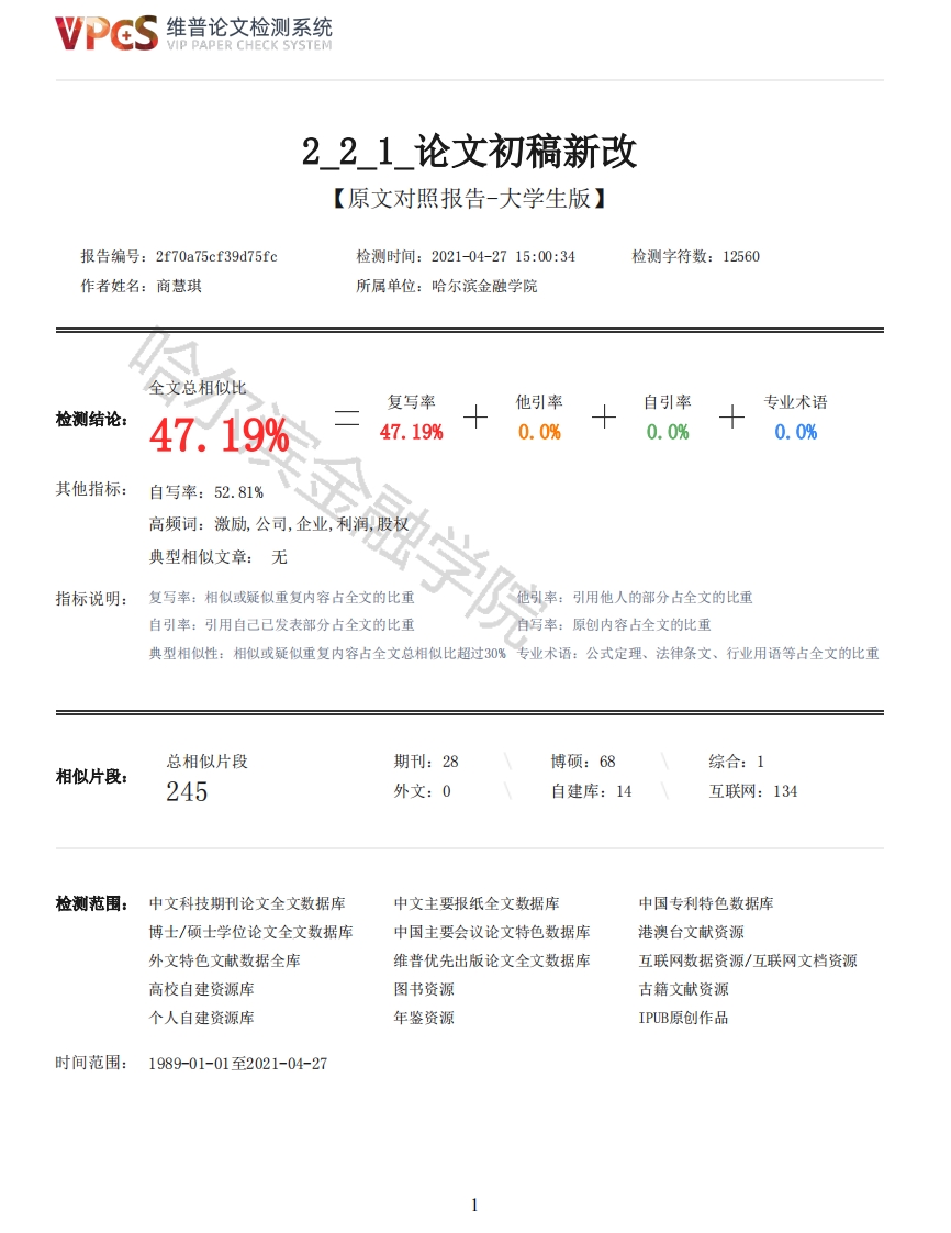 维普论文检测系统VIP PAPER CHECK SYSTEM221论文初稿新改【原文对照报告-大学生版】报告编号:2f70a75cf39d75fc检测时间:2021-04-2715:00:34检测字符数:12560作者姓名:商慧琪所属单位:哈尔滨金融学院全文总相似比复写率他引率自引率专业术语检测结论:47.19%47.19%0.0%0.0%0.0%其他指标:自写率:52.81%高频词:激励,公司,企业,利润,股权典型相似文章:无指标说明:复写率:相似或疑似重复内容占全文的比重引用他人的部分占全文的比重自引率:引用自己已发表部分占全文的比重自写率:原创内容占全文的比重典型相似性:相似或疑似重复内容占全文总相似比超过30%专业术语:公式定理、法律条文、行业用语等占全文的比重总相似片段期刊:28博硕:68综合:1相似片段:245外文:0自建库:14互联网:134检测范围:中文科技期刊论文全文数据库中文主要报纸全文数据库中国专利特色数据库博士/硕士学位论文全文数据库中国主要会议论文特色数据库港澳台文献资源外文特色文献数据全库维普优先出版论文全文数据库互联网数据资源/互联网文档资源高校自建资源库图书资源古籍文献资源个人自建资源库年鉴资源IPUB原创作品时间范围:1989-01-01至2021-04-27维普论文检测系统VIP PAPER CHECK SYSTEM原文对照颜色标注说明:■自写片段■复写片段(相似或疑似重复)口引用片段(引用)■专业术语(公式定理、法律条文、行业用语等)哈尔滨全融学院本科毕业论文齐齐哈尔鑫德会计服务有限公司股权激励研究学院HARBIN FINANCE UNIVERSITY系别管理系专业财务管理年级2017级学号17106190208学生姓名商慧琪指导教师王磊2021年5月毕业论文原创性声明本人郑重声明:所呈交毕业论文,是本人在指导教师的指导下,独立进行研究工作所取得的成果。除文中已经注明引用的内容外,本论文不包含任何其他人或集体已经发表或撰写过的作品成果。对本文的研究做出重要贡献的个人和集体,均已在文中以明确方式标明。本人完全意识到本声明的法律结果由本人承担。论文作者签名:2021年月日目录摘要IAbstractII2维普论文检测系统VIP PAPER CHECK SYSTEM一、股权激励相关理论1(一)定义1(二)常见的普通股权激励模式比较分析1(三)股权激励政策涉及的相关指标3二、齐齐哈尔鑫德会计服务有限公司股权激励机制现状4(一)公司简介4(二)公司股权激励机制现状4(三)影响6三、齐齐哈尔鑫德会计服务有限公司股权激励机制存在的问题8(一)方案实施难度较高8(二)影响后期人员稳定性8(三)利润目标设计难度较高8四、完善齐齐哈尔鑫德会计服务有限公司股权激励机制问题的对策9(一)采取递延支付方法9(二)谨慎确定激励对象和超额利润分享比例9(一)目的11(二)考核对象11(三)本股权激励方案的管理机构11(四)激励期间11(五)激励额度11(六)绩效考评12(七)支付方式13融学院五、齐齐哈尔鑫德会计服务有限公司股权激励方案构建11(八)退出机制14参考文献15致谢16摘要超额利润激励制度作为一种对于上市公司高级管理层激励的有效实施方式,在我国非上市公司的股权激励机制中也一直发挥着重要的作用。本文从股权激励制度相关理论开始研究展开,主要从对齐齐哈尔鑫德会计服务有限公司股权激励制度实施的基本情况、效果及其特点及可能存在的问题等几个方面进行分析,并重点提出实施超额利润激励制度需要解决的几个主要问题及相关的实施建议。期望通过深入研究齐齐哈尔鑫德会计服务有限公司的股权激励改革方案对其他非上市公司未来发展战略具有借鉴性的意义。关键词:非上市公司:股权激励:激励方案AbstractAs an effective way to motivate the senior management of listed companies,The excess interestincentive system plays an important role in the stock incentive mechanism of China's non listedcompanies.This paper analyzes the basic situation.effect,characteristics and possible problems ofthe implementation of equity incentive system in Qiqihar Xinde Accounting Service Co.,Ltd.,andputts forward some mail problems to be soved and relevant implement ation suggaestions.It isexpected that through the in-depth study of Qiqihar Xinde Accounting Service Co.,Ltd.equityincentive reform plan,it has reference significance for the future development strategy of othernon listed companies.Key words:Non listed companies;Equity incentive;Incentive scheme齐齐哈尔鑫德会计服务有限公司股权激励研究3