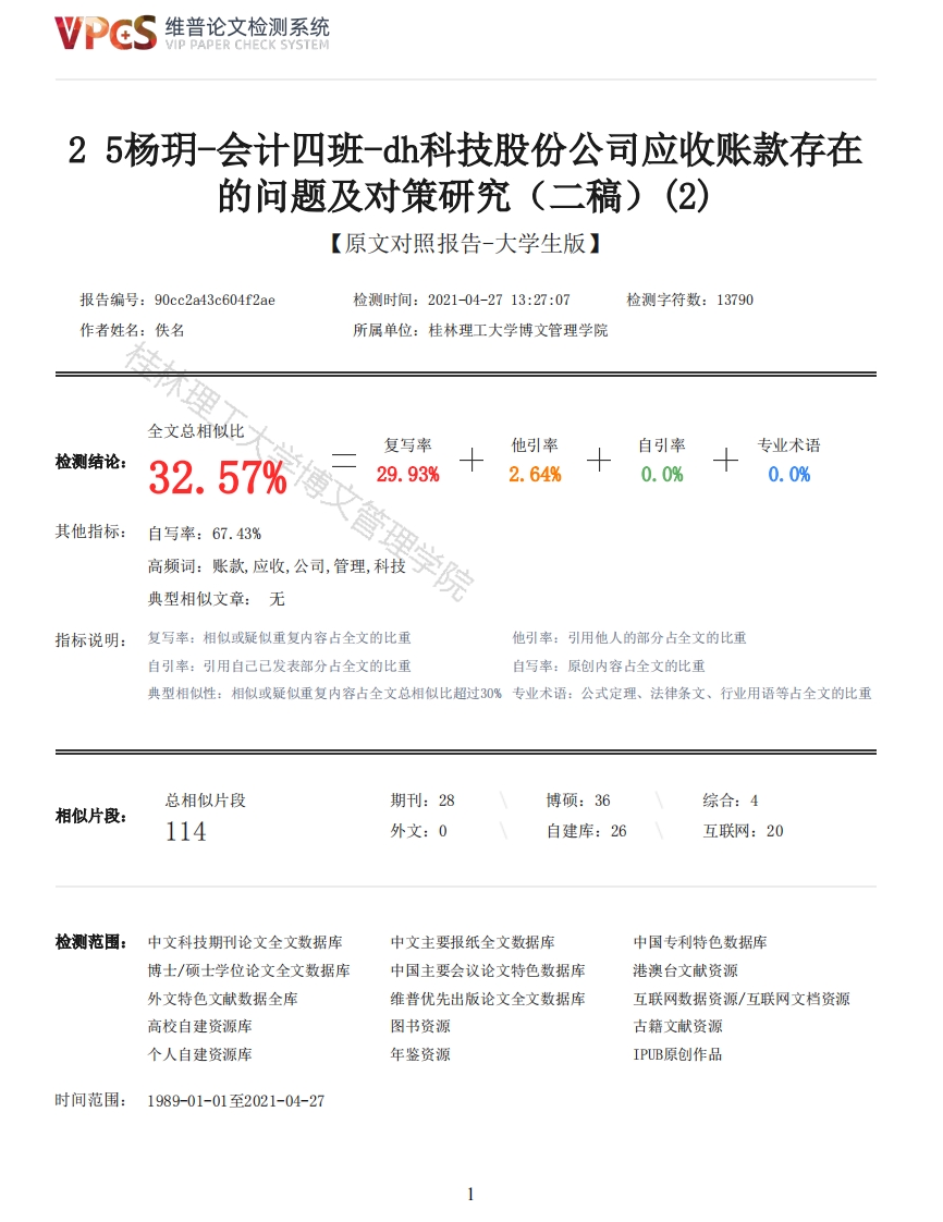 维普论文检测系统VIP PAPER CHECK SYSTEM25杨玥-会计四班-dh科技股份公司应收账款存在的问题及对策研究(二稿)(2)【原文对照报告-大学生版】报告编号:90cc2a43c604f2ae检测时间:2021-04-2713:27:07检测字符数:13790作者姓名:佚名所属单位:桂林理工大学博文管理学院全文总相似比复写率他引率自引率专业术语检测结论:32.57%29.93%2.64%0.0%0.0%其他指标:自写率:67.43%高频词:账款,应收,公司,管理,科技典型相似文章:无院指标说明:复写率:相似或疑似重复内容占全文的比重他引率:引用他人的部分占全文的比重自引率:引用自己已发表部分占全文的比重自写率:原创内容占全文的比重典型相似性:相似或疑似重复内容占全文总相似比超过30%专业术语:公式定理、法律条文、行业用语等占全文的比重总相似片段期刊:28博硕:36综合:4相似片段:114外文:0自建库:26互联网:20检测范围:中文科技期刊论文全文数据库中文主要报纸全文数据库中国专利特色数据库博士/硕士学位论文全文数据库中国主要会议论文特色数据库港澳台文献资源外文特色文献数据全库维普优先出版论文全文数据库互联网数据资源/互联网文档资源高校自建资源库图书资源古籍文献资源个人自建资源库年鉴资源IPUB原创作品时间范围:1989-01-01至2021-04-27维普论文检测系统VIP PAPER CHECK SYSTEM原文对照颜色标注说明:■自写片段■复写片段(相似或疑似重复)口引用片段(引用)■专业术语(公式定理、法律条文、行业用语等)学号:17330219题目类型:论文学(设计、论文、报告)毕业设计(论文)题目:DH科技股份公司应收账款管理存在的问题及对策研究二级学院:商学院专业(方向):会计学班级:17级4班学生:杨玥指导教师:姚春艳2021年3月15日桂林理工大学博文管理学院毕业设计(论文)原创性声明本人声明所呈交的设计(论文)是我个人在指导教师指导下进行的研究工作及取得的研究成果。尽我所知,除了设计(论文)中特别加以标注和致谢的地方外,设计(论文)中不包含其他人或集体已经发表或撰写的研究成果,也不包含为获得桂林理工大学博文管理学院或其它教育机构的学位或证书而使用过的材料。对设计(论文)的研究成果做出贡献的个人和集体,均已作了明确的标明。本人完全意识到本声明的法律后果由本人承担。设计(论文)作者签名:日期:年月日桂林理工大学博文管理学院毕业设计(论文)使用授权声明本设计(论文)作者完全了解学院有关保留、使用设计(论文)的规定,同意学院保留并向国家有关部门或机构送交设计(论文)的复印件和电子版,允许设计(论文)被查阅或借阅。本人授权桂林理工大学博文管理学院可以将本设计(论文)的全部或部分内容编入有关数据库进行检索,可以采用影印、缩印或扫描等复制手段保存和汇编本设计(论文)。设计(论文)作者签名:日期:年月日指导教师签名:日期:年月日摘要2VPGS维普论文检测系统VIP PAPER CHECK SYSTEM随着我国社会主义市场经济体系的日渐完善与成熟,各个企业间的市场竞争也逐渐进入“白热化”阶段。企业通过赊销交易的方式在激烈的市场竞争中获得一席之地,同时扩大企业的客户群体数量、增大企业销售收入。但是随着商业信用发展日益蓬勃,使得企业陷入了一种两难的困境一销售难,收款难。而这一负面现象所产生的原因与企业应收账款管理能力不足存在较大的关联。应收账款管理不到位,会导致企业机会成本和坏账损失大量增加,从而降低应收账款周转率。本文以DH科技股份公司为例,通过对DH科技股份公司应收账款规模以及管理现状进行分析之后发现,该公司在应收账款催收管理、客户信用管理以及风险控制流程等层面存在应收账款回收制度不完善、客户信用评估机制不健全以及风险意识淡薄等问题,针对上述问题提出有效地解决方案与措施。关键词:应收账款:应收账款管理;客户信用Problems and Countermeasures of accounts receivable managemengt of DH Technology IncStudent:YANG Yue Teacher:YAO ChunyanAbstract:With the improvement and maturity of China's socialist market economic system,themarket competition among enterprises has gradually entered the "white-hot"stage.Enterprises canobtain a place in the fierce market competition by means of credit sales transactions,and expandthe number of customer groups and increase the sales revenue of enterprises.But with the boomingdevelopment of commercial credit,enterprises have fallen into a dilemma --difficult to sell,difficult to collect money.And this negative phenomenon caused by the lack of enterprise accountsreceivable management ability has a greater correlation.Accounts receivable management is not inplace,will lead to a large increase in enterprise opportunity cost and bad debt losses,thusreducing accounts receivable turnover rate.Based on DH technology inc as an example,through the DH technology inc found after analyzingthe present situation and problems of scale and accounts receivable management,the company in themanagement of accounts receivable collection,customer credit management and risk control level,theprocess of accounts receivable recovery system is imperfect,the customer credit evaluationmechanism is not sound and the risk consciousness,effective solutions and measures are proposed forthe problem.Keywords:Accounts receivable;Accounts Receivable Management;Customer credit目录摘要IAbstractII引言5一、应收账款的相关理论6(一)应收账款的概念及特点61.应收账款的概念62.应收账款的特点[1]6(二)应收账款管理理论61.应收账款事前管理62.应收账款事中管理6