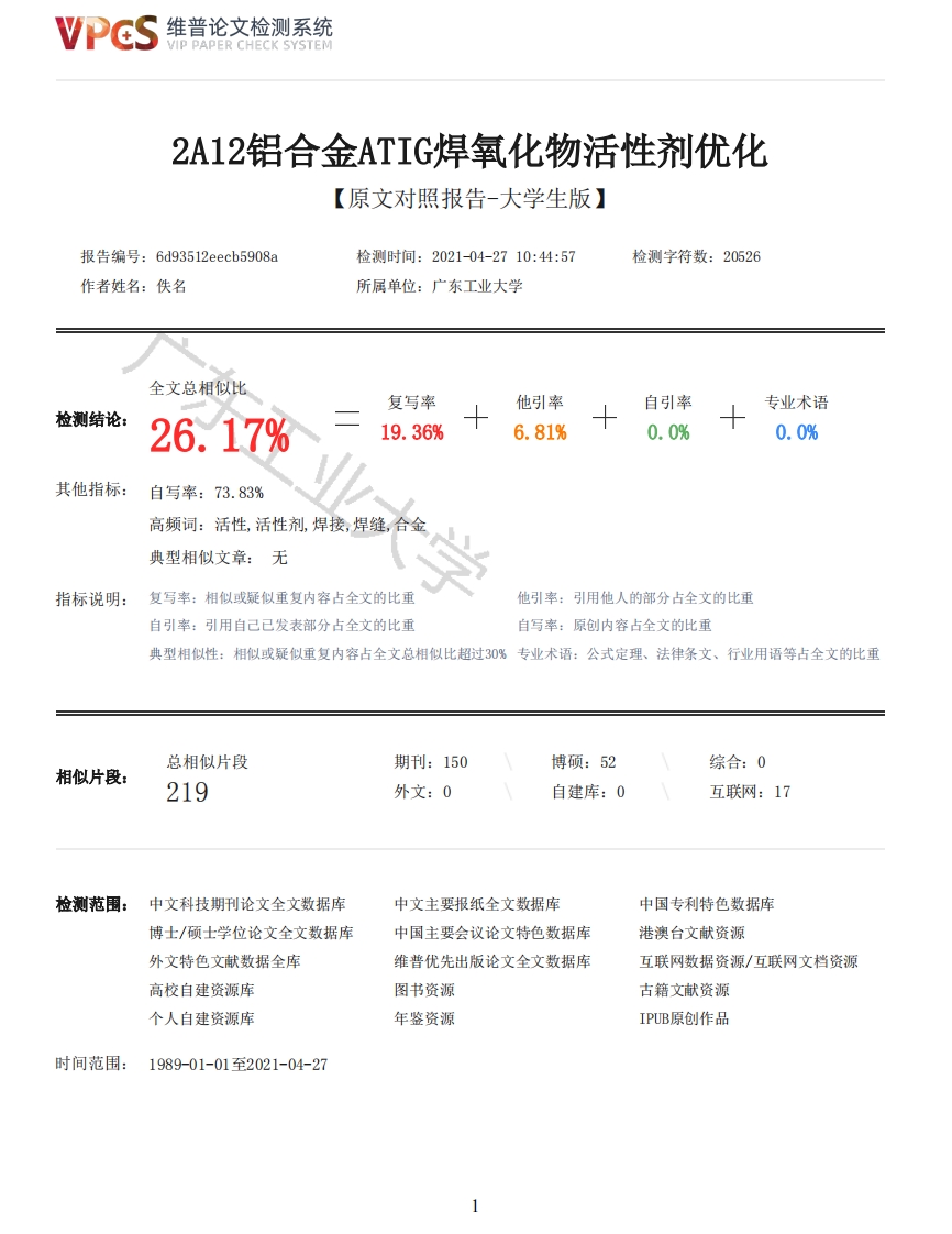 维普论文检测系统VIP PAPER CHECK SYSTEM2A12铝合金ATIG焊氧化物活性剂优化【原文对照报告-大学生版】报告编号:6d93512eecb5908a检测时间:2021-04-2710:44:57检测字符数:20526作者姓名:佚名所属单位:广东工业大学全文总相似比复写率他引率自引率专业术语检测结论:26.17%19.36%6.81%0.0%0.0%其他指标:自写率:73.83%高频词:活性,活性剂,焊接,焊缝,合金典型相似文章:无指标说明:复写率:相似或疑似重复内容占全文的比重他引率:引用他人的部分占全文的比重自引率:引用自己已发表部分占全文的比重自写率:原创内容占全文的比重典型相似性:相似或疑似重复内容占全文总相似比超过30%专业术语:公式定理、法律条文、行业用语等占全文的比重总相似片段期刊:150博硕:52综合:0相似片段:219外文:0自建库:0互联网:17检测范围:中文科技期刊论文全文数据库中文主要报纸全文数据库中国专利特色数据库博士/硕士学位论文全文数据库中国主要会议论文特色数据库港澳台文献资源外文特色文献数据全库维普优先出版论文全文数据库互联网数据资源/互联网文档资源高校自建资源库图书资源古籍文献资源个人自建资源库年鉴资源IPUB原创作品时间范围:1989-01-01至2021-04-27维普论文检测系统VIP PAPER CHECK SYSTEM原文对照颜色标注说明:■自写片段■复写片段(相似或疑似重复)口引用片段(引用)■专业术语(公式定理、法律条文、行业用语等)本科毕业设计(论文)2A12铝合金A-TIG焊氧化物活性剂优化学院材料与能源学院专业金属材料工程年级班别17金材(1)学号3117005318学生姓名李浩凌指导教师毛凌波2021年4月2A12铝合金A-TIG焊氧化物活性剂优化李浩凌材料与能源学院摘要本课题以212铝合金为母材,使用气体钨极电弧焊为焊接方式,将活性剂均匀涂在母材欲焊接的部位,通过优选焊丝对母材进行焊接。本研究的目的主要在于探讨不同氧化物活性剂对212铝合金钨极氩弧焊的焊缝影响,包括焊缝外形、金相微观组织、显微硬度等,希望通过本课题的研究工作能对212铝合金的焊接技术提供理论和技术参考。通过不同组合活性剂对母材进行焊接,活性剂选用M血02、Ti02、C0、Si02、A1203、Mg0化合物的一种或多种混合物。分别对焊缝的外观形态和金相组织进行了观察,对焊缝的力学性能进行了测试。在实验过程中,本课题发现了相比于单一氧化物活性剂,多组分氧化物活性剂的焊缝表面质量更佳,焊缝更为平直光滑,外形更为明显,其中,C0+Mg0是由渗透检测得出表面质量最好的氧化物活性剂组合:多组分氧化物活性剂能够观察到更加清晰明显的焊缝树枝晶结构金相组织图,推测为多组分活性剂对于析出S相和0相更为有效,其中,C0+Mg0和Ca0+Ti02+Mg0得到的树枝晶结构更为密集和清晰:组分氧化物活性剂焊件的显微硬度随着离焊缝中心距离的增加而减少,且焊缝中心硬度显然高于单一组分的,其中,混合T02的活性剂组合的硬度强化效果更明显。由此得出,多组分氧化物活性剂得到的各方面焊接效果都要优于单一组分氧化物活性剂,且综合焊接质量最高的氧化物活性剂组合为2维普论文检测系统VIP PAPER CHECK SYSTEMCa0+Ti02+Mg0.关键词:2A12铝合金,氩极电弧焊,氧化物活性剂AbstractIn this project,2A12 aluminum alloy is used as the base metal,gas tungsten arc welding is usedas the welding method,the active flux is evenly coated on the parts of the base metal to be welded,and the base metal is welded by optimizing the welding wire.The purpose of this study is to explorethe effect of different oxide activators on 2Al2 aluminum alloy TIG welding seam,including weldshape,metallographic microstructure,microhardness,etc.The base metal is welded by differentcombination of active agent,and the active agent is one or more mixtures of Mn02,Ti02,Cao,Si02,Al203 and Mg0 compounds.The appearance and microstructure of the weld were observed,and themechanical properties of the weld were tested.In the course of the experiment,we found that thesurface quality of the multi-component oxide activator is better than that of the single oxideactivator,the weld is more straight and smooth,and the shape is more obvious.Among them,Ca0Mgo is the best combination of oxide activator obtained by the penetration test:It is speculatedthat the effect of the multi-component oxide activator on the precipitation of S-phase and S-phasecan be considered 0 The dendrite structure of Ca0 Mgo and Ca0 Ti02 Mgo is more dense andclear;The results show that the microhardness decreases with the increase of the distance from theweld center,and the hardness of the weld center is obviously higher than that of the singlecomponent,and the hardness strengthening effect of mixed Ti02 is more obvious.It is concluded thatthe welding effect of multi-component oxide activator is better than that of single component oxideactivator,and the combination of Ca0 Ti02 Mgo has the highest comprehensive welding quality.Key words:2A12 aluminum alloy,Argon arc welding,Oxide activator目录1绪论11.1.2TIG焊及A-TIG焊简介21.1.3A-TIG焊增大熔深的机理简介31.1.4A-TIG活性剂的研究62实验材料、方法和条件92.1实验材料与设备92.1.1实验材料92.1.2实验设备102.2实验方法和过程102.2.1焊接铝片的准备102.2.2活性剂的选择与配置112.3实验测试方法122.3.1焊缝的外观形貌122.3.2焊缝的金相显微组织122.3.3焊缝的显微硬度133实验结果及分析133.1外观形貌133.2金相组织143.3显微硬度18结论20参考文献21致谢241绪论1.1研究背景3
