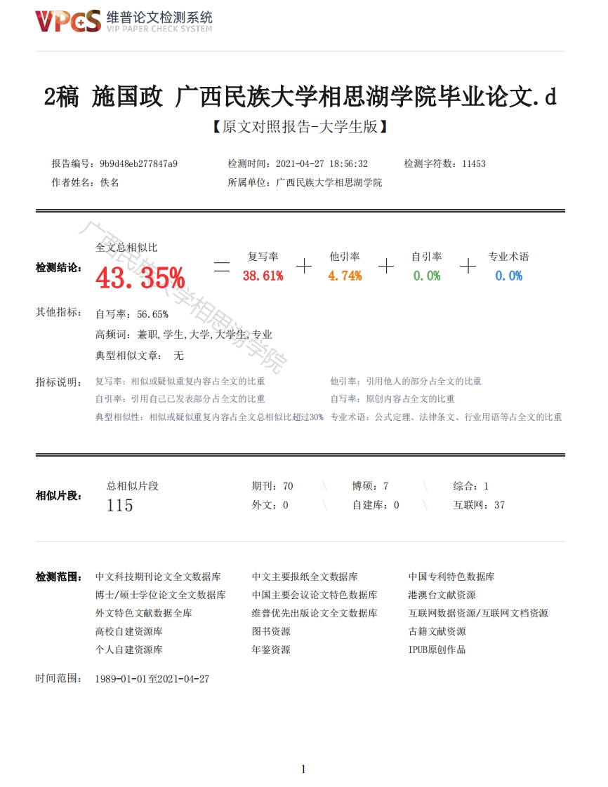 维普论文检测系统/IP PAPER CHECK SYSTEM2稿施国政广西民族大学相思湖学院毕业论文.d【原文对照报告-大学生版】报告编号:9b9d48eb277847a9检测时间:2021-04-2718:56:32检测字符数:11453作者姓名:佚名所属单位:广西民族大学相思湖学院全文总相似比复写率他引率自引率专业术语检测结论:43.35%38.61%4.74%0.0%0.0%其他指标:自写率:56.65%高频词:兼职学生,大学,大学生,专业典型相似文章:无指标说明:复写率:相似或疑似重复内容占全文的比重他引率:引用他人的部分占全文的比重自引率:引用自己已发表部分占全文的比重自写率:原创内容占全文的比重典型相似性:相似或疑似重复内容占全文总相似比超过30%专业术语:公式定理、法律条文、行业用语等占全文的比重总相似片段期刊:70博硕:7综合:1相似片段:115外文:0自建库:0互联网:37检测范围:中文科技期刊论文全文数据库中文主要报纸全文数据库中国专利特色数据库博士/硕士学位论文全文数据库中国主要会议论文特色数据库港澳台文献资源外文特色文献数据全库维普优先出版论文全文数据库互联网数据资源/互联网文档资源高校自建资源库图书资源古籍文献资源个人自建资源库年鉴资源IPUB原创作品时间范围:1989-01-01至2021-04-27维普论文检测系统VIP PAPER CHECK SYSTEM原文对照颜色标注说明:■自写片段■复写片段(相似或疑似重复)口引用片段(引用)■专业术语(公式定理、法律条文、行业用语等)广西民族大学相思湖学院本科毕业论文(设计)不论文题目体育专业学生兼职行为对就业影响分析以相思湖学院为例二级学院:体育与健康科学学院专业:社会体育指导与管理专业年级班级:17社体2班学号:117333510235学生姓名:施国政指导教师:阳亚职称:讲师目录摘要1Abstract21前言31.1研究背景31.2研究的目的与意义31.3文献综述32研究对象与方法52.1研究对象52.2研究方法52.2.1文献资料法52.2.2问卷调查法52.2.3访谈法52.2.4数理统计法53研究结果与分析63.1学生课余兼职的现状63.1.1学生课余兼职的动机73.1.2学生课余兼职的种类与所学专项参考73.1.3学生寻找兼职的途径73.1.4学生课余兼职的时间分布73.2学生课余兼职存在的问题及影响因素83.2.1学生课余兼职中存在的问题92维普论文检测系统VIP PAPER CHECK SYSTEM3.2.2影响学生兼职的因素93.3学生课余兼职行为与就业关系的相关性分析103.3.1体有专业学生的就业率103.3.2体育专业学生课余兼职与就业的关系104兼职行为对就业的影响分析114.1大学期间兼职的益处114.2大学期间做兼职的弊端115结论与建议12参考文献13致谢14附录14体育专业学生兼职行为对就业影响与分析一一以相思湖为例摘要随着新时代的迅速发展,各大高校招生规模逐年扩大导致毕业生人数迅速增长,大学毕业生的就业问题引得社会各界广泛关注,社会环境的改变也促使大学生提升就业竞争力的方式发生相应的转变。在大学就读期间获取兼职经历成为新时代大学生了解社会和毕业意向就业岗位的特殊渠道,同时大学生兼职经历也对其就业产生影响。因此,研究大学生兼职与就业之间可能存在的关系,有利于指导大学生在兼职经历中通过实践提升个人就业竞争力,提高学生的就业率。本文运用文献质料法、问卷调查法访谈法、数理统计法对广西民族大学相思湖学院体建院部分学生兼职的情况,通过整理分析从而挖掘体育专业学生兼职对就业造成的影响,发现学生兼职在兼职过程中,加深了学生对社会认知,提高了学生的就业竞争力,促进学生对未来的选择。关键词:体育兼职,大学生兼职,兼职的利弊,就业率,相关性分析,影响The influence and analysis of sports major students'part-time job behavior on employment -taking xiangsi lake as an exampleAbstractWith the rapid development of the new era,the enrollment scale of major colleges anduniversities has increased year by year,resulting in the rapid growth of the number of graduates.The change of social environment also urges college students to improve their employmentcompetitiveness.Getting part-time experience during college study has become a special channel forcollege students to understand the society and graduation intention employment in the new era,andthe part-time experience of college students also has an impact on their employment.Therefore,studying the possible relationship between part-time and employment of college students is helpfulto guide college students to improve their personal employment competitiveness and increase theiremployment rate through practice in part-time experience.His paper uses the methods of literature,questionnaire,interview and mathematical statisticsto study the part-time situation of some students in the college of sports construction of AcaciaLake College of Guangxi University for nationalities.AbstractKey words:sports part-time,college students part-time,advantages and disadvantages of part-time,employment rate,correlation analysis,impact1前言1.1研究背景从2002年,我国高等教育进入“大众话教育”阶段,高校招生制度改革,高校招生人数逐渐增加,在校大学生数量直线上升。这样的变化使得高校毕业生就业竞争压力逐渐。同时,随着社会经济的迅速发展,就业市场对于人才要求相应提高。用人单位招聘时更加倾向于具有工作经验的大学生,从而提高人力资本的使用,就业人数增加上用人单位要求也提高,让毕业生就业问题也成为高校重点难攻克的问题之一。在这样的就业形势下,部分大学生在校期间选择从事兼职工作。大学生兼职已经成为普遍现象,是大学生活