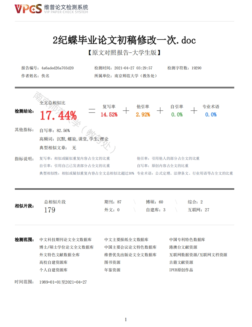 维普论文检测系统VIP PAPER CHECK SYSTEM2纪蝶毕业论文初稿修改一次.doc【原文对照报告-大学生版】报告编号:4a6aded26a703d20检测时间:2021-04-2703:29:57检测字符数:19290作者姓名:佚名所属单位:南京师范大学(教务处)全文总相似比复写率他引率自引率专业术语检测结论:17.44%14.52%2.92%0.0%0.0%其他指标:自写率:82.56%高频词:沉默,螺旋,课堂,学生,理论典型相似文章:无指标说明:复写率:相似或疑似重复内容占全文的比重他引率:引用他人的部分占全文的比重自引率:引用自己已发表部分占全文的比重自写率:原创内容占全文的比重典型相似性:相似或疑似重复内容占全文总相似比超过30%专业术语:公式定理、法律条文、行业用语等占全文的比重总相似片段期刊:87博硕:60综合:2相似片段:179外文:0自建库:3互联网:27检测范围:中文科技期刊论文全文数据库中文主要报纸全文数据库中国专利特色数据库博士/硕士学位论文全文数据库中国主要会议论文特色数据库港澳台文献资源外文特色文献数据全库维普优先出版论文全文数据库互联网数据资源/互联网文档资源高校自建资源库图书资源古籍文献资源个人自建资源库年鉴资源IPUB原创作品时间范围:1989-01-01至2021-04-27维普论文检测系统VIP PAPER CHECK SYSTEM原文对照颜色标注说明:■自写片段■复写片段(相似或疑似重复)口引用片段(引用)■专业术语(公式定理、法律条文、行业用语等)(2021届)南京师范大学(教南京师范大学毕业设计(论文)1902NORMAL题目:新媒体环境下“沉默螺旋”对高校思政课的利与弊学院:马克思主义学院专业:思想政治教育姓名:纪蝶学号:25170120指导教师:汪洁南京师范大学教务处制摘要大学思政课既是大学教育的基础课程,也是大学生精神文明建设的重要组成部分。大学生的思想政治素质是关乎我们党和国家前途和命运的重要指标。但在大学思政课堂中,学生课堂互动参与不积极、羞于表达自我见解等“沉默螺旋”现象多发。因此,本文希望在阐明“沉默螺旋”理论及其课堂表现形式、明确“沉默螺旋”现象对高校思政课堂的利弊基础之上,探讨消除“沉默螺旋”现象对课堂造成不利影响的对策。本文首先阐述了“沉默螺旋”理论的内涵和特征,考虑到理论提出的时代背景发生了变化,本文进一步探讨了在当前新媒体环境下,“沉默螺旋”理论发生了何种变化,而在这些变化下,“沉默螺旋”现象在高校课堂是否依然存在。通过在新媒体背景下对“沉默螺旋”三要素一一恐惧孤立、准感官统计、意见气候的变化进行分析,来确认当前的环境下“沉默螺旋”理论的适用性。在此前提下,笔者将“沉默螺旋”理论引入高校思政课堂,从多个角度来确认新媒体环境下高校思政课“沉默螺旋”现象的存在。在前文的基础上,笔者将课堂“沉默螺旋”现象分成积极沉默和消极沉默两大类,分别思考这些现象会对高校2维普论文检测系统VIP PAPER CHECK SYSTEM思政课堂造成哪些积极或消极影响。最后,就如何消除“沉默螺旋”现象对思政课带来的消极影响,笔者从主体与载体两个维度进行分析,分别提出解决建议。关键词:新媒体环境:“沉默螺旋”;高校思政课AbstractIdeological and political courses are not only the foundation of college education,but also ansignificant part of the construction of the state's spiritual civilization.The college'sideological and political quality is closely bound up with the future and destiny of the Party andthe country.However,in the ideological and political classes in universities,the phenomenon of"spiral of silence"occurs frequently,such as not actively participating in class interaction andnot daring to express their own opinions.What is the "spiral of silence"?What are itsmanifestations in ideological and political classes in colleges and universities?And how does itaffect the classroom?To answer these questions is the purpose of this study.This paper expound the connotation and characteristics of the "spiral of silence"theory.Considering the changes in the background of the time when the theory was proposed,this paperfurther discusses what changes have taken place in the "spiral of silence"theory under the currentnew media environment,and whether the "spiral of silence"can continue to exist under thesechanges.The applicability of the "spiral of silence"theory under the current environment isconfirmed through the analysis of the three elements of the "spiral of silence"under the backgroundof new media--fear isolation,(quasi-sensory statistics,and the change of opinion climate.On the basis of the above,the author divides the phenomenon of "spiral of silence"into twocategories:positive silence and negative silence,and considers what positive or negative effectsthese phenomena will have on ideological and political classes in colleges and universities.Finally,on how to eliminate the negative impact of the "spiral of silence"on the ideological andpolitical courses,the author analyzes from the two dimensions of subject and carrier,and putsforward solutions respectively.Key words:new media environment,Spiral of silence,College ideological and political courses目录摘要IAbstractII绪论1(一)研究背景与基本内容1(二)研究意义1(三)国内外研究现状2(四)研究方法与创新之处6一、“沉默螺旋”的理论分析7(一)“沉默螺旋”理论的内涵与命题71.“沉默螺旋”理论的内涵72.“沉默螺旋”理论的三个命题7(二)新媒体环境下“沉默螺旋”理论新变化81.传播主体的新变化92.意见领袖的新变化93.传播媒介的新变化94.中坚分子的新变化9二、新媒体环境下“沉