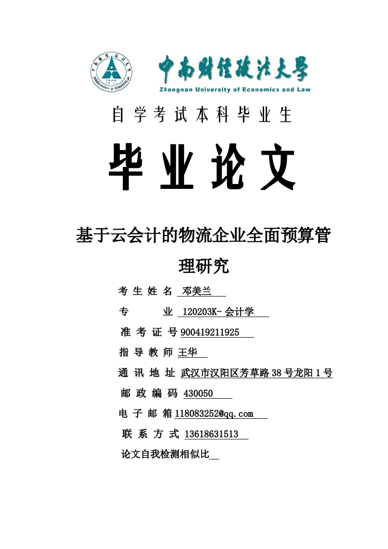 Zhongnan University of Economics and Law自学考试本科毕业生毕业论文基于云会计的物流企业全面预算管理研究考生姓名邓美兰专业120203K-会计学准考证号900419211925指导教师王华通讯地址武汉市汉阳区芳草路38号龙阳1号邮政编码430050电子邮箱1180832520gq.com联系方式13618631513论文自我检测相似比二0二二年一月毕业论文原创性声明本人郑重声明:在这篇论文的展示中,我是在导师的指导下进行个独立的完成,这篇论文有部分内容是引用的,已标注明。这篇毕业论文没有抄袭别人或编写研究人员的成果。已有清晰的形式书写。本人完全意识到本声明的法律结果由本人承担。论文作者签名:邓美兰2022年1月15日