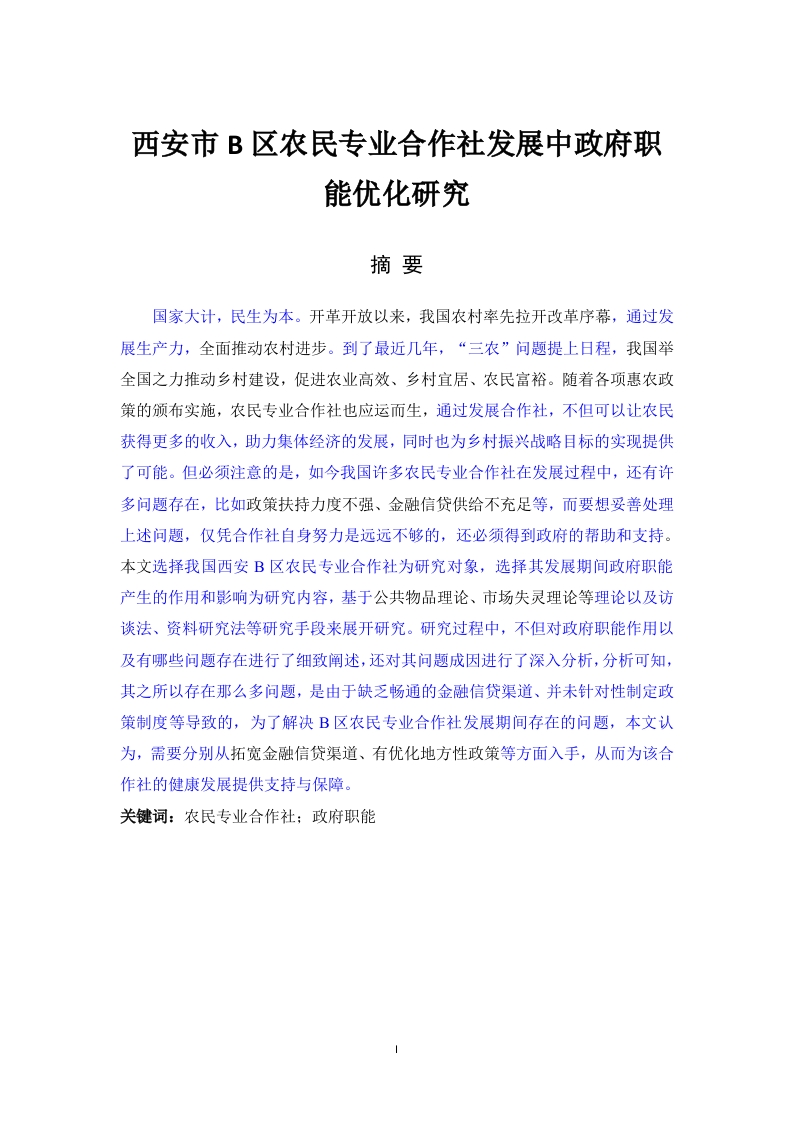 西安市B区农民专业合作社发展中政府职能优化研究摘要国家大计,民生为本。开革开放以来,我国农村率先拉开改革序幕,通过发展生产力,全面推动农村进步。到了最近几年,“三农”问题提上日程,我国举全国之力推动乡村建设,促进农业高效、乡村宜居、农民富裕。随着各项惠农政策的颁布实施,农民专业合作社也应运而生,通过发展合作社,不但可以让农民获得更多的收入,助力集体经济的发展,同时也为乡村振兴战略目标的实现提供了可能。但必须注意的是,如今我国许多农民专业合作社在发展过程中,还有许多问题存在,比如政策扶持力度不强、金融信贷供给不充足等,而要想妥善处理上述问题,仅凭合作社自身努力是远远不够的,还必须得到政府的帮助和支持。本文选择我国西安B区农民专业合作社为研究对象,选择其发展期间政府职能产生的作用和影响为研究内容,基于公共物品理论、市场失灵理论等理论以及访谈法、资料研究法等研究手段来展开研究。研究过程中,不但对政府职能作用以及有哪些问题存在进行了细致阐述,还对其问题成因进行了深入分析,分析可知,其之所以存在那么多问题,是由于缺乏畅通的金融信贷渠道、并未针对性制定政策制度等导致的,为了解决B区农民专业合作社发展期间存在的问题,本文认为,需要分别从拓宽金融信贷渠道、有优化地方性政策等方面入手,从而为该合作社的健康发展提供支持与保障。关键词:农民专业合作社:政府职能ABSTRACTThe national plan is based on the people's livelihood.Since the reform andopening up,China's rural areas have taken the lead in opening up the reform,andcomprehensively promote rural progress through the development of productiveforces.In recent years,the issue of"rural prosperity and high efficiency"has been puton the agenda of promoting the construction of rural areas,rural areas and farmers inChina.With the promulgation and implementation of various preferential policies foragriculture,farmers'professional cooperatives also came into being.Through thedevelopment of cooperatives,farmers can not only obtain more income and help thedevelopment of collective economy,but also provide the possibility for the realizationof the strategic goal of Rural Revitalization.However,it must be noted that manyfarmers'professional cooperatives in China still have many problems in thedevelopment process,such as weak policy support and insufficient supply of financialcredit.In order to properly deal with the above problems,the efforts of cooperativesalone are far from enough,and they must also get the help and support of thegovernment.This paper selects the farmers'professional cooperatives in District B ofXi'an as the research object,selects the role and impact of government functionsduring its development as the research content,and carries out the research based onthe theories of public goods theory,market failure theory,interview method,dataresearch method and other research means.In the research process,not only thefunctions and functions of the government and the existing problems are described indetail,but also the causes of the problems are deeply analyzed.The analysis showsthat there are so many problems due to the lack of smooth financial credit channelsand the lack of targeted policies and systems.In order to solve the problems existingduring the development of farmers'professional cooperatives in area B,This paperholds that it is necessary to broaden financial credit channels and optimize localpolicies,so as to provide support and guarantee for the healthy development of thecooperative.Key words:Farmers'Specialized cooperative;Government Functions目录摘要ABSTRACT…0第一章绪论1.1研究背景与研究意义1.1.1研究背景1.1.2研究意义…1.2国内外文献综述1.2.1国外文献综述21.2.2国内研究综述41.2.3国内外文献述评71.3研究目标、研究内容及拟解决的关键问题1.3.1研究目标….....00000000001.3.2研究内容…1.3.3拟解决的关键问题1.4研究方法与技术路线91.4.1研究方法91.4.2技术路线…1.5可能的创新点9第二章相关概念与理论基础112.1相关概念112.1.1地方政府.…2.1.2农民专业合作社112.1.3政府职能112.2理论基础.112.2.1公共物品理论122.2.2市场失灵理论122.2.3政府失灵理论第三章西安市B区农民专业合作社发展现状,.143.1西安市B区的基本情况..143.2西安市B区农民专业合作社发展概况,
