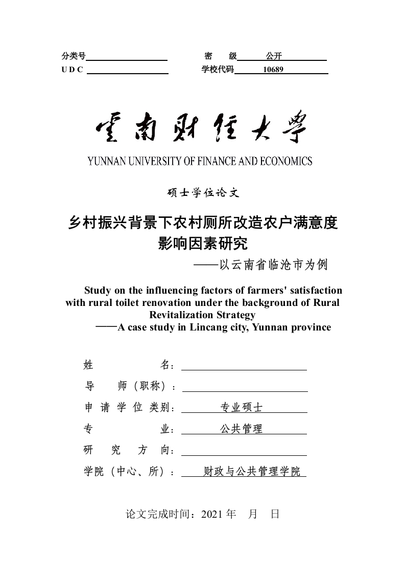 分类号密级公开UDC学校代码10689YUNNAN UNIVERSITY OF FINANCE AND ECONOMICS硕士学位论文乡村振兴背景下农村厕所改造农户满意度影响因素研究—以云南省临沧市为例Study on the influencing factors of farmers'satisfactionwith rural toilet renovation under the background of RuralRevitalization Strategy-A case study in Lincang city,Yunnan province姓导申请学位类别:专业硕士专业:公共管理研究方向:学院(中心、所):财政与公共管理学院论文完成时间:2021年月日学位论文原创性申明声明:本人所呈交的学位论文,是本人在导师的指导下,独立进行研究工作所取得的成果。尽我所知,除文中己经注明引用的内容外,本论文不含任何其他个人或集体已经发表或撰写过的作品成果。对本文的研究做出重要贡献的个人和集体,均己在文中以明确方式标明。本人完全意识到本声明的法律后果由本人承担。论文作者签名:日期:年月日学位论文版权使用授权书本人完全了解云南财经大学有关保留、使用学位论文的规定,即:学校有权保留并向国家有关部门或机构送交论文和论文电子版,允许学位论文被查阅或借阅;学校可以公布学位论文的全部或部分内容,可以采用影印、缩印或其他复制手段保存、汇编、发表学位论文;授权学校将学位论文的全文或部分内容编入、提供有关数据库进行检索。(保留的学位论文在解密后遵循此规定)论文作者签名:导师签名:日期:年月日日期:年月日摘要小厕所,大民生。当前我国要实现乡村振兴战略,必须做好农村厕改工作。虽然厕所改造工作已取得阶段性成效,但是在厕所改造过程中,出现终端使用者满意度低、设计缺陷、建设质量差、管理维护不到位、监督机制不健全等非预期问题。因此,聚焦厕所改造的非预期问题,从农村厕所改造农户满意度的视角出发,进一步探究农村公共服务能力问题,不仅具有理论意义,更具实践价值。已有文献大多是农村厕所改造现状、问题、对策的描述性研究,从农村厕所改造后的农户主观满意度角度去分析改厕效果影响因素没有引起研究者的充分注意。农户是厕所改造的参与者与使用者,本文以厕所改造农户满意度来表征农村厕所改造效果。进一步地,本文的研究问题是,影响农村厕所改造农户满意度的因素有哪些?以及如何提高农户满意度和改善农村厕所改造绩效?基于既往文献,本文梳理出影响厕所改造农户满意度的8个核心变量,即厕所结构、厕所配套设施、厕改的质效、政策支持、使用感知、后期维护、农户改厕成本、农户认知,据此构建了涵盖39个题项的指标体系,以云南省临沧市494户农民为研究对象,并利用结构方程模型进行分析。研究发现:改厕满意度的直接影响因素有六项,比如农民认知、厕所结构等。而其间接影响因素只有两项,一个是厕改成本;一个是政策支持情况。此次在以农村厕改效果为研究对象,以其影响因素为研究内容展开研究之时,发现国家政策并不是其唯一的影响因素,技术条件(厕所结构、厕所配套设施、厕改的质效)、治理条件(后期维护)和农户的心理因素(使用感知和农民认知)也会产生重要影响。这使相关的政策建议更具针对性:一是抓好农村厕所建设:二是完善农村厕所管护:三是加强农户思想认识。关键词:农村厕所改造:农户满意度:影响因素:结构方程:对策研究