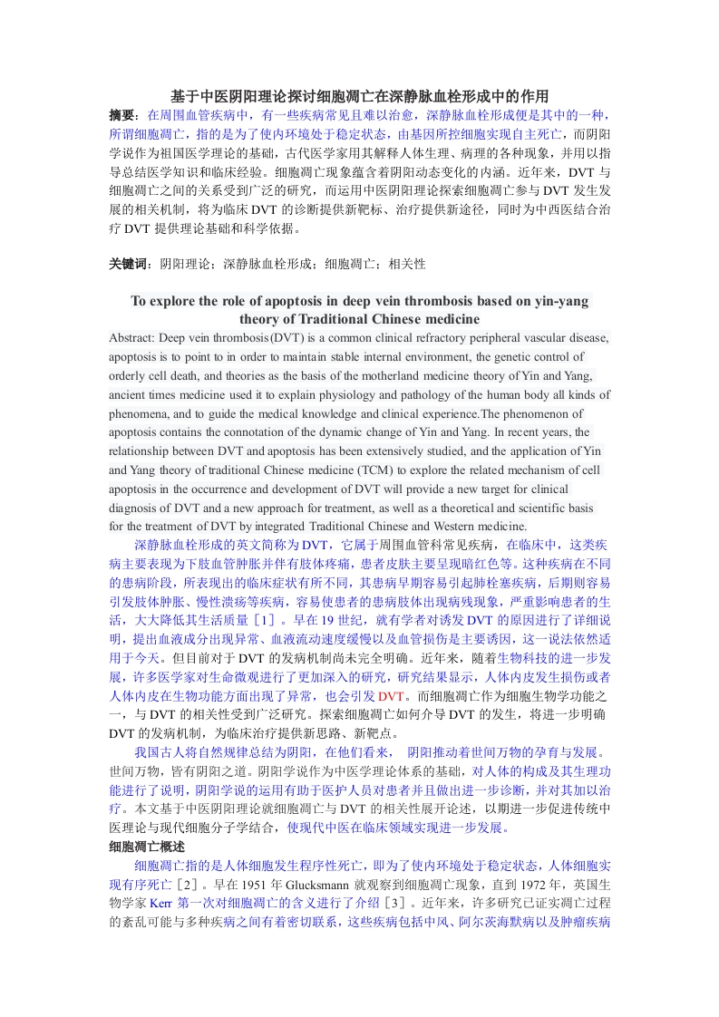 基于中医阴阳理论探讨细胞凋亡在深静脉血栓形成中的作用摘要:在周围血管疾病中,有一些疾病常见且难以治愈,深静脉血栓形成便是其中的一种,所谓细胞调亡,指的是为了使内环境处于稳定状态,由基因所控细胞实现自主死亡,而阴阳学说作为祖国医学理论的基础,古代医学家用其解释人体生理、病理的各种现象,并用以指导总结医学知识和临床经验。细胞调亡现象蕴含着阴阳动态变化的内涵。近年来,DVT与细胞调亡之间的关系受到广泛的研究,而运用中医阴阳理论探索细胞调亡参与DVT发生发展的相关机制,将为临床DVT的诊断提供新靶标、治疗提供新途径,同时为中西医结合治疗DVT提供理论基础和科学依据。关键词:阴阳理论:深静脉血栓形成:细胞凋亡:相关性To explore the role of apoptosis in deep vein thrombosis based on yin-yangtheory of Traditional Chinese medicineAbstract:Deep vein thrombosis(DVT)is a common clinical refractory peripheral vascular disease,apoptosis is to point to in order to maintain stable internal environment,the genetic control oforderly cell death,and theories as the basis of the motherland medicine theory of Yin and Yang,ancient times medicine used it to explain physiology and pathology of the human body all kinds ofphenomena,and to guide the medical knowledge and clinical experience.The phenomenon ofapoptosis contains the connotation of the dynamic change of Yin and Yang.In recent years,therelationship between DVT and apoptosis has been extensively studied,and the application of Yinand Yang theory of traditional Chinese medicine (TCM)to explore the related mechanism of cellapoptosis in the occurrence and development of DVT will provide a new target for clinicaldiagnosis of DVT and a new approach for treatment,as well as a theoretical and scientific basisfor the treatment of DVT by integrated Traditional Chinese and Western medicine.深静脉血栓形成的英文简称为DVT,它属于周围血管科常见疾病,在临床中,这类疾病主要表现为下肢血管肿胀并伴有肢体疼痛,患者皮肤主要呈现暗红色等。这种疾病在不同的患病阶段,所表现出的临床症状有所不同,其患病早期容易引起肺栓塞疾病,后期则容易引发肢体肿胀、慢性溃疡等疾病,容易使患者的患病肢体出现病残现象,严重影响患者的生活,大大降低其生活质量[1]。早在19世纪,就有学者对诱发DVT的原因进行了详细说明,提出血液成分出现异常、血液流动速度缓慢以及血管损伤是主要诱因,这一说法依然适用于今天。但目前对于DVT的发病机制尚未完全明确。近年来,随着生物科技的进一步发展,许多医学家对生命微观进行了更加深入的研究,研究结果显示,人体内皮发生损伤或者人体内皮在生物功能方面出现了异常,也会引发DVT。而细胞调亡作为细胞生物学功能之一,与DVT的相关性受到广泛研究。探索细胞调亡如何介导DVT的发生,将进一步明确DVT的发病机制,为临床治疗提供新思路、新靶点。我国古人将自然规律总结为阴阳,在他们看来,阴阳推动着世间万物的孕育与发展。世间万物,皆有阴阳之道。阴阳学说作为中医学理论体系的基础,对人体的构成及其生理功能进行了说明,阴阳学说的运用有助于医护人员对患者并且做出进一步诊断,并对其加以治疗。本文基于中医阴阳理论就细胞调亡与DVT的相关性展开论述,以期进一步促进传统中医理论与现代细胞分子学结合,使现代中医在临床领域实现进一步发展。细胞凋亡概述细胞调亡指的是人体细胞发生程序性死亡,即为了使内环境处于稳定状态,人体细胞实现有序死亡[2]。早在1951年Glucksmann就观察到细胞调亡现象,直到1972年,英国生物学家Kr第一次对细胞凋亡的含义进行了介绍[3]。近年来,许多研究已证实调亡过程的紊乱可能与多种疾病之间有着密切联系,这些疾病包括中风、阿尔茨海默病以及肿瘤疾病等[4]。细胞发生调亡时,细胞核会出现碎裂和固缩现象,其DNA也会呈现出片段性特征,大生物分子也会逐渐合成[5]。复杂性是细胞调亡的突出特征,其在调亡的过程中需要进行精确调控,在这一过程中,蛋白酶依赖分子也会发生级联反应。常见细胞调亡途径主要有二,一是内源性信号通路,二是外源性(死亡受体介导调亡)信号通路[6]。其中,前一作用产生于对Bcl-2蛋白家族的进一步调节,常见的BCl-2蛋白包括BAGA、Bcl-XL等,能够推动细胞调亡的物质有Bax、Bid、Bak、Bad、Bcl-10、Bim等[7,8]。前者的作用机制是对线粒体膜通透特征加以控制,来调节细胞色素C(Cytochrome C,CytC)的释放[9].上述释放物通过与凋亡的蛋白酶活性因子(Apoptosis protease activating factor,.Apaf-1)和Caspase-9的进一步结合形成“调亡小体”,进而使细胞发生调亡[l0]。后者能够推动蛋白彼此作用,这些蛋白质主要形成于跨膜受体的介导作用,其中最详细的信号通路模型为Fas模型与FasL模型,其激活形式就是将FasL同Fas相结合,当Fas模型被活化之后,受体能在DD作用下对FADD以及半胱天冬酶8酶原进行招募,进而构成DISC,在此之后,下游领域中的Caspase因子能够被有效激活,在这种条件下,Caspase酶会发生级联反应,进而引发细胞调亡[11]。与死亡受体通路以及线粒体通路有所不同,内质网应激通路是一种新型通路,在其独立诱导之下,会出现细胞凋亡现象。但是,如果内质网对UPR进行了有效激活,UPR能够对细胞进行双向调节,既有助于细胞生存,也能使其发生凋亡,这一作用同NK通路、Ca2浓度等参数调节之间的联系十分紧密[12]。阴阳学说与细胞凋亡阴阳慨念源于《易经》的八卦和六十