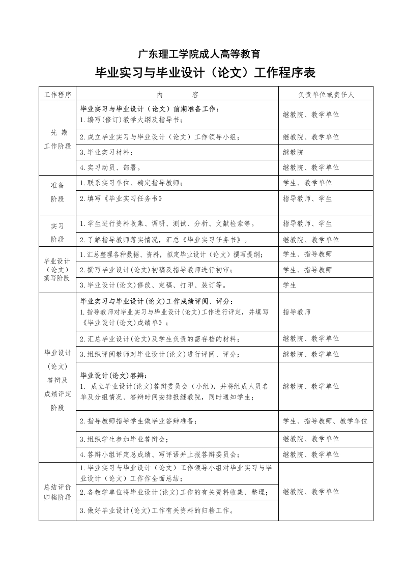 广东理工学院成人高等教育毕业实习与毕业设计(论文)工作程序表工作程序内容负责单位或责任人毕业实习与毕业设计(论文)前期准备工作:1.编写(修订)教学大纲及指导书:继教院、教学单位先期2.成立毕业实习与毕业设计(论文)工作领导小组:继教院、教学单位工作阶段3.毕业实习材料:继教院4.实习动员、部署。继教院、教学单位准备1.联系实习单位、确定指导教师:学生、教学单位阶段2.填写《毕业实习任务书》指导教师、学生实习1.学生进行资料收集、调研、测试、分析、文献检索等。指导教师、学生阶段2.了解指导教师落实情况,汇总《毕业实习任务书》。继教院、教学单位1.汇总整理各种数据、资料,拟定毕业设计(论文)撰写提纲:学生、指导教师毕业设计(论文)2.撰写毕业设计(论文)初稿及指导教师进行初审:学生、指导教师撰写阶段3.毕业设计(论文)修改、定稿、打印、装订等。学生毕业实习与毕业设计(论文)工作成绩评阅、评分:1.指导教师对毕业实习与毕业设计(论文)工作进行评定,并填写指导教师《毕业设计(论文)成绩单》;2.汇总毕业设计(论文)及学生负责的需存档的材料:继教院、教学单位毕业设计3.组织评阅教师对毕业设计(论文)进行评阅、评分;继教院、教学单位(论文)答辩及毕业设计(论文)答辩:1.成立毕业设计(论文)答辩委员会(小组,并将组成人员名继教院、教学单位成绩评定单及分组情况、答辩时间安排报继教院,同时通知学生:阶段2.指导教师指导学生做毕业答辩准备:学生、指导教师、教学单位3.组织学生参加毕业答辩会;继教院、教学单位4.答辩小组评定总成绩、写评语并上报答辩委员会;继教院、教学单位1.毕业实习与毕业设计(论文)工作领导小组对毕业实习与毕业设计(论文)工作作全面总结;总结评价2.各教学单位将毕业设计(论文)工作的有关资料收集、整理;继教院、教学单位归档阶段3.做好毕业设计(论文)工作有关资料的归档工作。