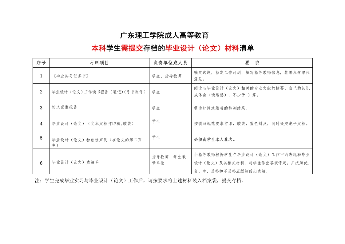 广东理工学院成人高等教育本科学生需提交存档的毕业设计(论文)材料清单序号材料项目负责单位或人员要求确定选题,拟定工作计划,填写指导教师信息,签署办学单位1《毕业实习任务书》学生、指导教师意见。阅读与毕业设计(论文)相关的专业文献的摘要、自己的认识2毕业设计(论文)工作读书报告(笔记)(手书原件)学生或体会(读后感),不少于3篇。3论文查重报告学生需为知网或维普的检测结果。学生4毕业设计(论文)(文本文档打印稿,胶装)按撰写规范要求打印,胶装,蓝色封皮,同时提交电子文档。5毕业设计(论文)独创性声明(在论文的第二页学生必须由学生本人签名。中)指导教师、学生教由指导教师根据学生在毕业设计(论文)工作中的表现和毕业6毕业设计(论文)成绩单学单位设计(论文)及其相关材料,对学生作出客观评定,并按照优、良、中、及格和不及格五级制给出成绩。注:学生完成毕业实习与毕业设计(论文)工作后,请按要求将上述材料装入档案袋,提交存档。